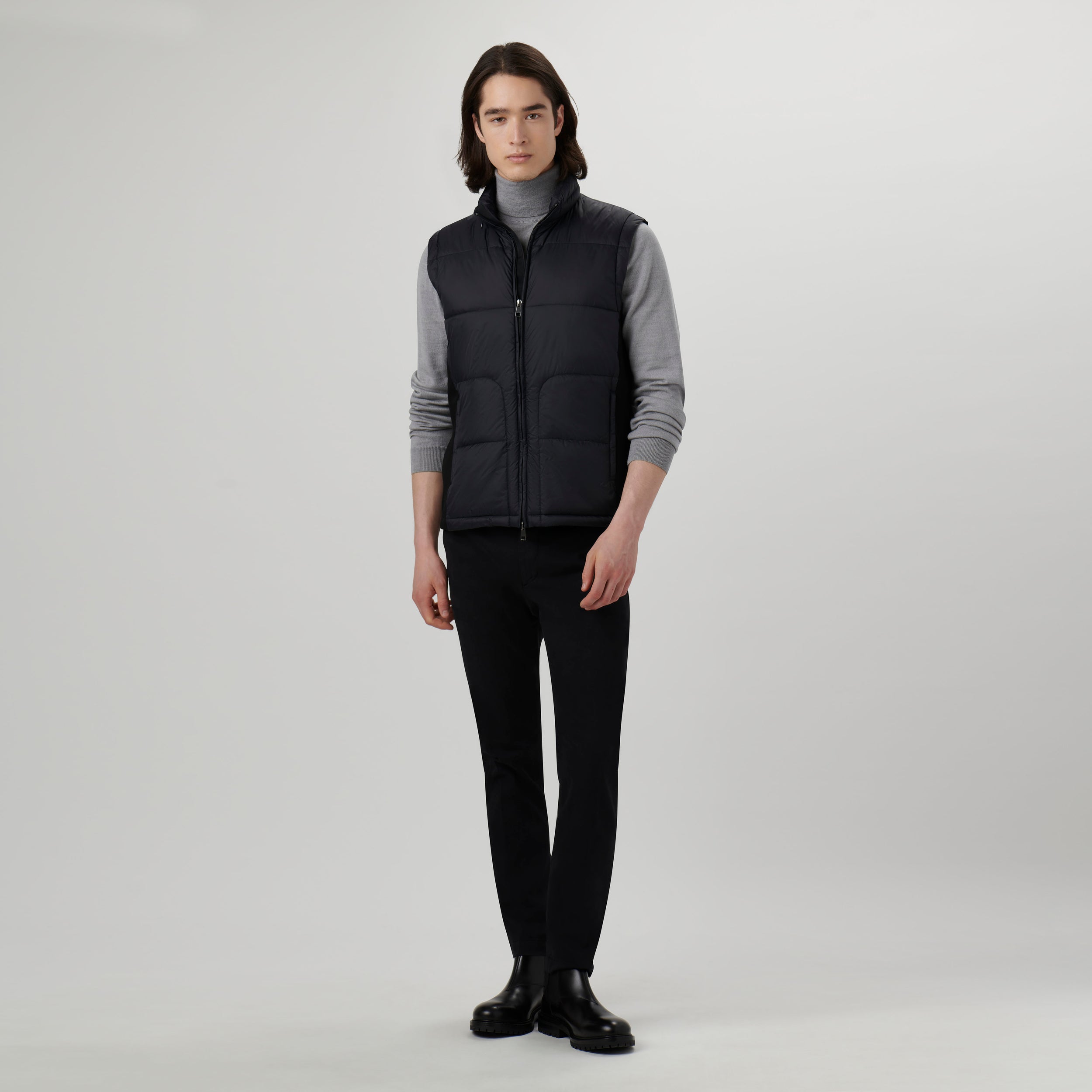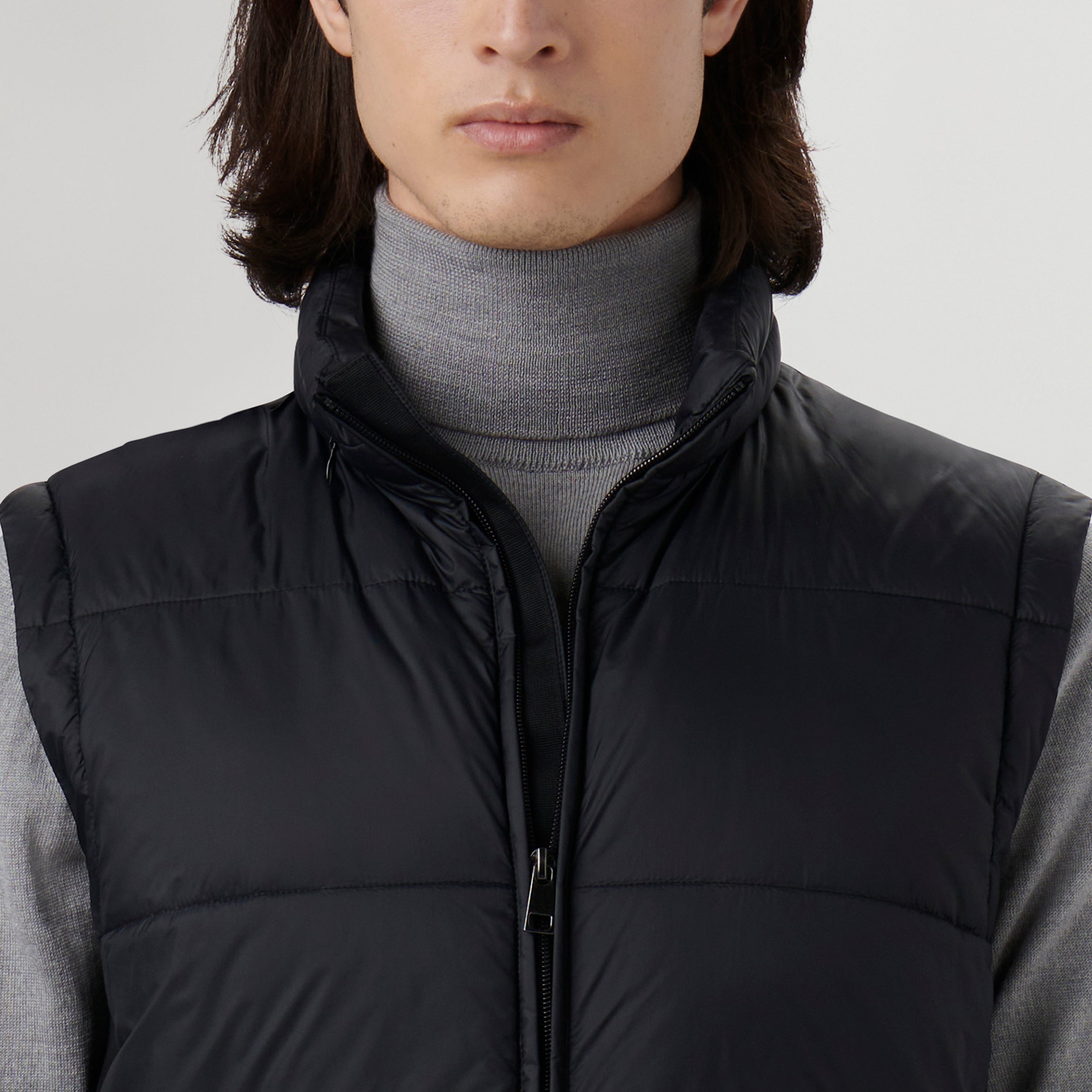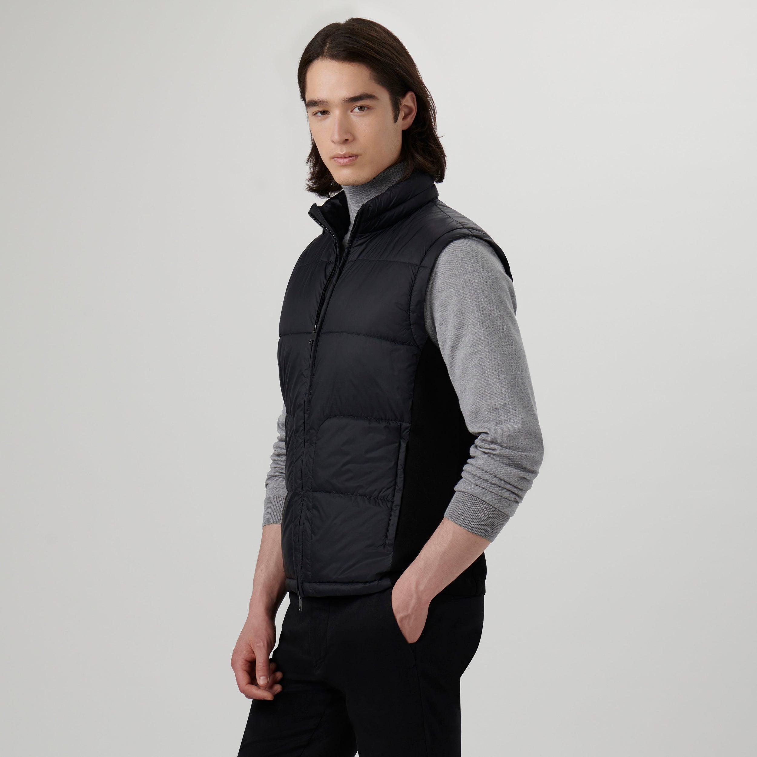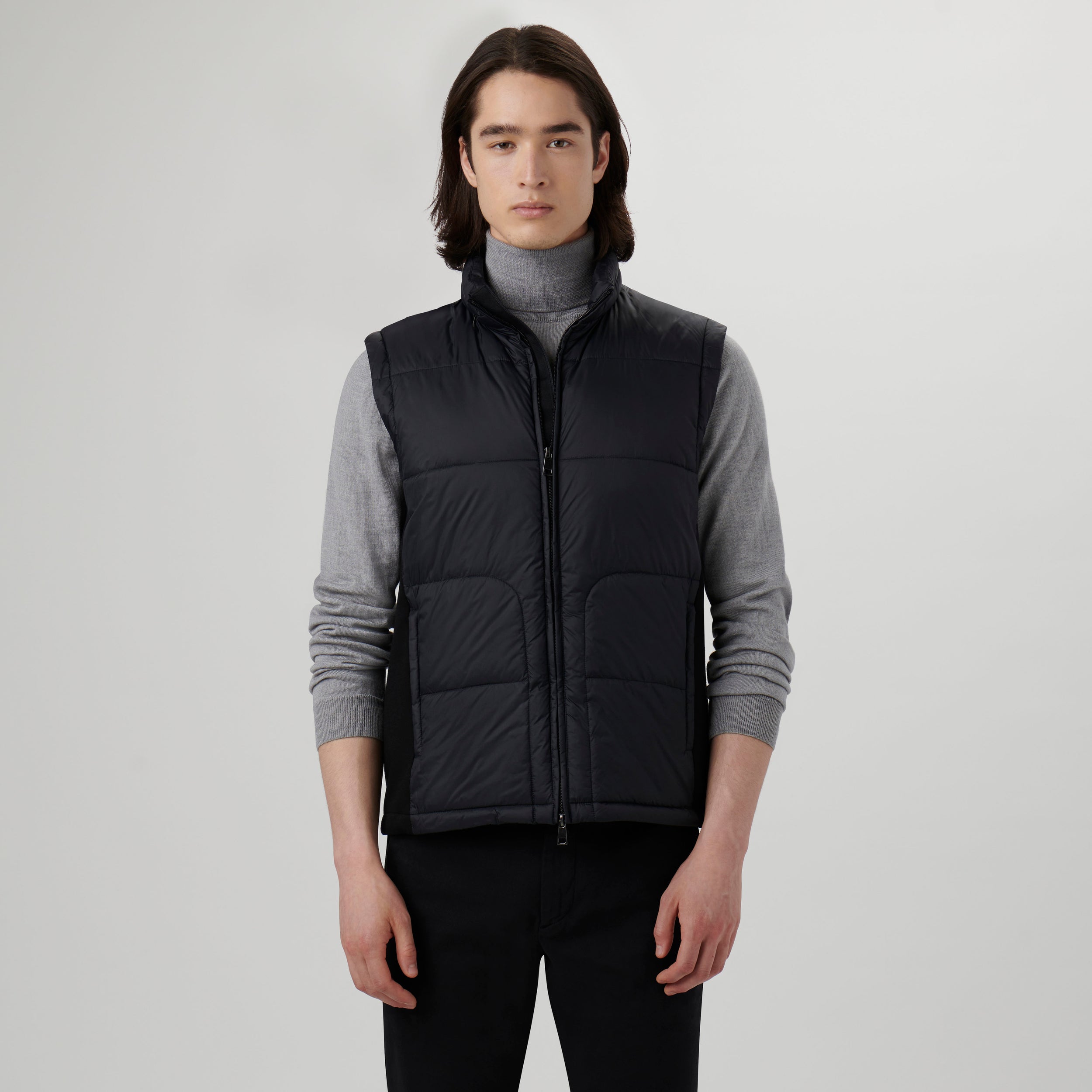 Water repellent quilted nylon vest with melange knit fabric back, padded high standing collar with stow-away hood, thermal insulation, two-way zipper closure and pockets.