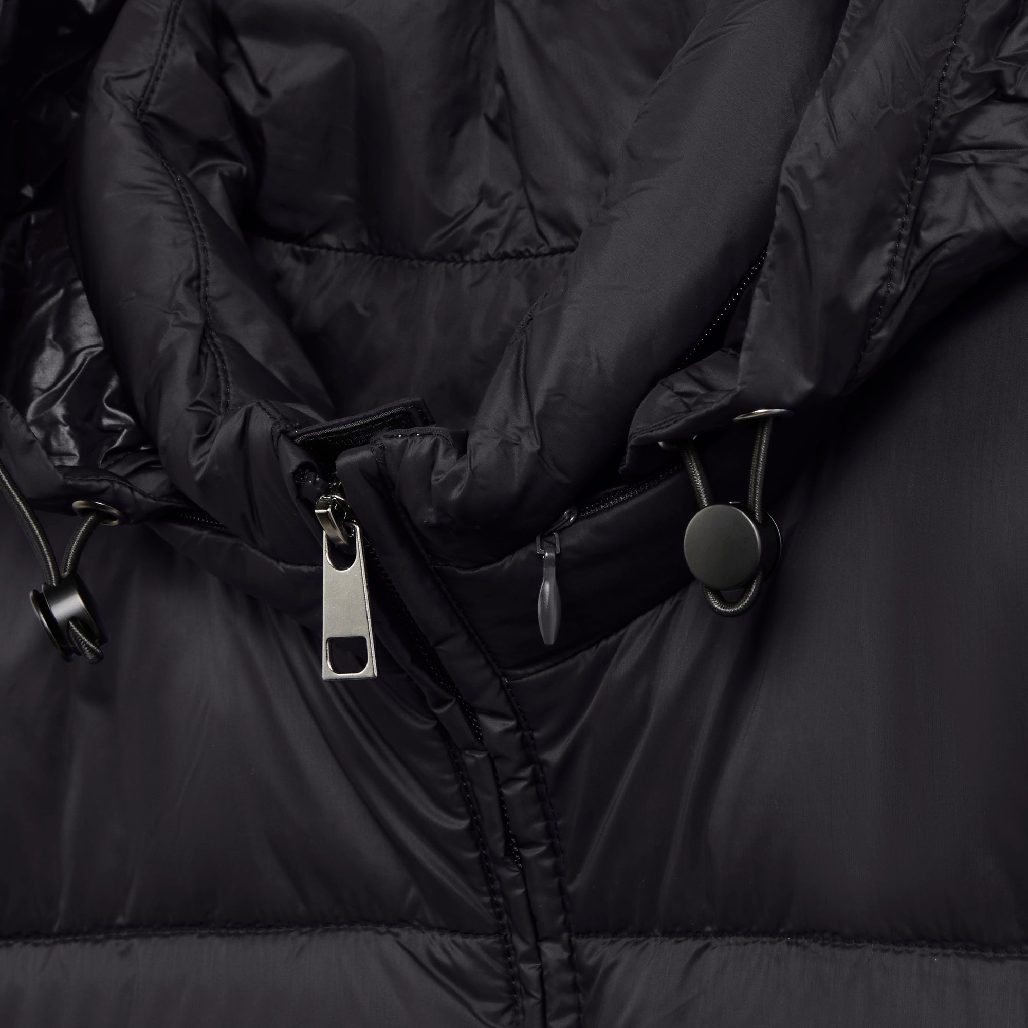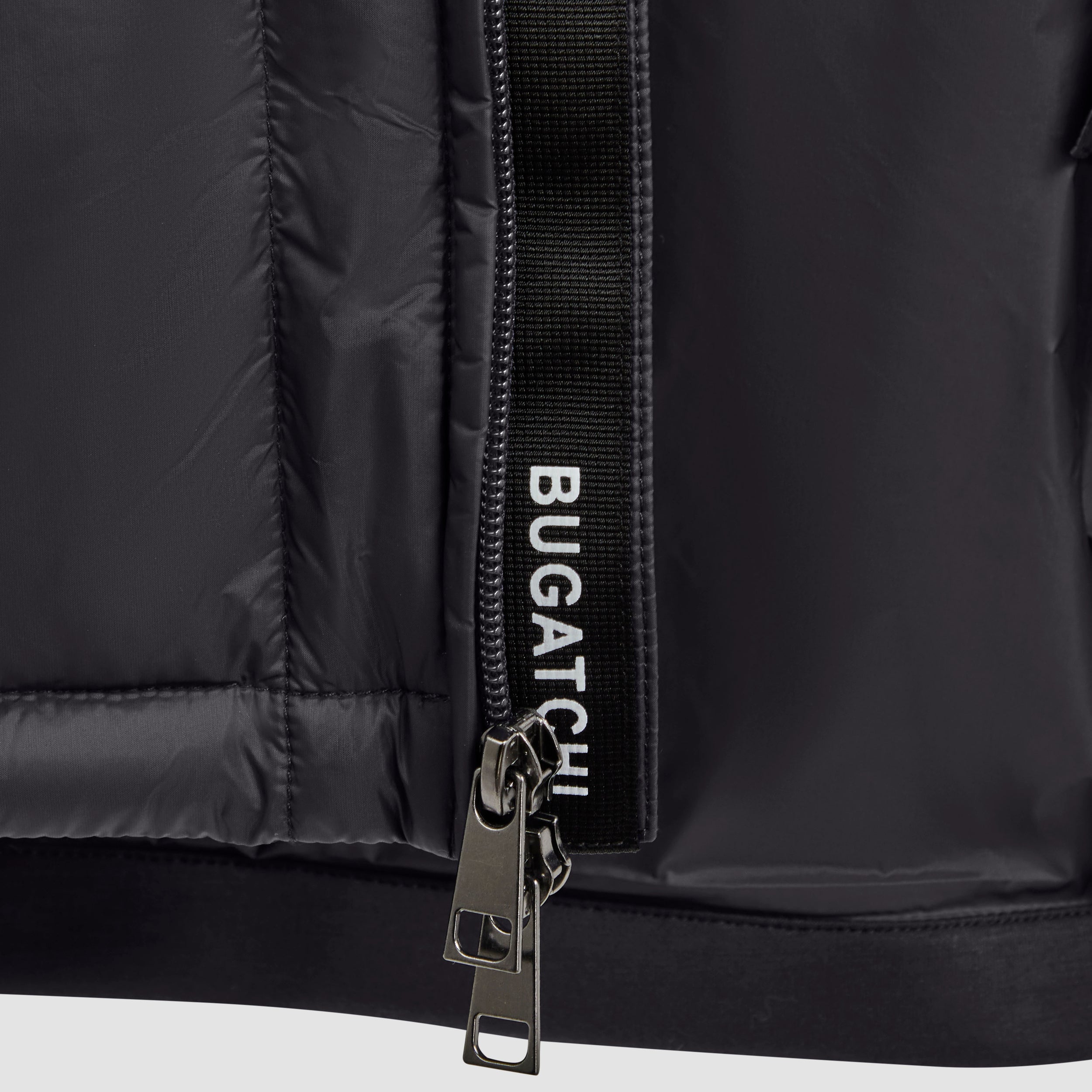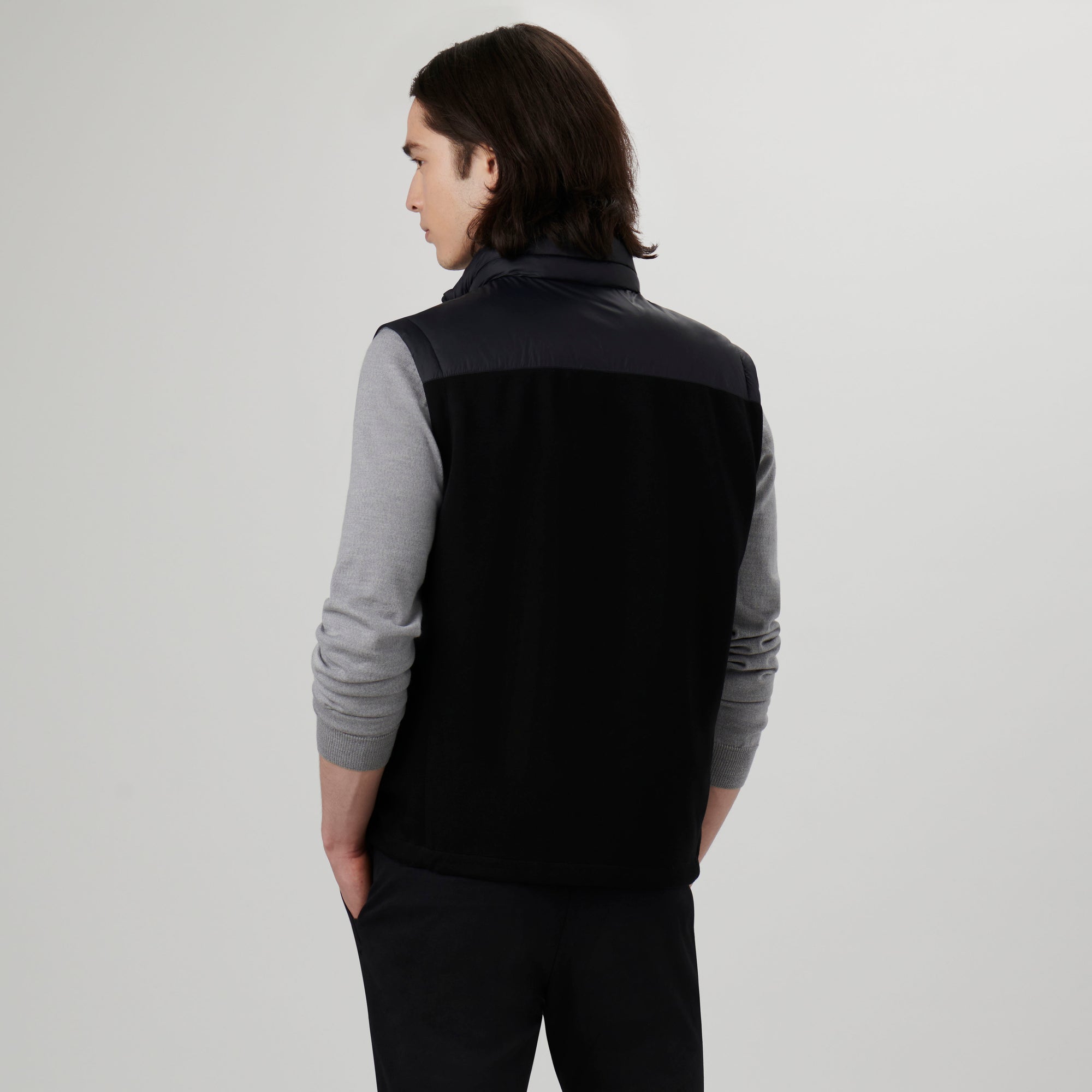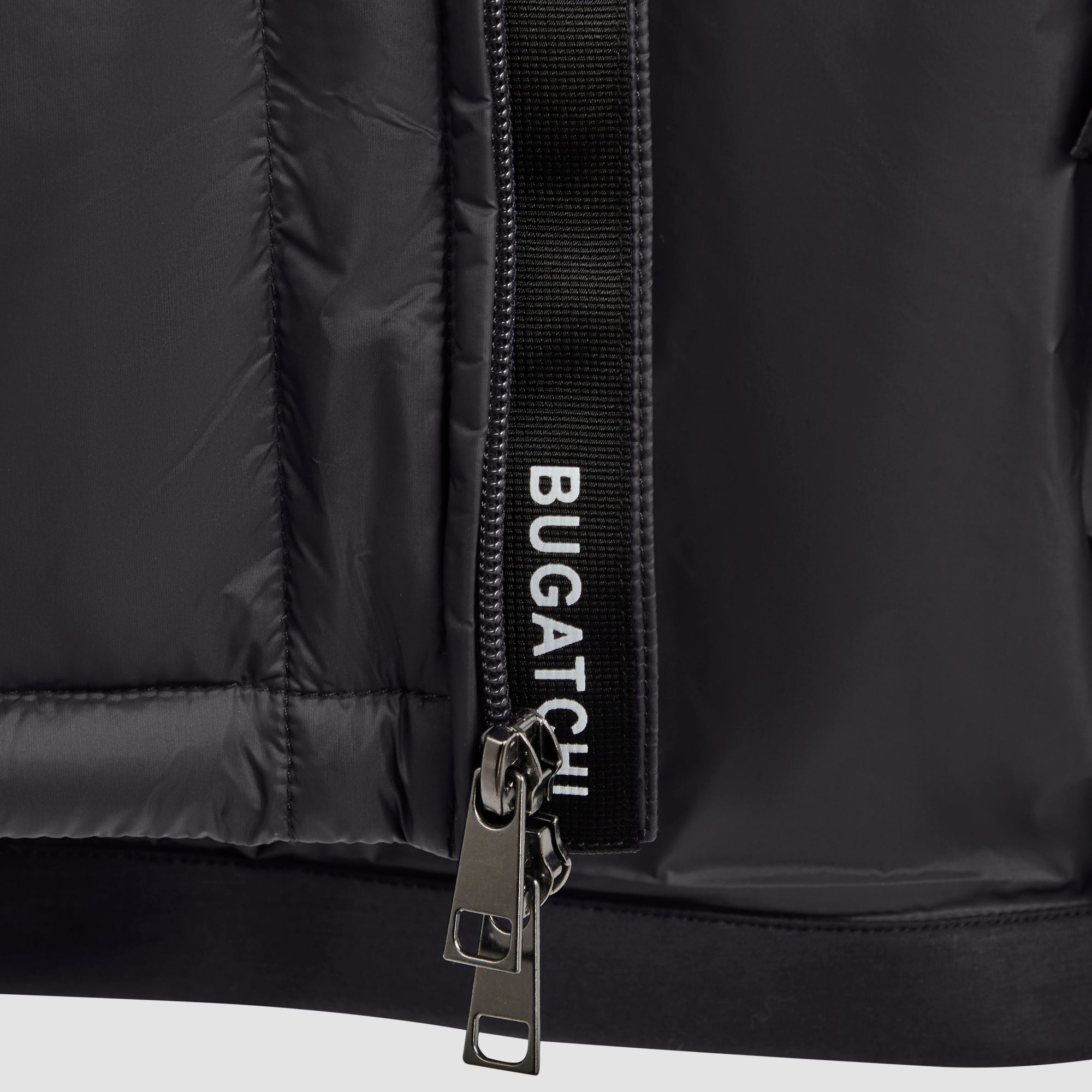 Water repellent quilted nylon vest with melange knit fabric back, padded high standing collar with stow-away hood, thermal insulation, two-way zipper closure and pockets.