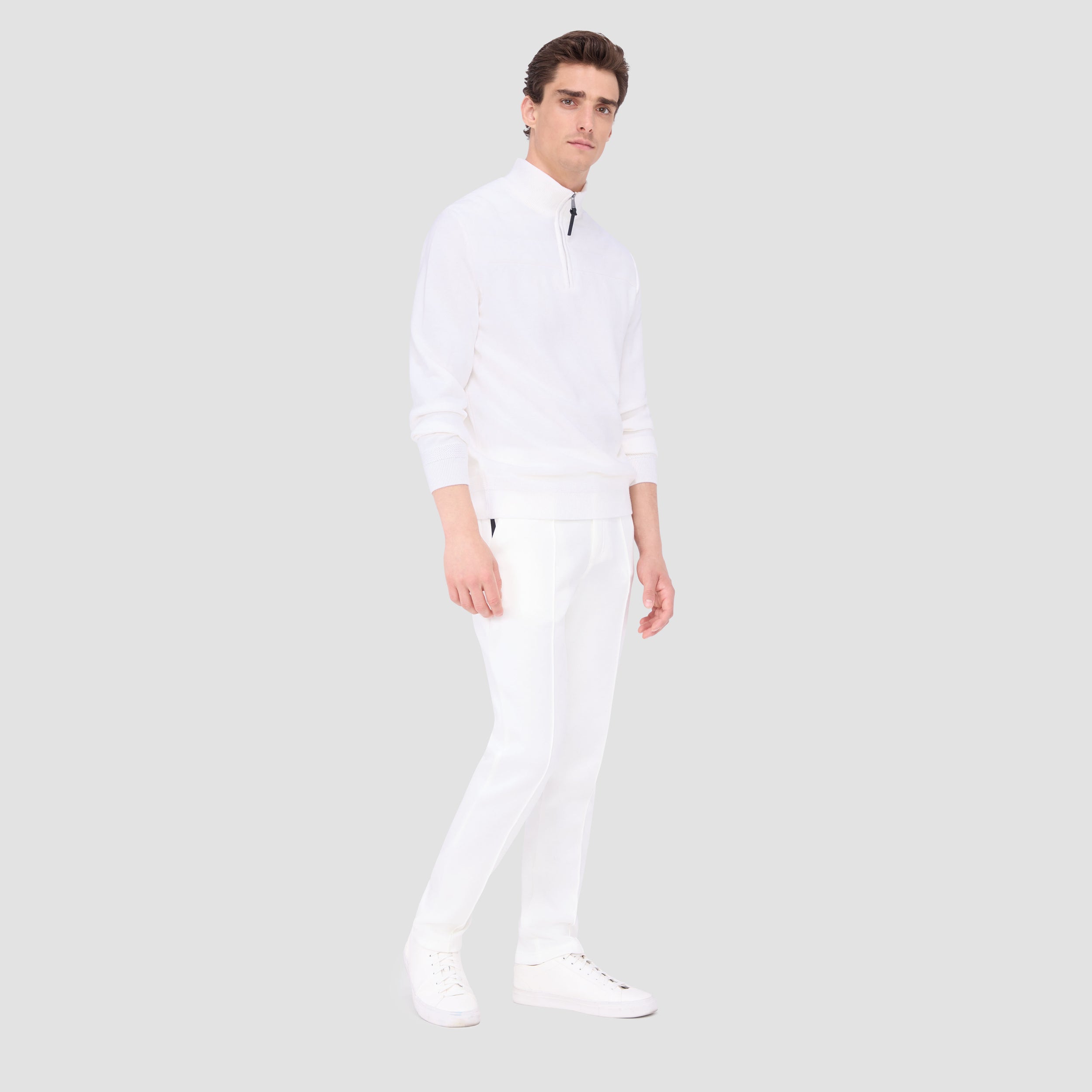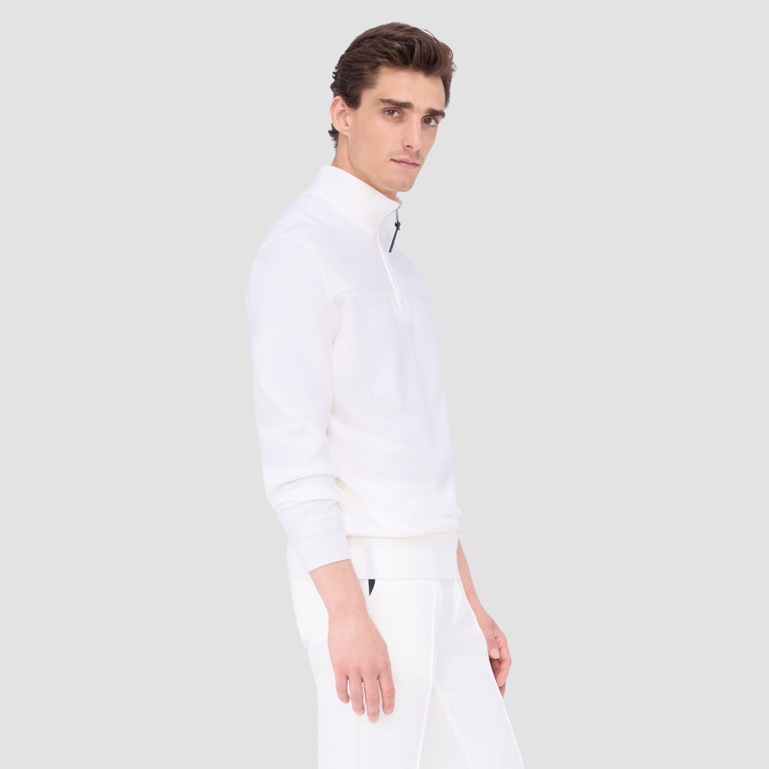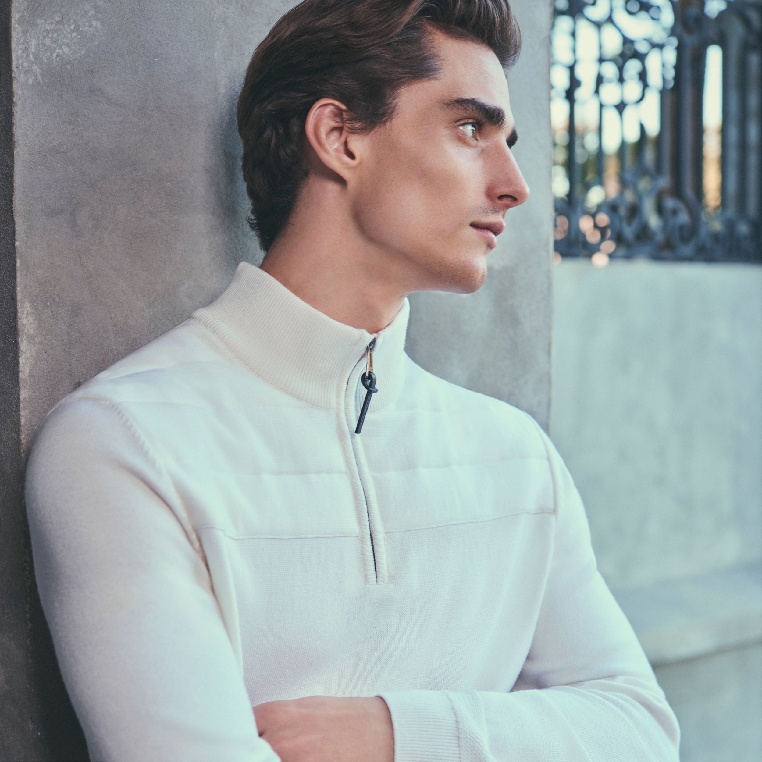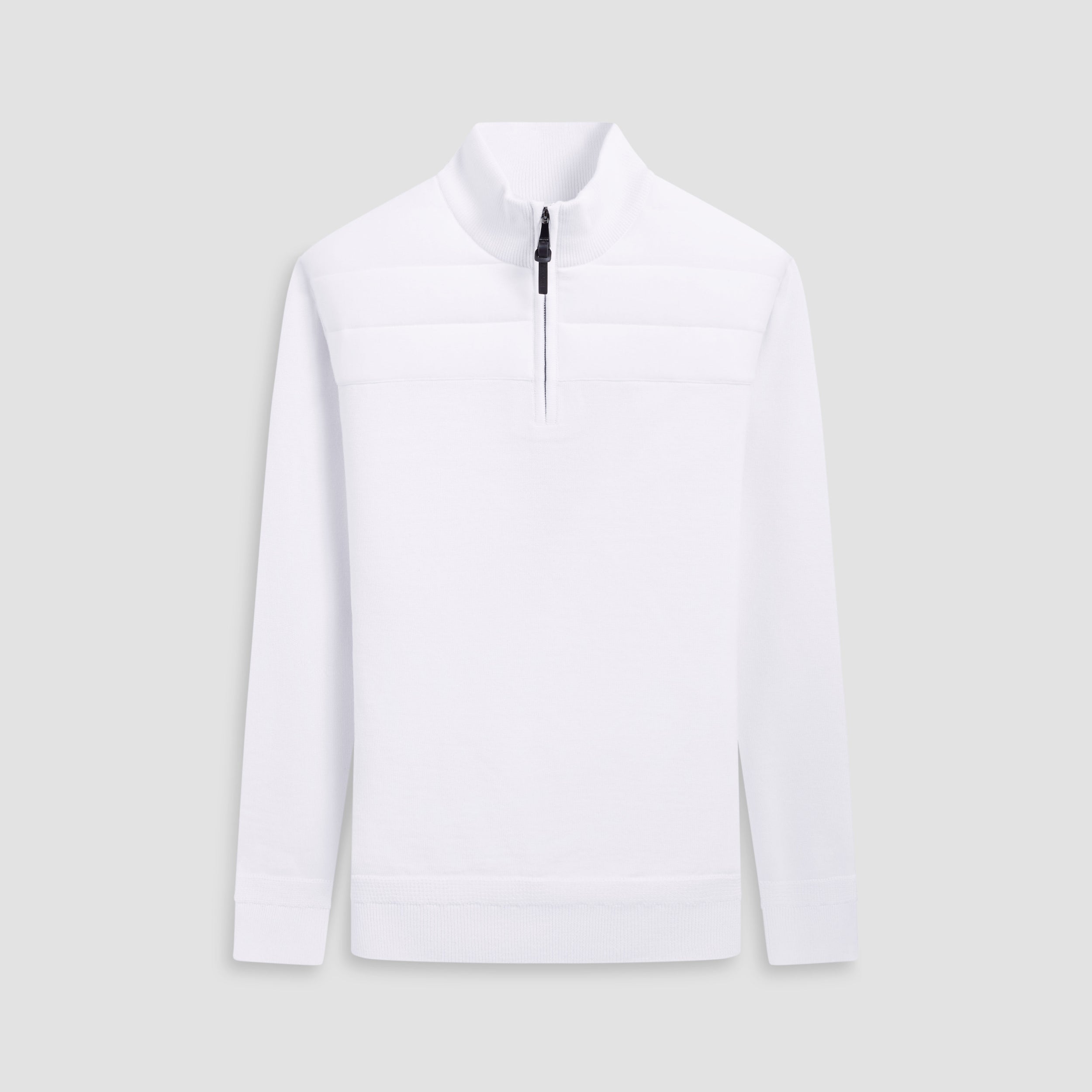 Crafted from 100% Merino wool, this quarter-zip mock neck sweater exudes elegance. Its solid construction ensures supreme softness and warmth, while quilted yoke detail adds refinement. Chevron-trimmed rib cuffs and hem provide stylish accents. Its meticulous craftsmanship sets it apart, promising sophistication for every occasion.