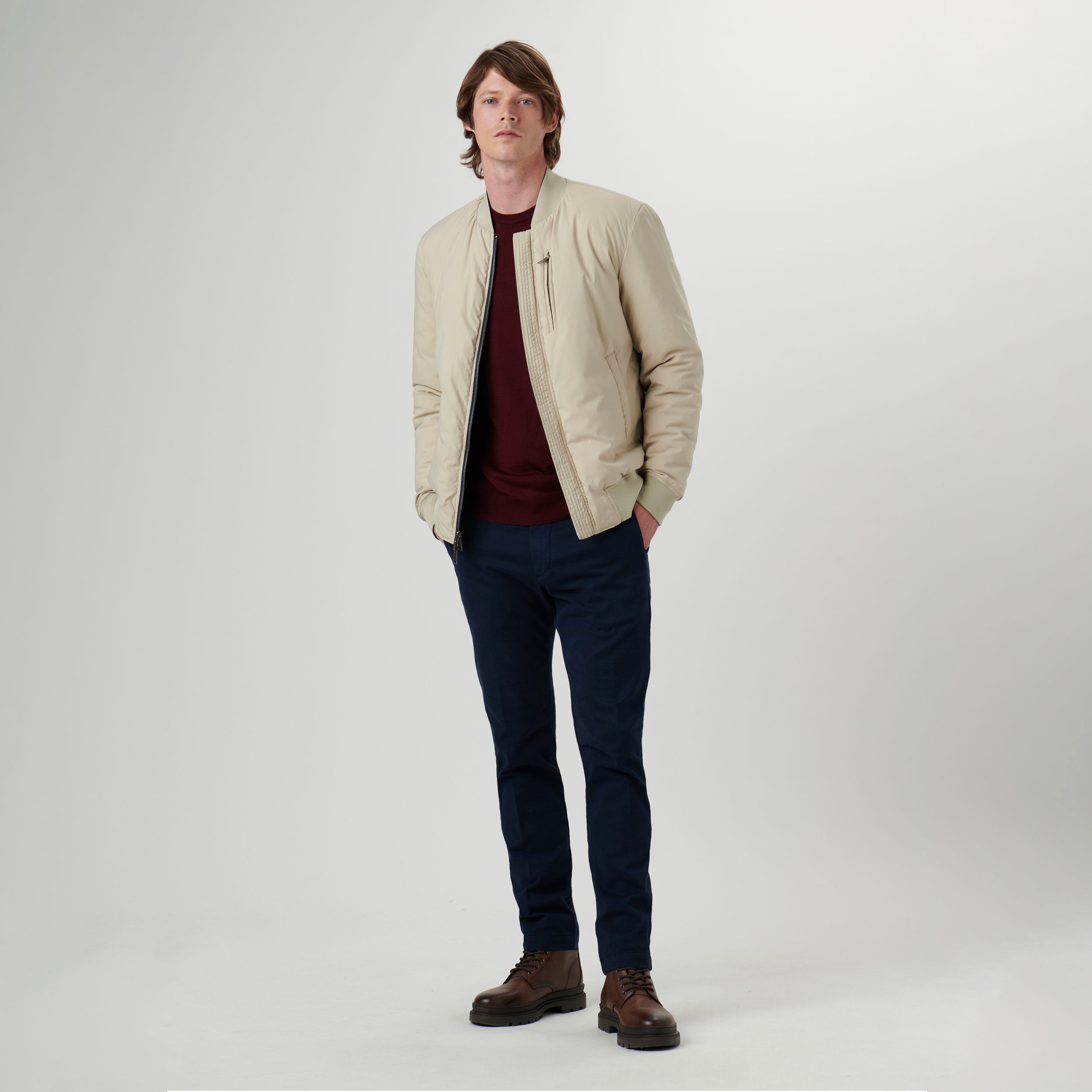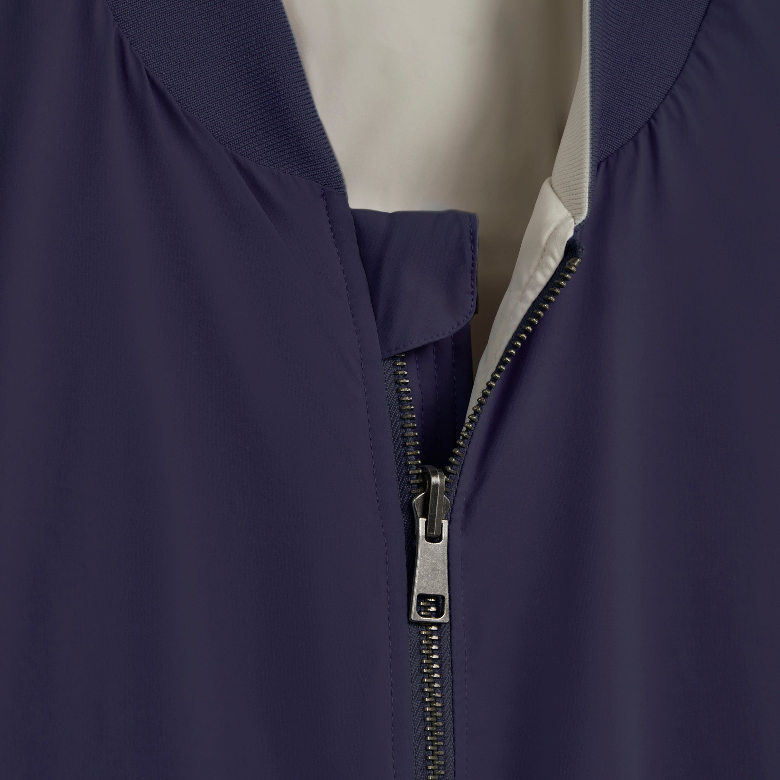Reversible blouson jacket in water repellent stretch nylon with two-way zipper closure, rib knit baseball collar, sleeve cuffs and waistband. Slanted front pockets on one side, zippered reese pocket on the flip side.