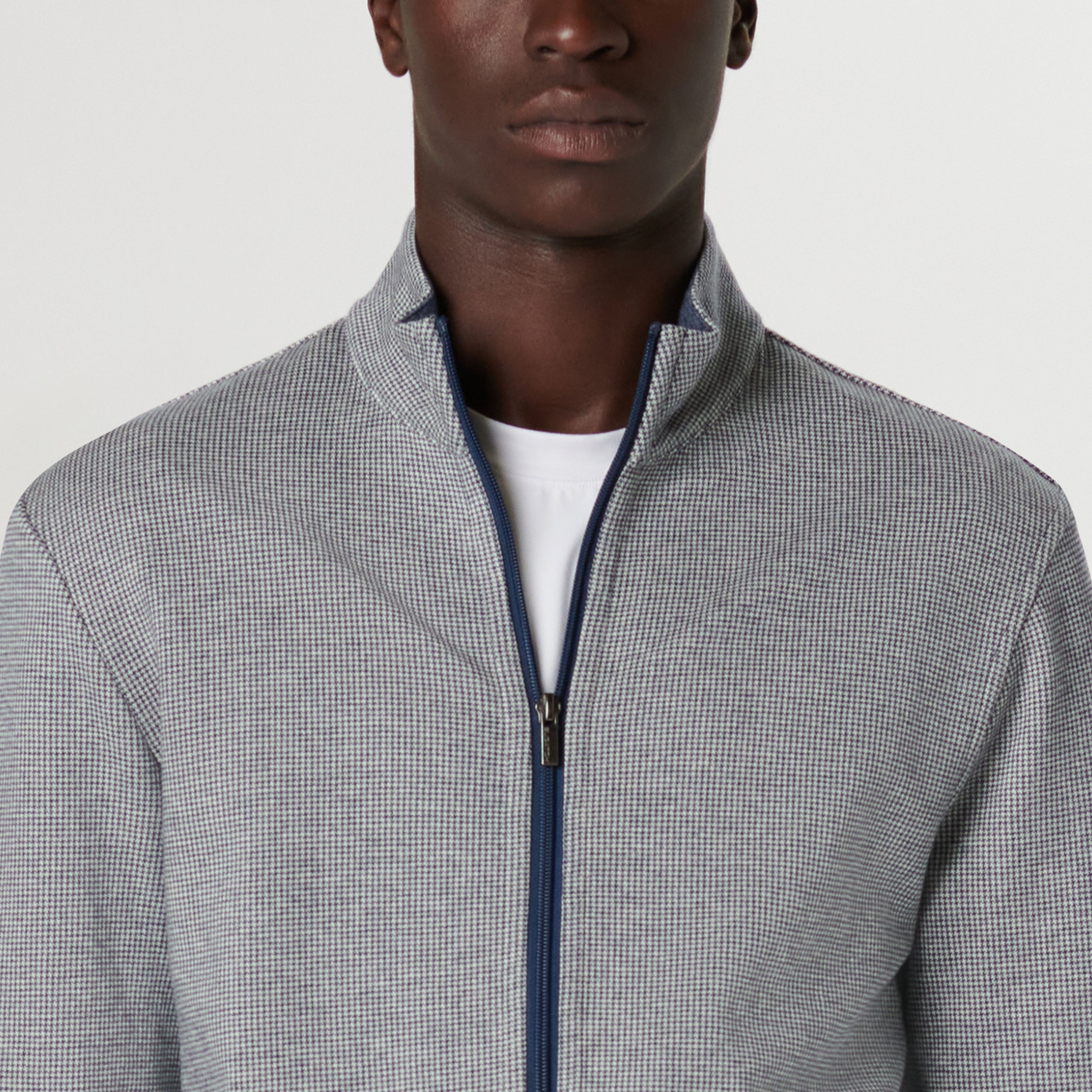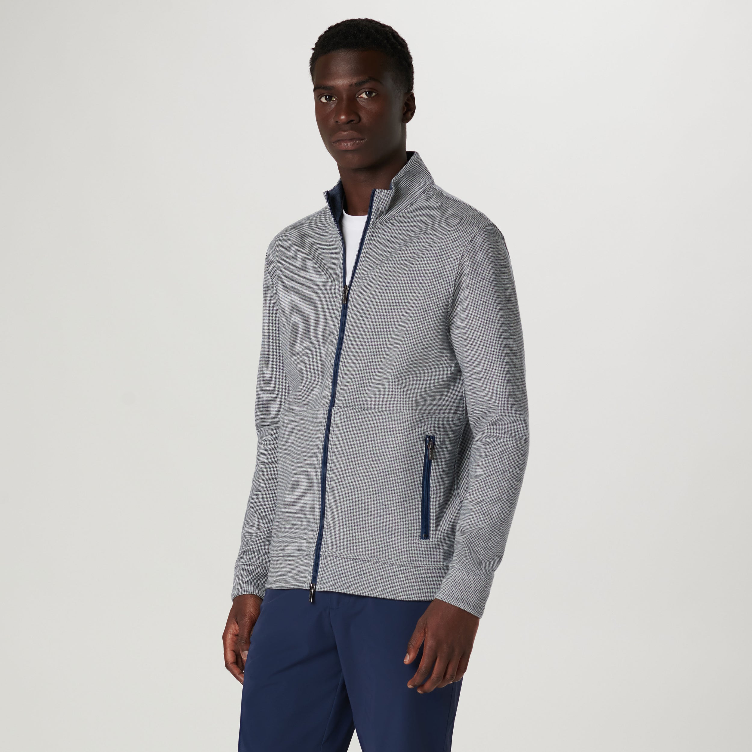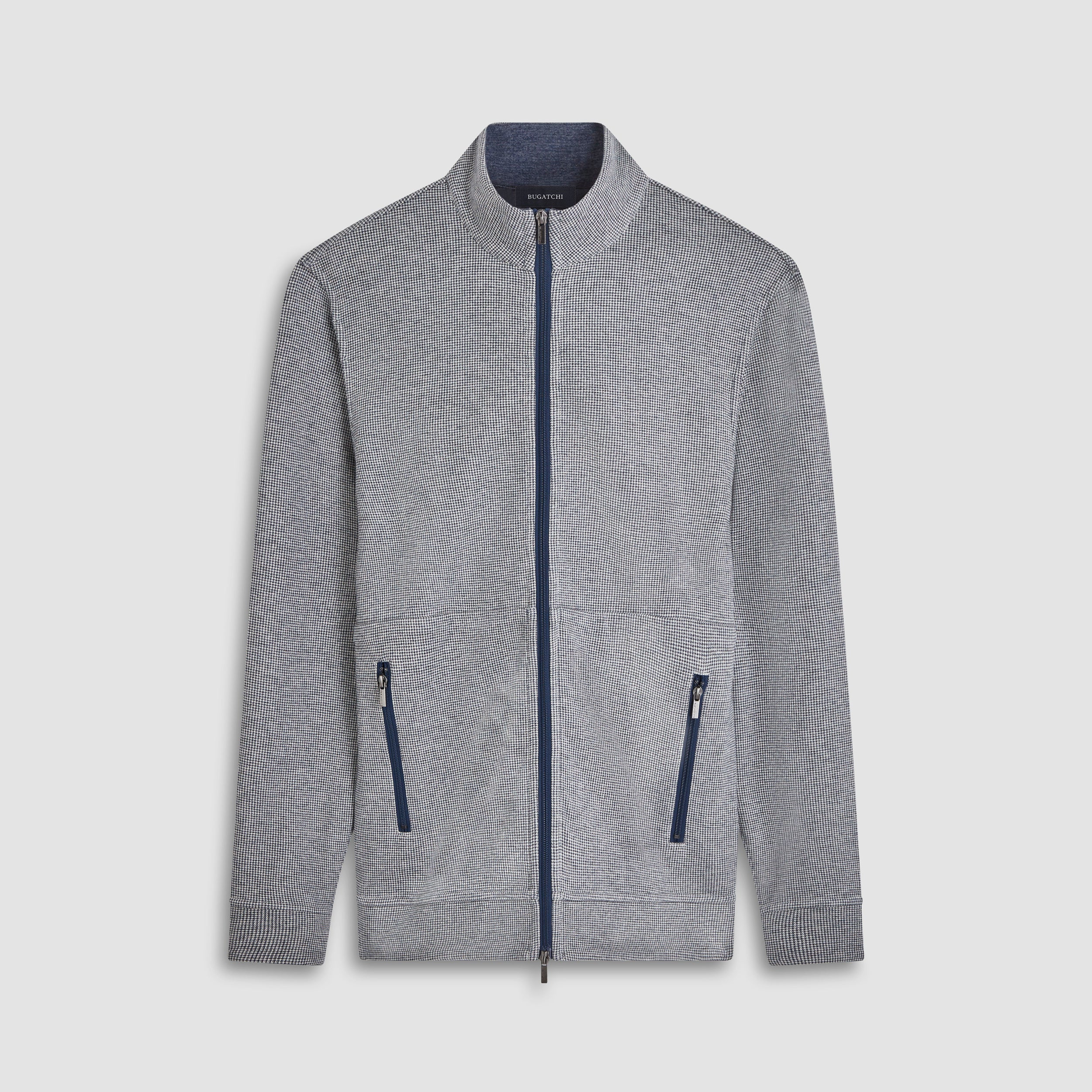 Reversible full zip Jacket in a soft cotton blend with a mock neck and zippered pockets. Featuring a classic houndstooth pattern on one side and a solid heather reverse, this piece offers timeless style options. Crafted for comfort and durability, this Jacket effortlessly transitions between looks, making it elegant and practical.