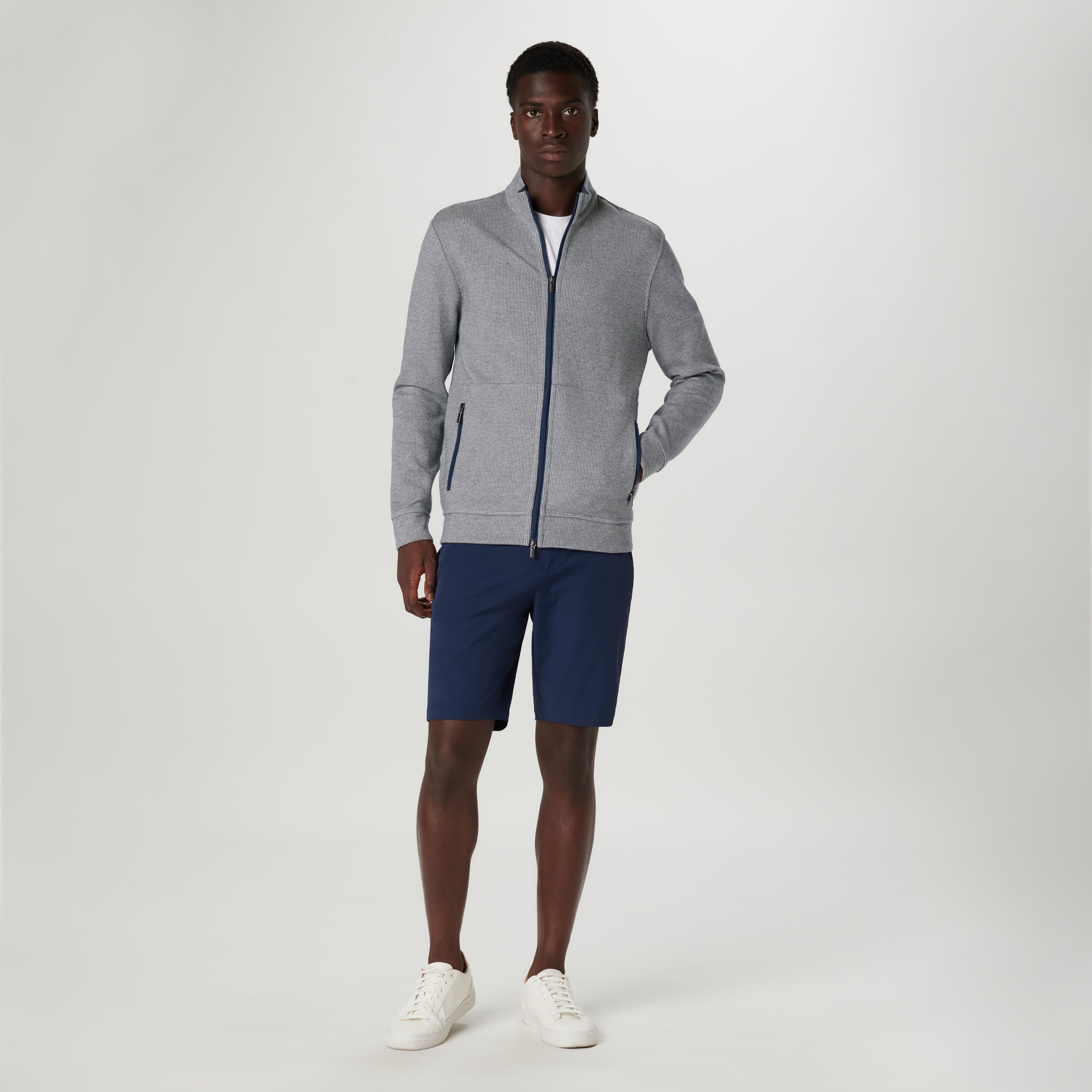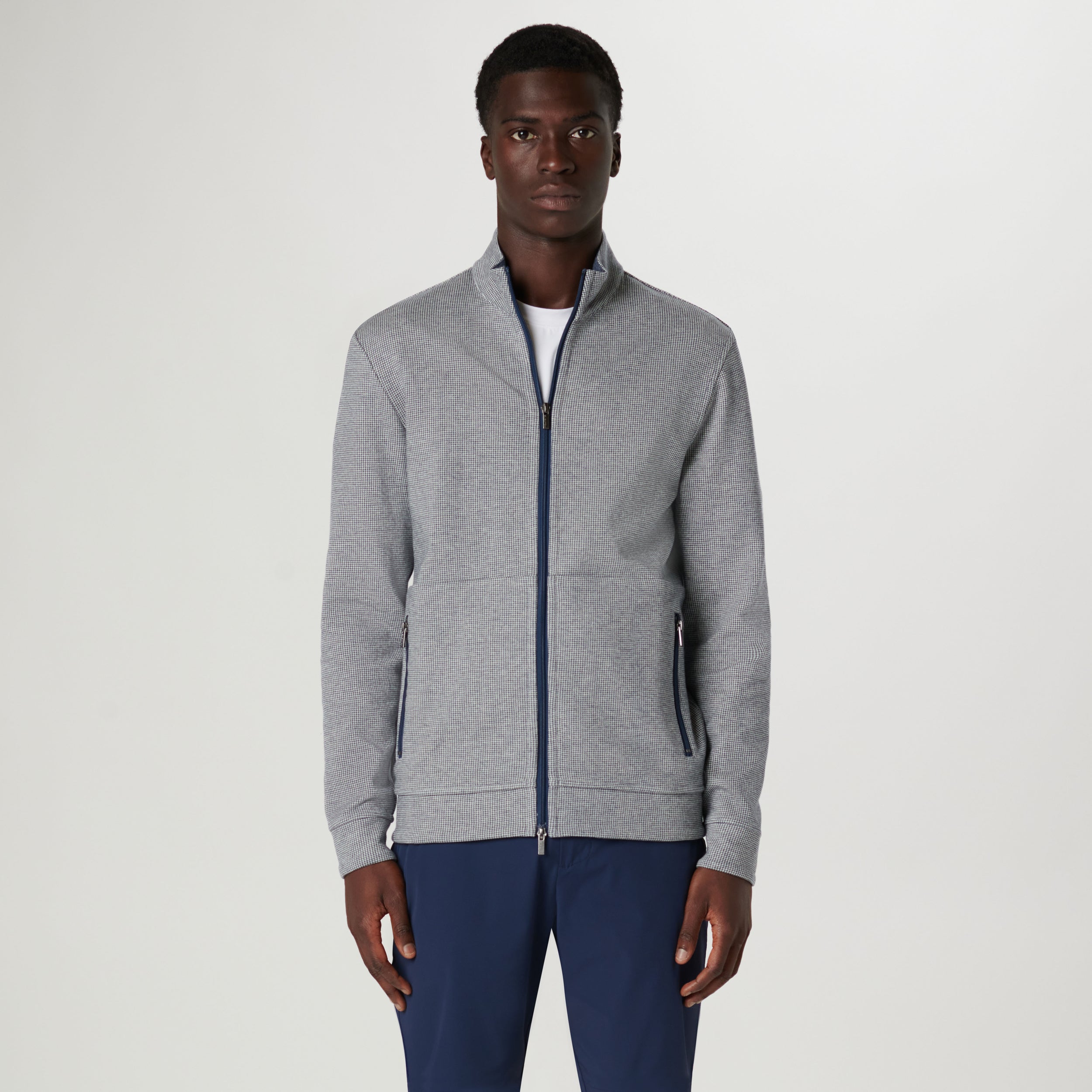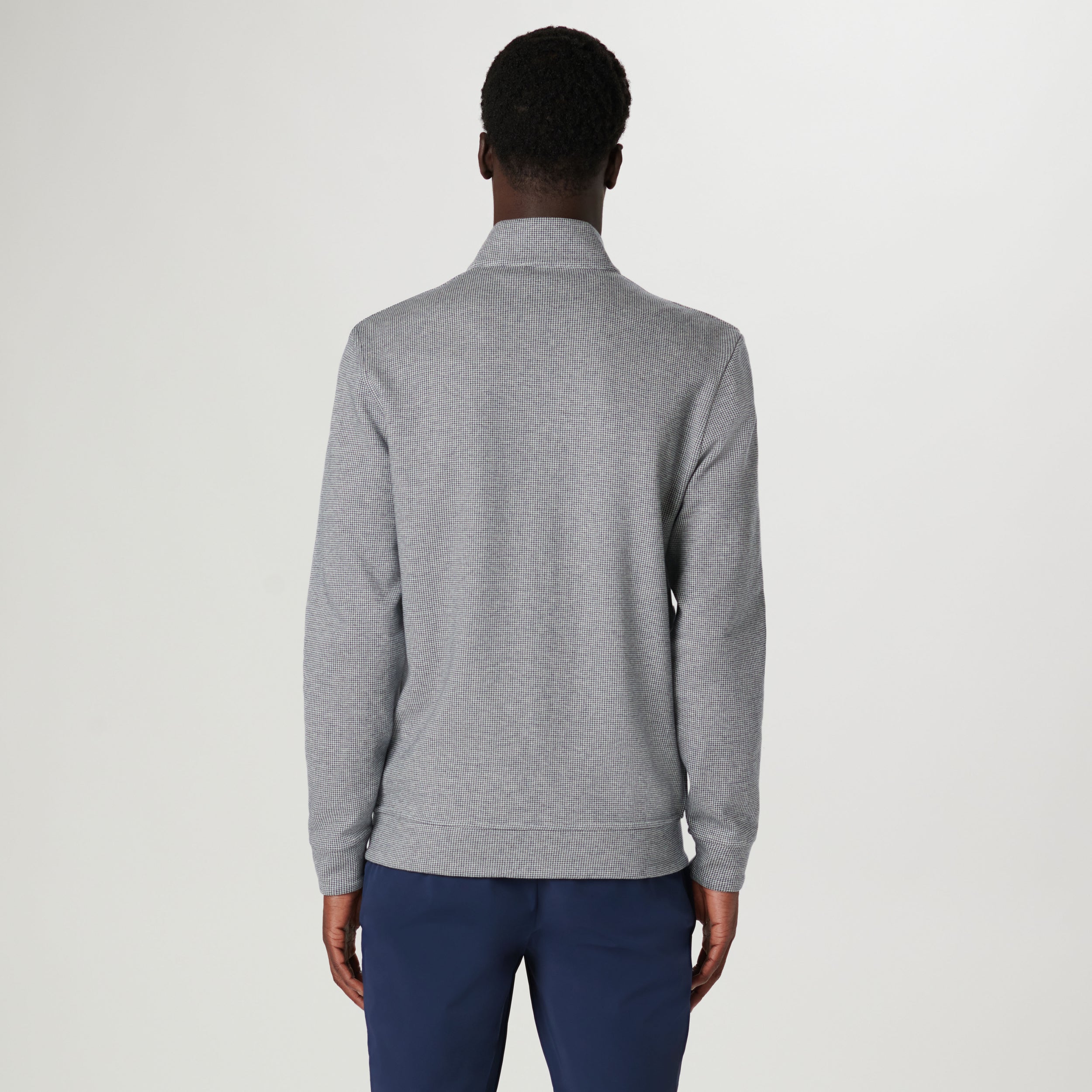 Reversible full zip Jacket in a soft cotton blend with a mock neck and zippered pockets. Featuring a classic houndstooth pattern on one side and a solid heather reverse, this piece offers timeless style options. Crafted for comfort and durability, this Jacket effortlessly transitions between looks, making it elegant and practical.