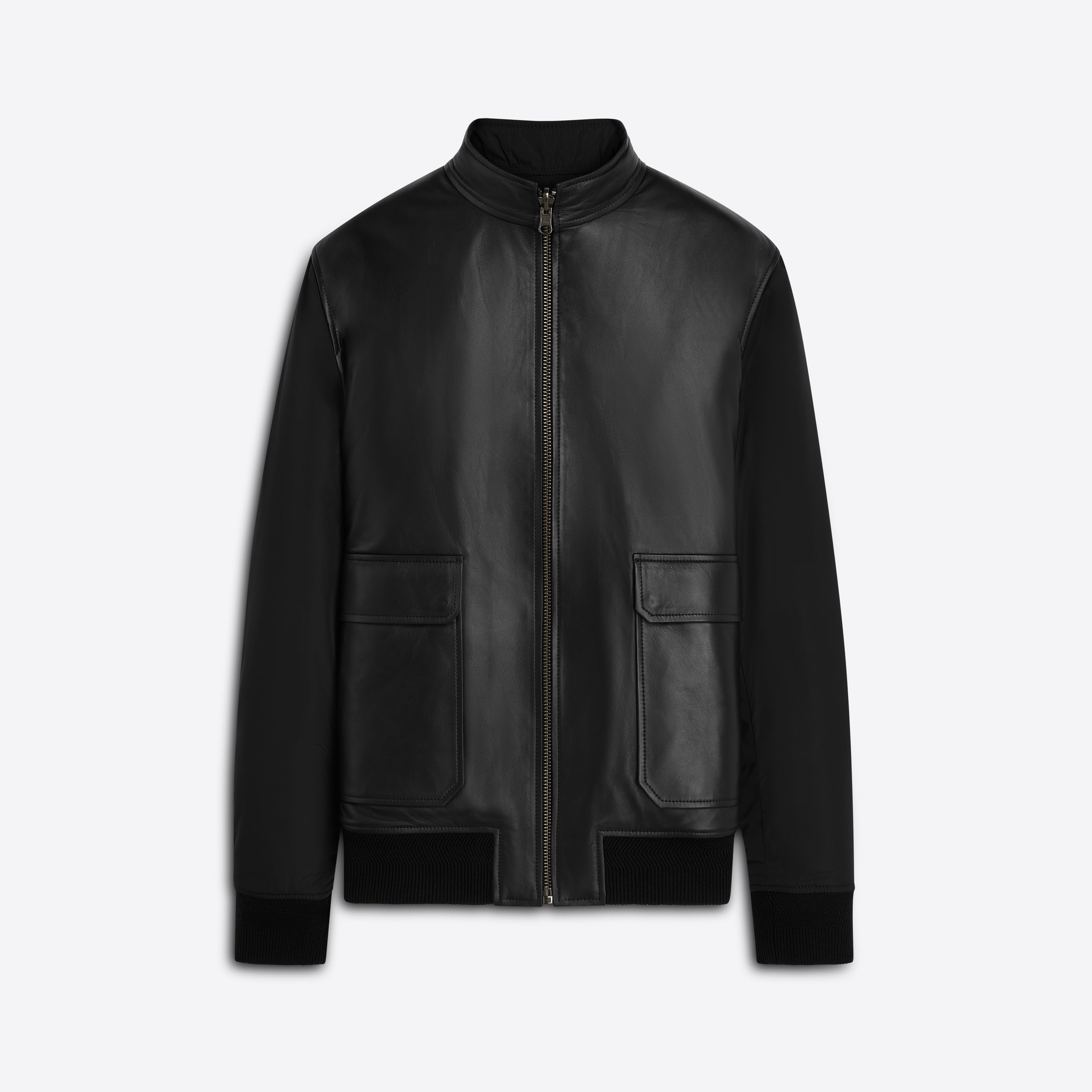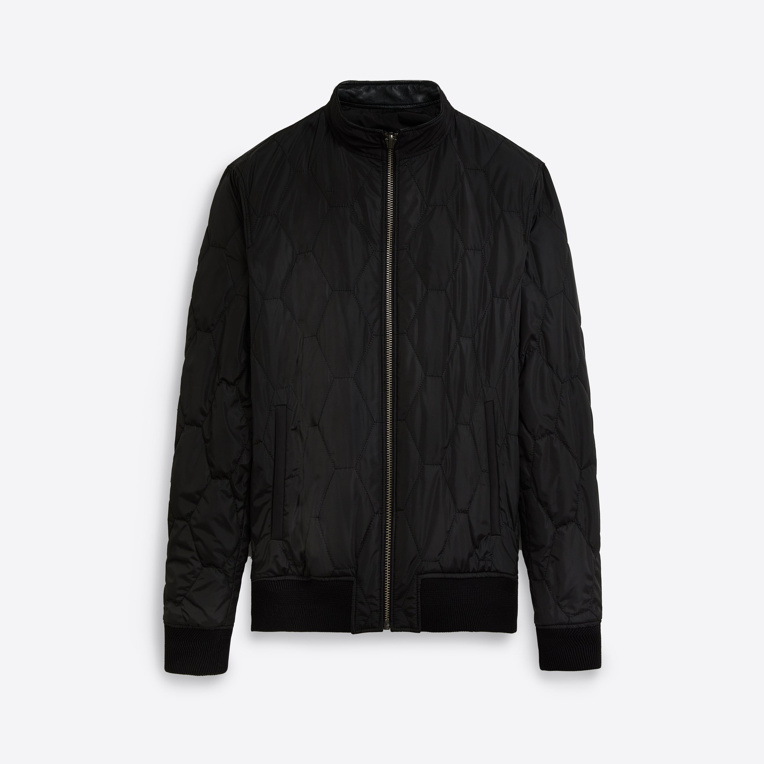 Reversible leather bomber jacket with high standing collar, patch and flap pockets, and elasticized rib cuff and waistband. Flips to quilted nylon reverse.