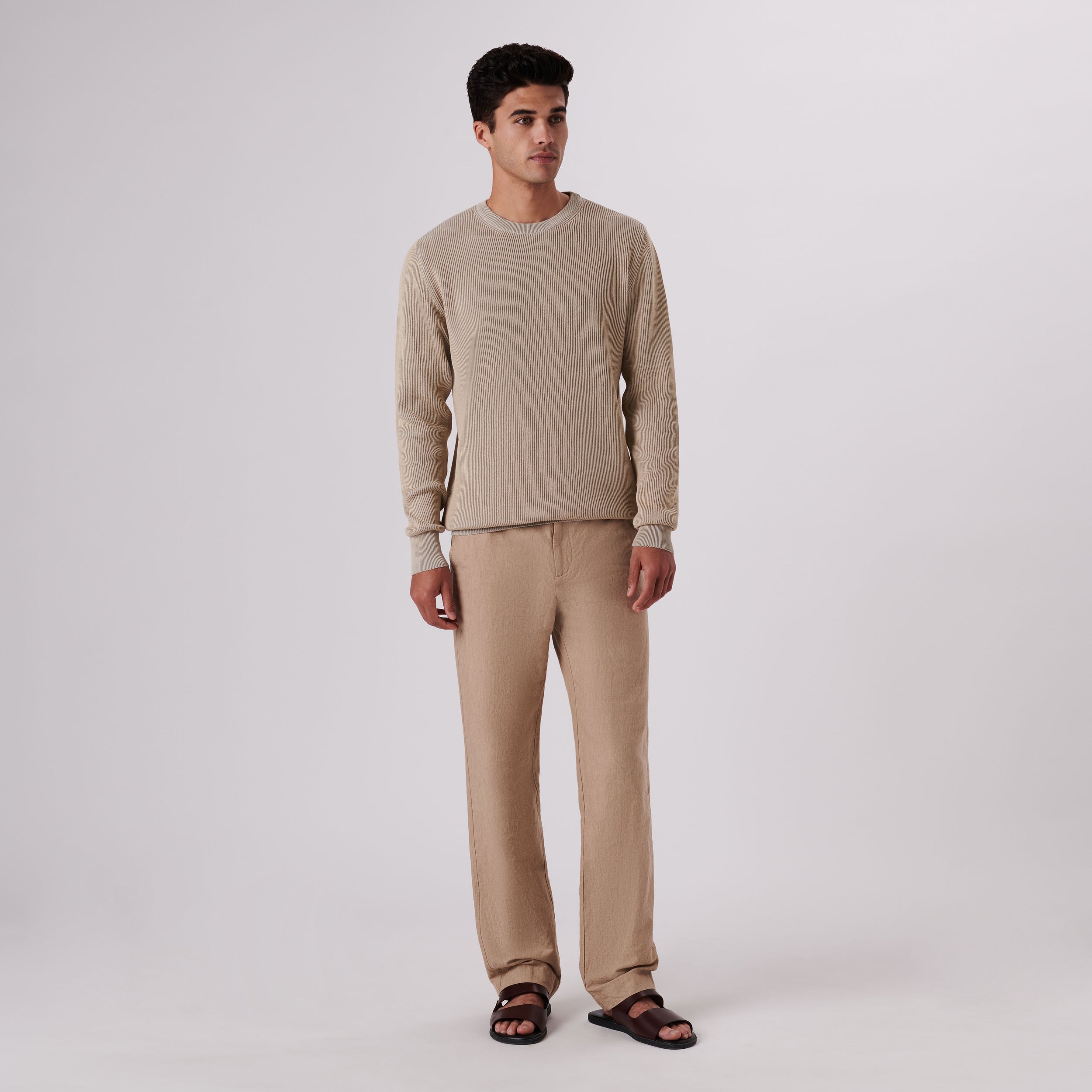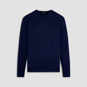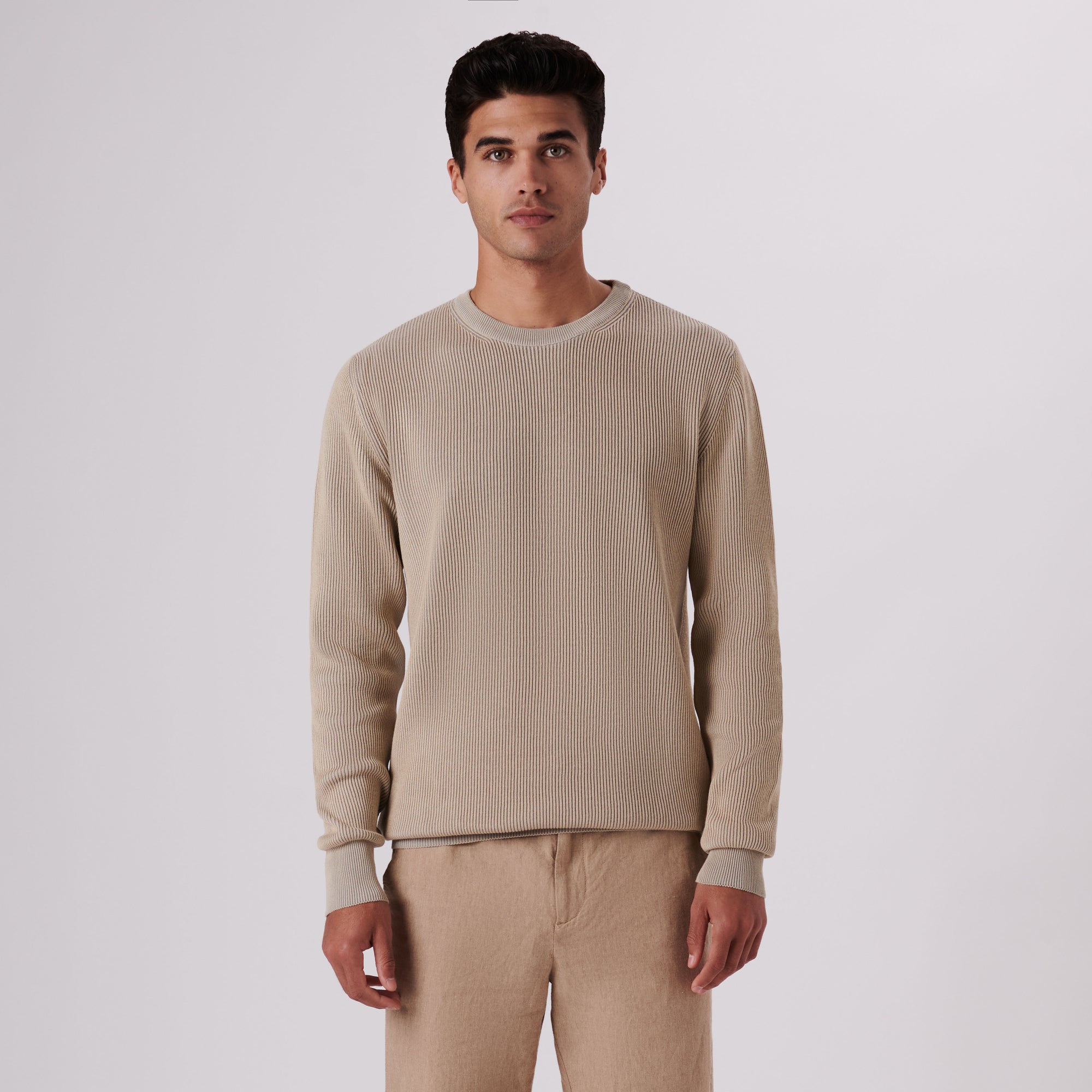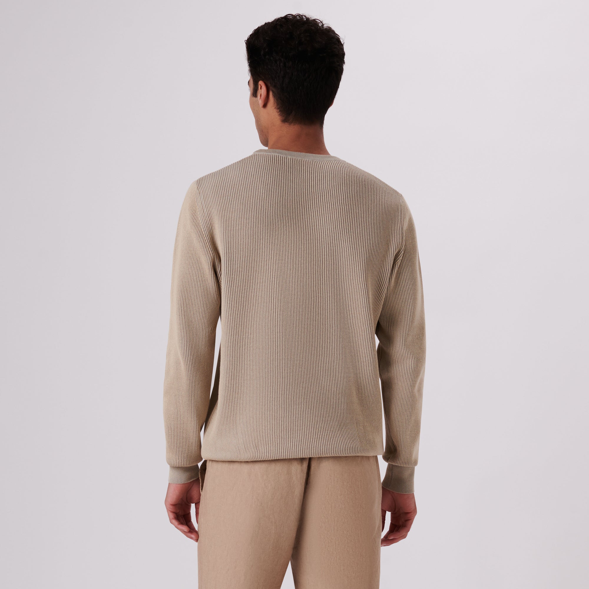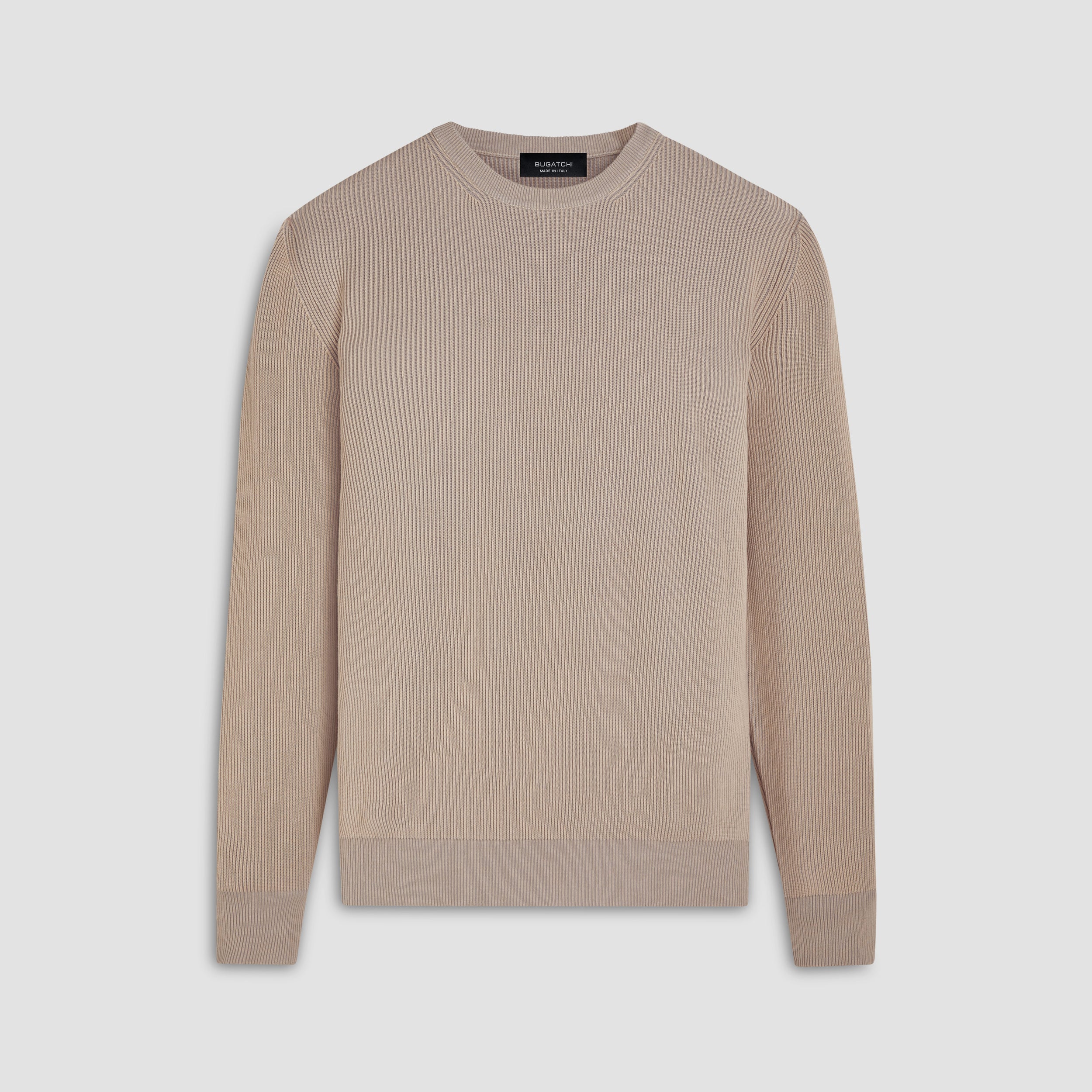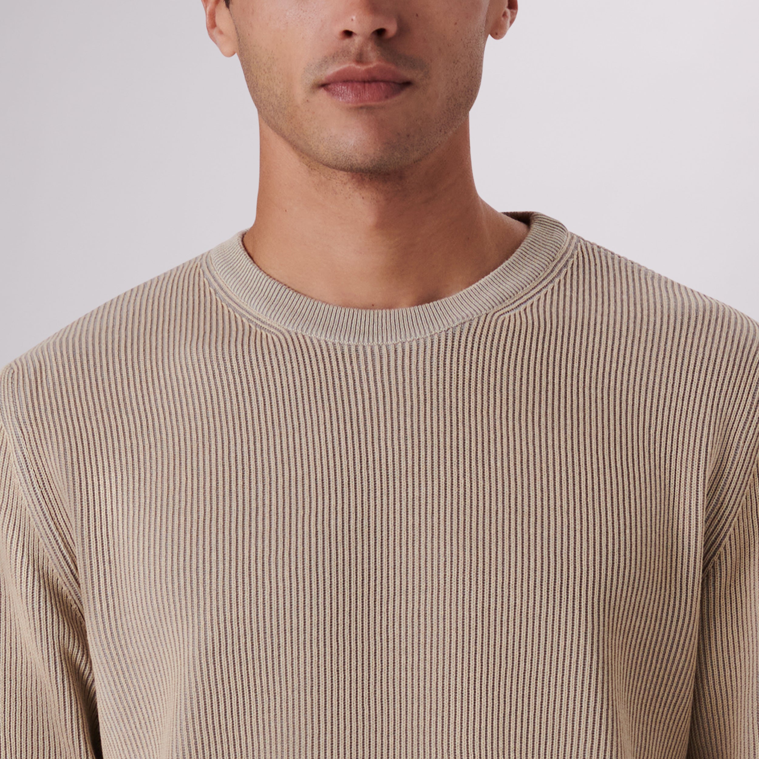 Two-tone rib knit long-sleeved crew neck sweater in100% cotton with solid rib knit collar, cuffs and waistband. Made in Italy.