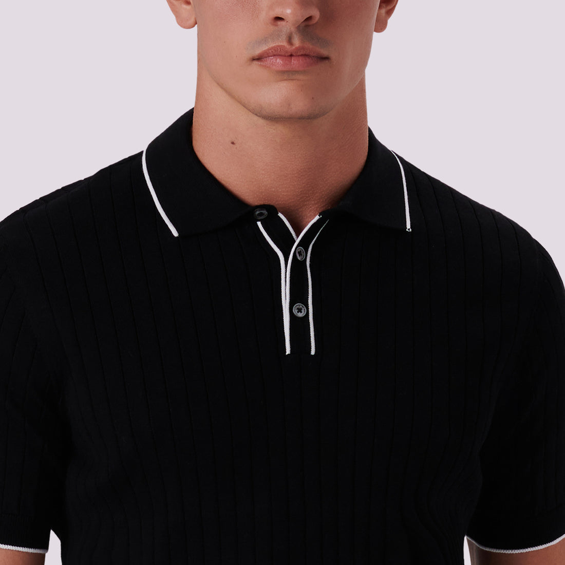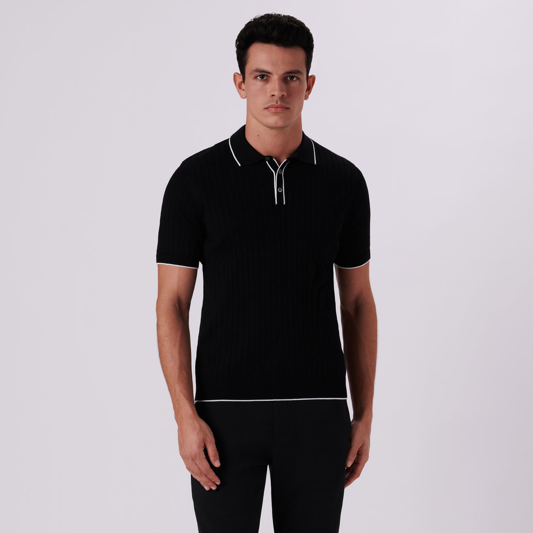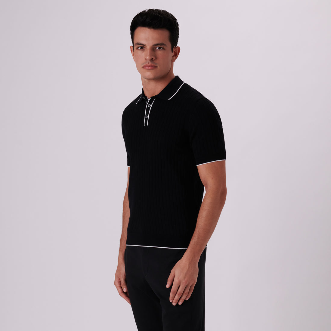 Rib knit short-sleeved polo sweater in cotton blend with contrast tipped three button placket and rib knit collar, armbands and waistband.
