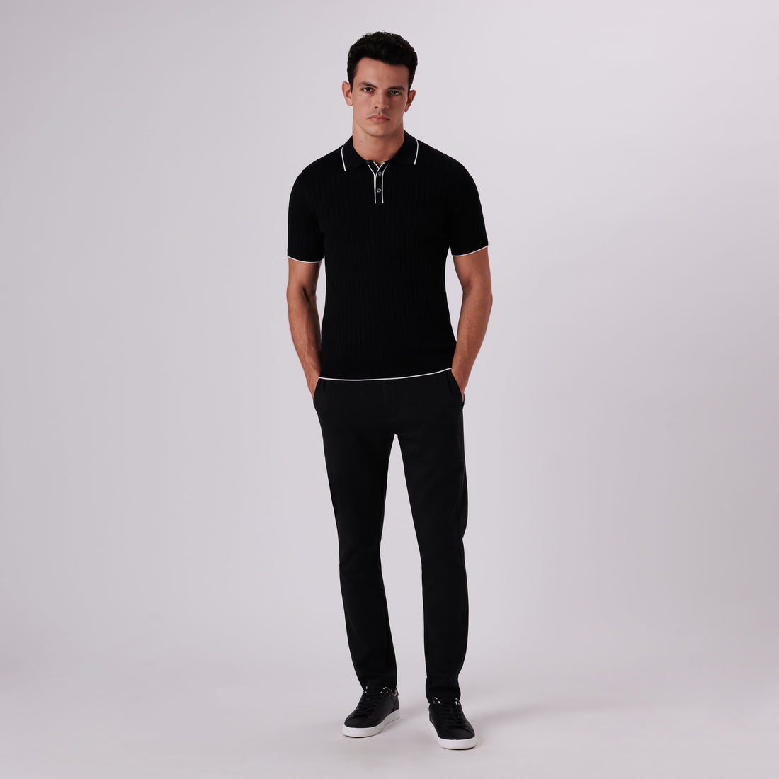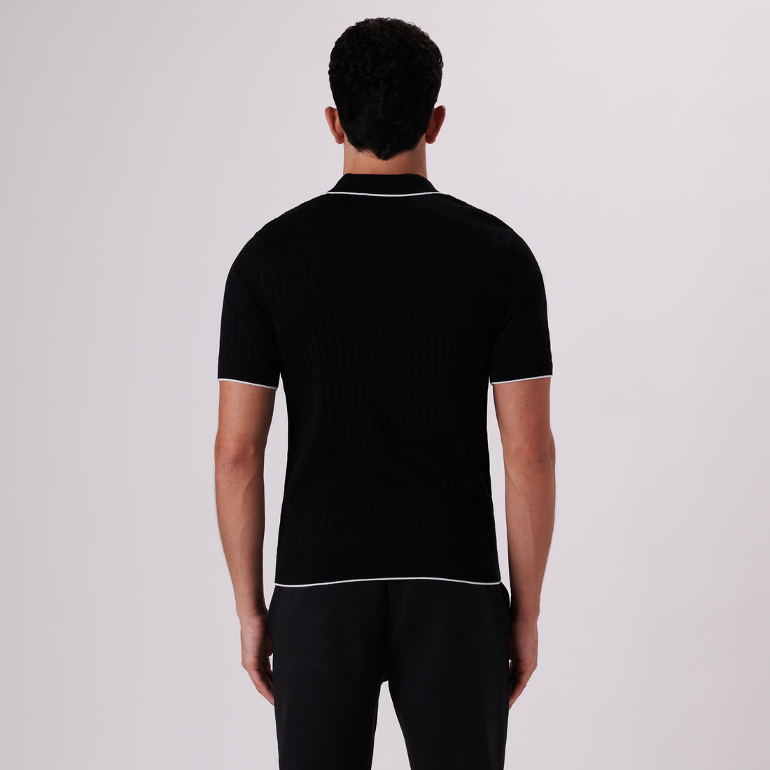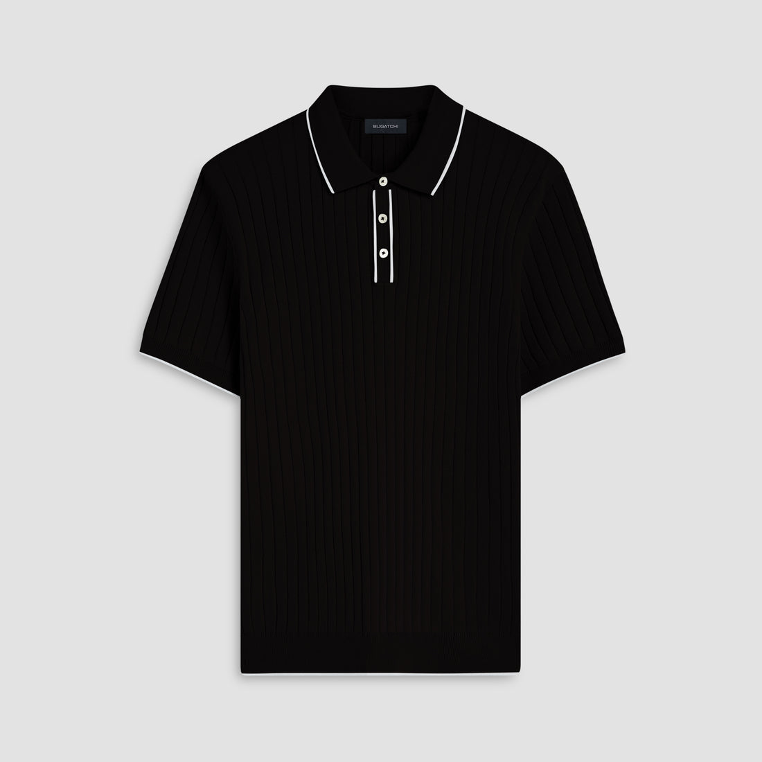 Rib knit short-sleeved polo sweater in cotton blend with contrast tipped three button placket and rib knit collar, armbands and waistband.