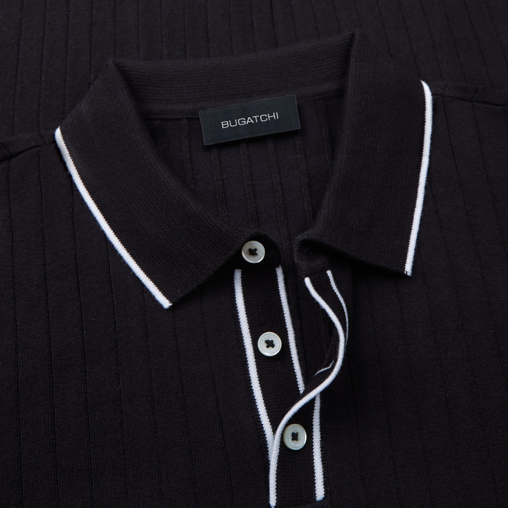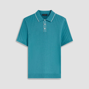 Rib knit short-sleeved polo sweater in cotton blend with contrast tipped three button placket and rib knit collar, armbands and waistband.