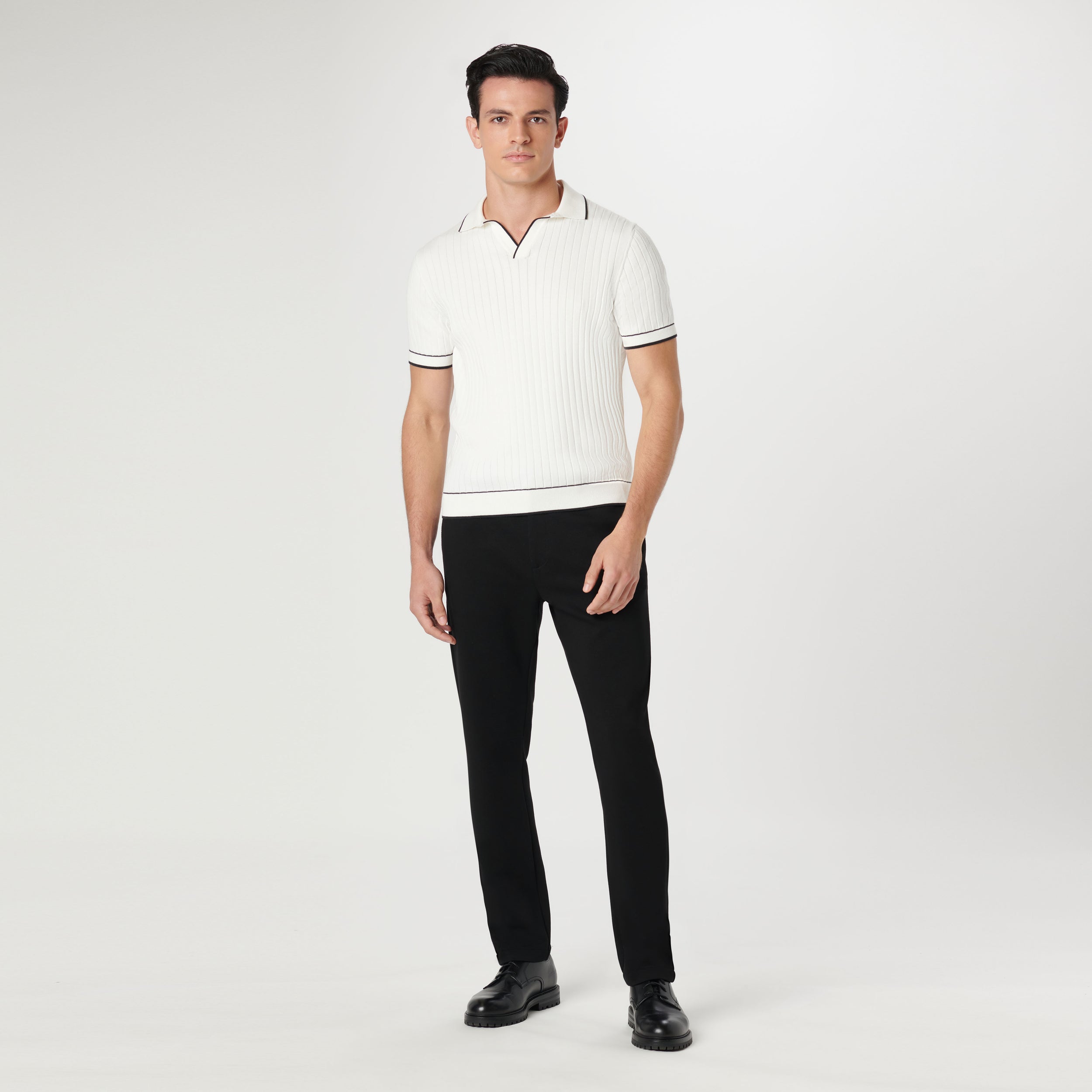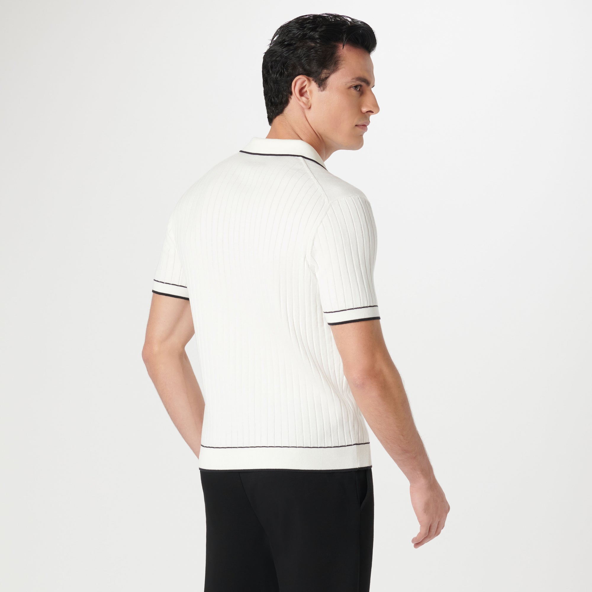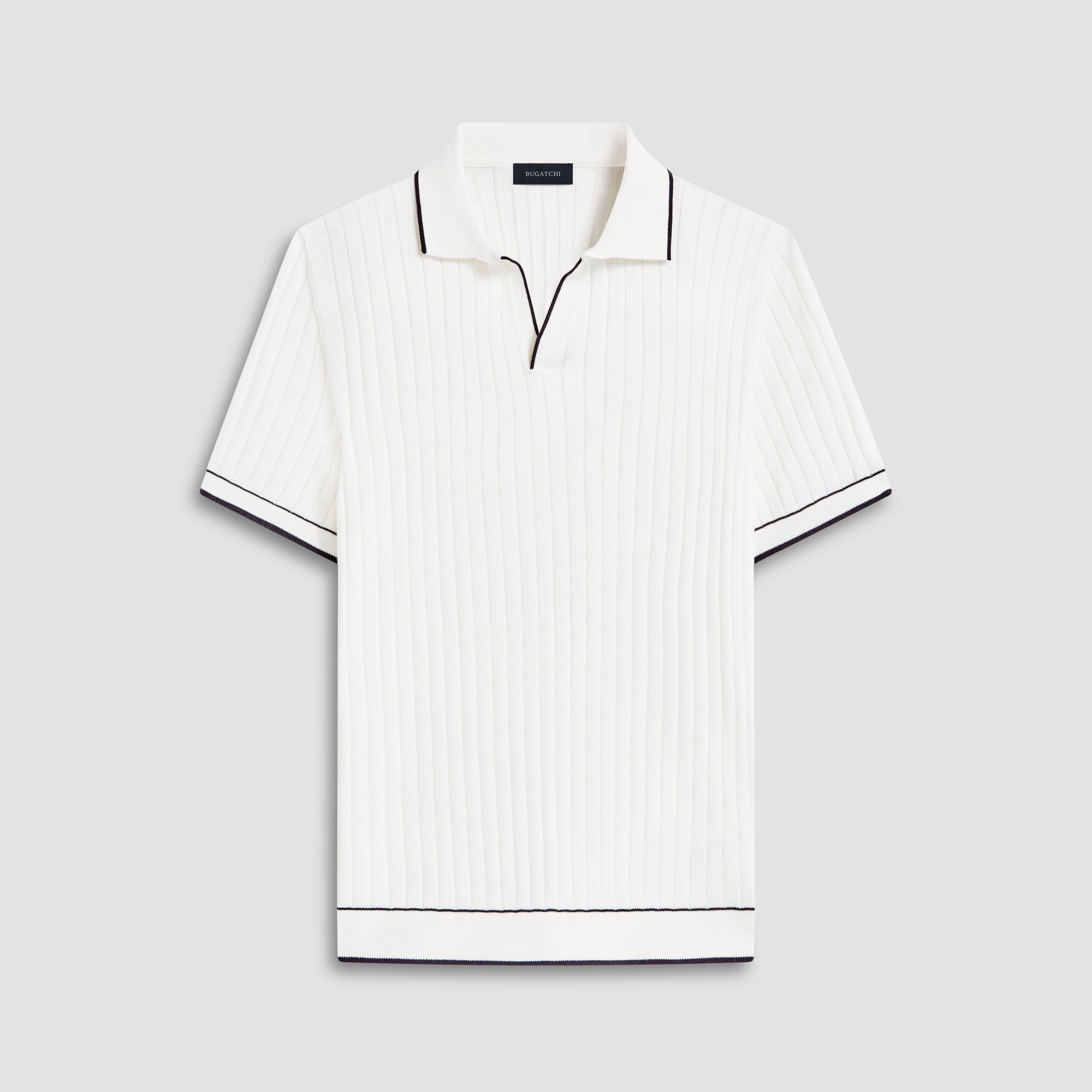 Crafted in a durable blend of cotton and polyester, this rib-stitch short-sleeved polo sweater showcases a solid flat knit Johnny collar, armbands, and waist. Soft against the skin with comfort stretch and added strength for lasting wear, it strikes the perfect balance between comfort and durability.