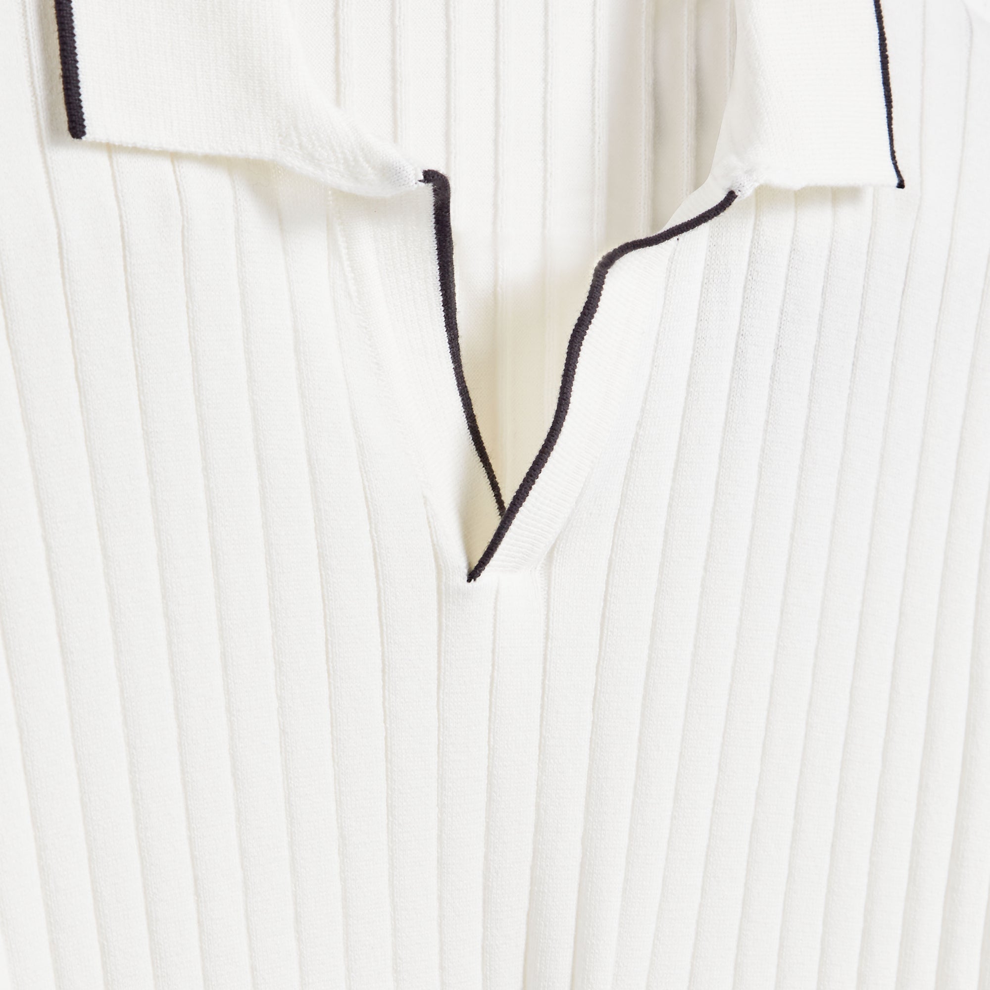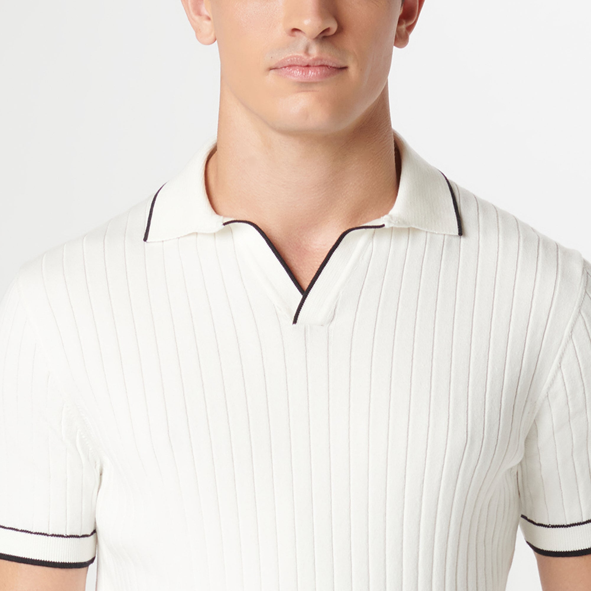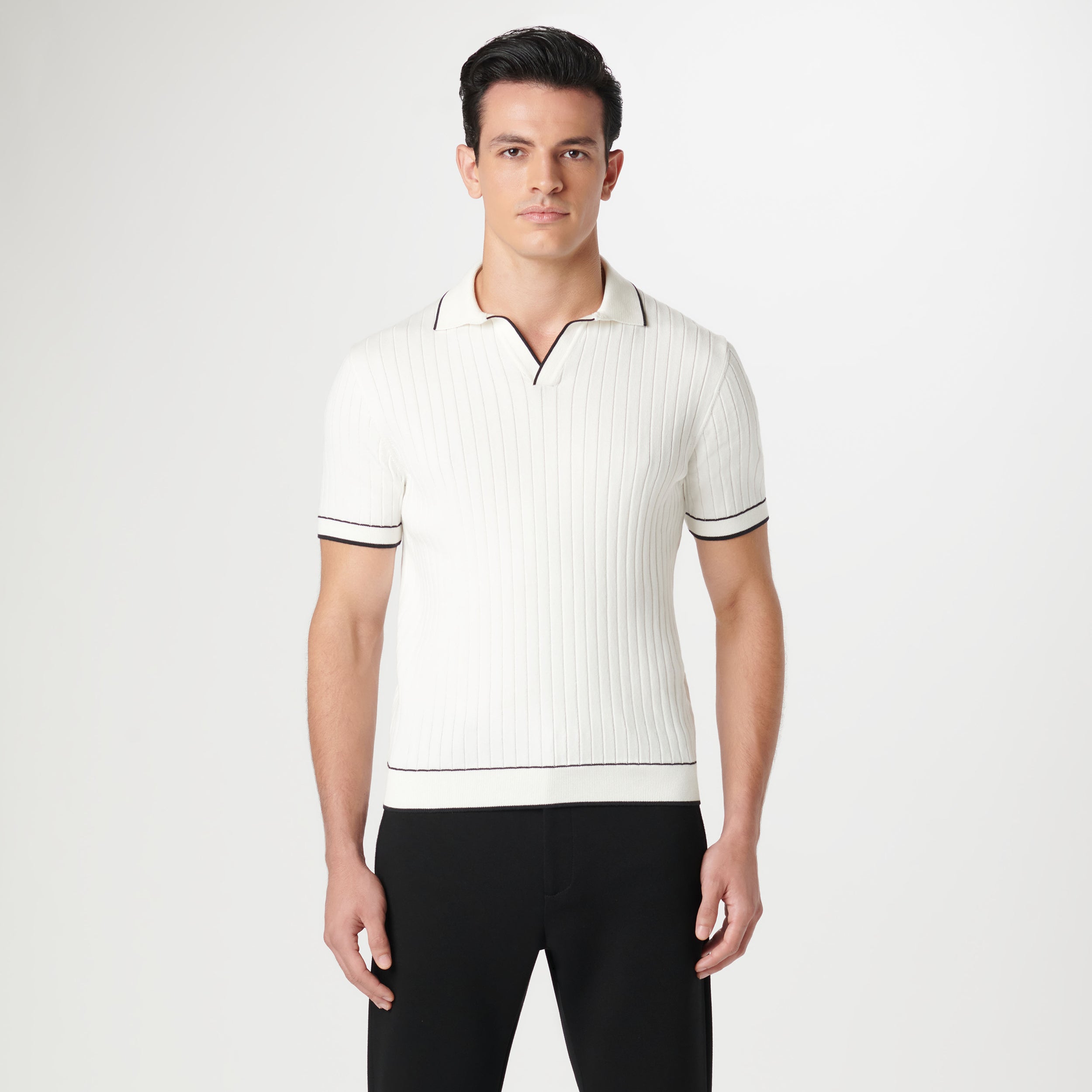 Crafted in a durable blend of cotton and polyester, this rib-stitch short-sleeved polo sweater showcases a solid flat knit Johnny collar, armbands, and waist. Soft against the skin with comfort stretch and added strength for lasting wear, it strikes the perfect balance between comfort and durability.