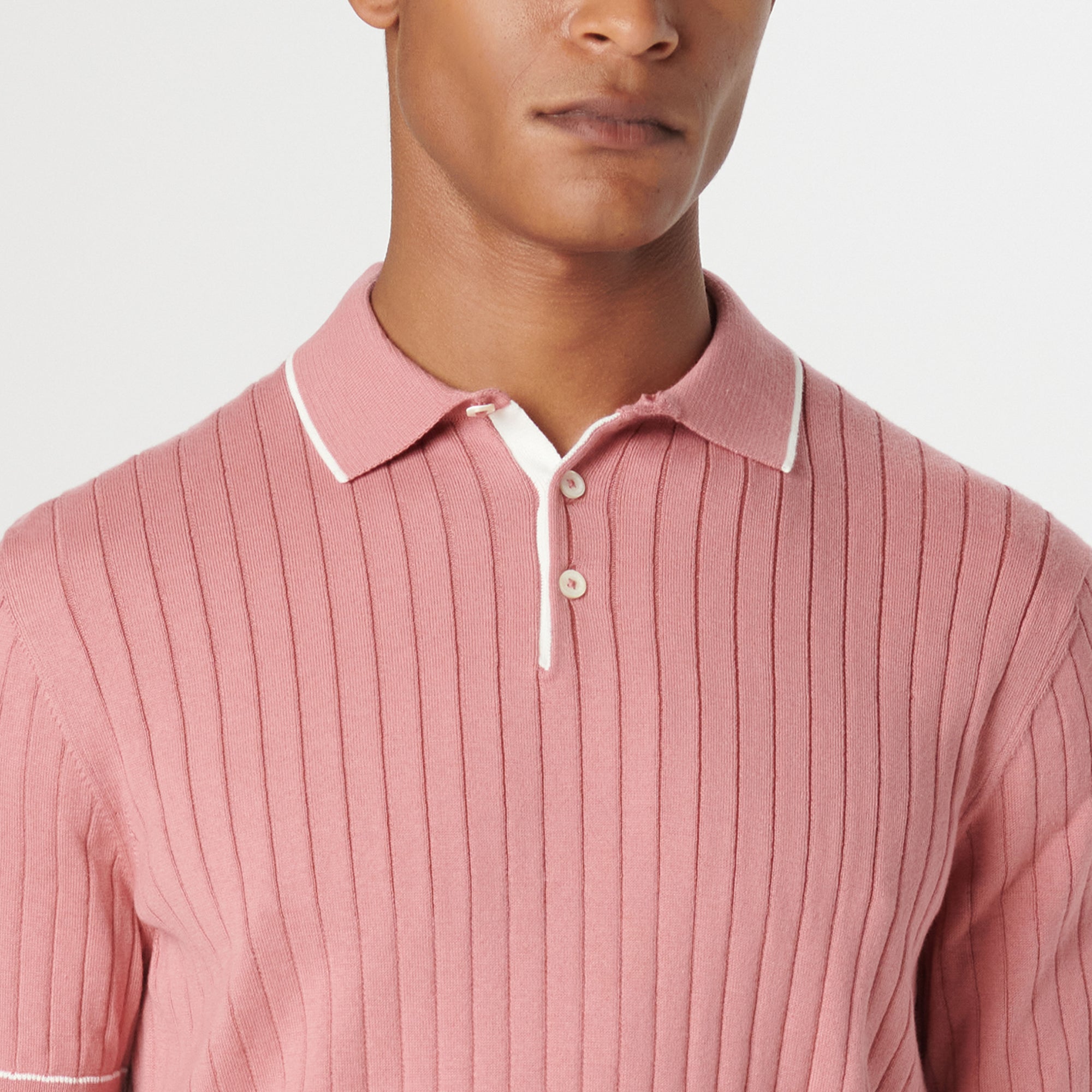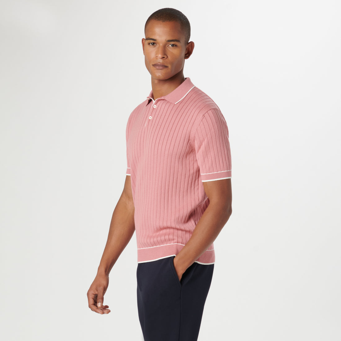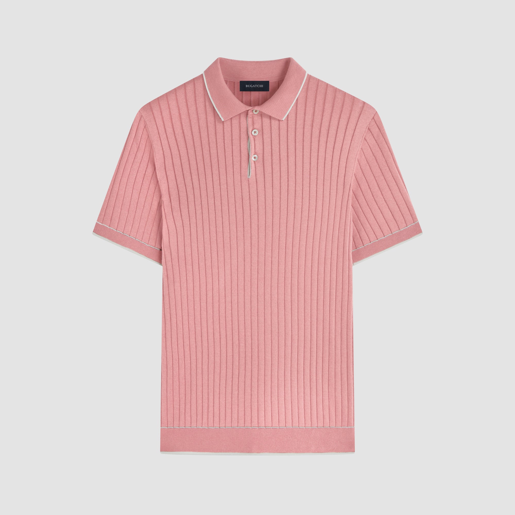 Crafted in a durable blend of cotton and polyester, this rib-stitch short-sleeved polo sweater features a three-button contrast placket, and solid flat knit collar, armbands, and waist. Soft against the skin with comfort stretch and added strength for lasting wear, it strikes the perfect balance between comfort and durability.