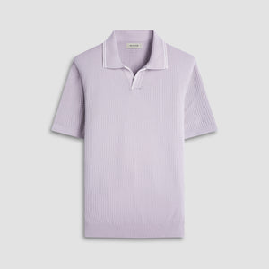 This stylish seed rib Johnny collar sweater features short sleeves and is crafted from a comfortable cotton blend, elevated by solid flat rib collar, cuffs, and waist with contrasting tipping detail. The textured seed rib pattern adds depth and visual interest, making it a classic versatile piece perfect for layering or wearing on its own.