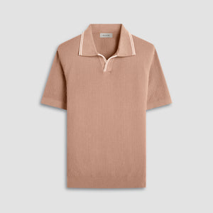 This stylish seed rib Johnny collar sweater features short sleeves and is crafted from a comfortable cotton blend, elevated by solid flat rib collar, cuffs, and waist with contrasting tipping detail. The textured seed rib pattern adds depth and visual interest, making it a classic versatile piece perfect for layering or wearing on its own.