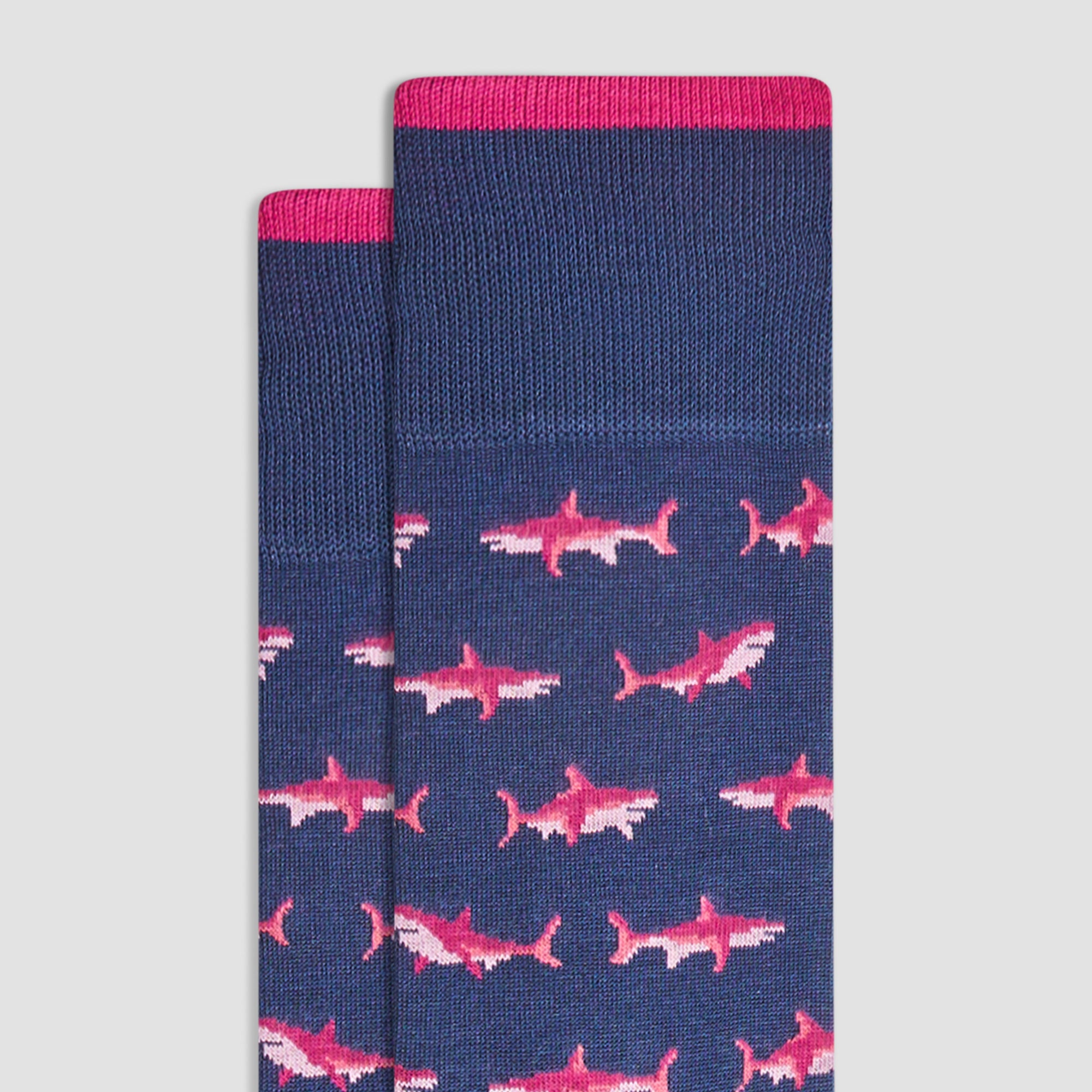 Combining exclusive novelty patterns with Italian craftsmanship, these shark socks are made from a fine gauge mercerized cotton with ribbed cuff band, hand linked toe and reinforced heel seams to complement any wardrobe as a statement piece.