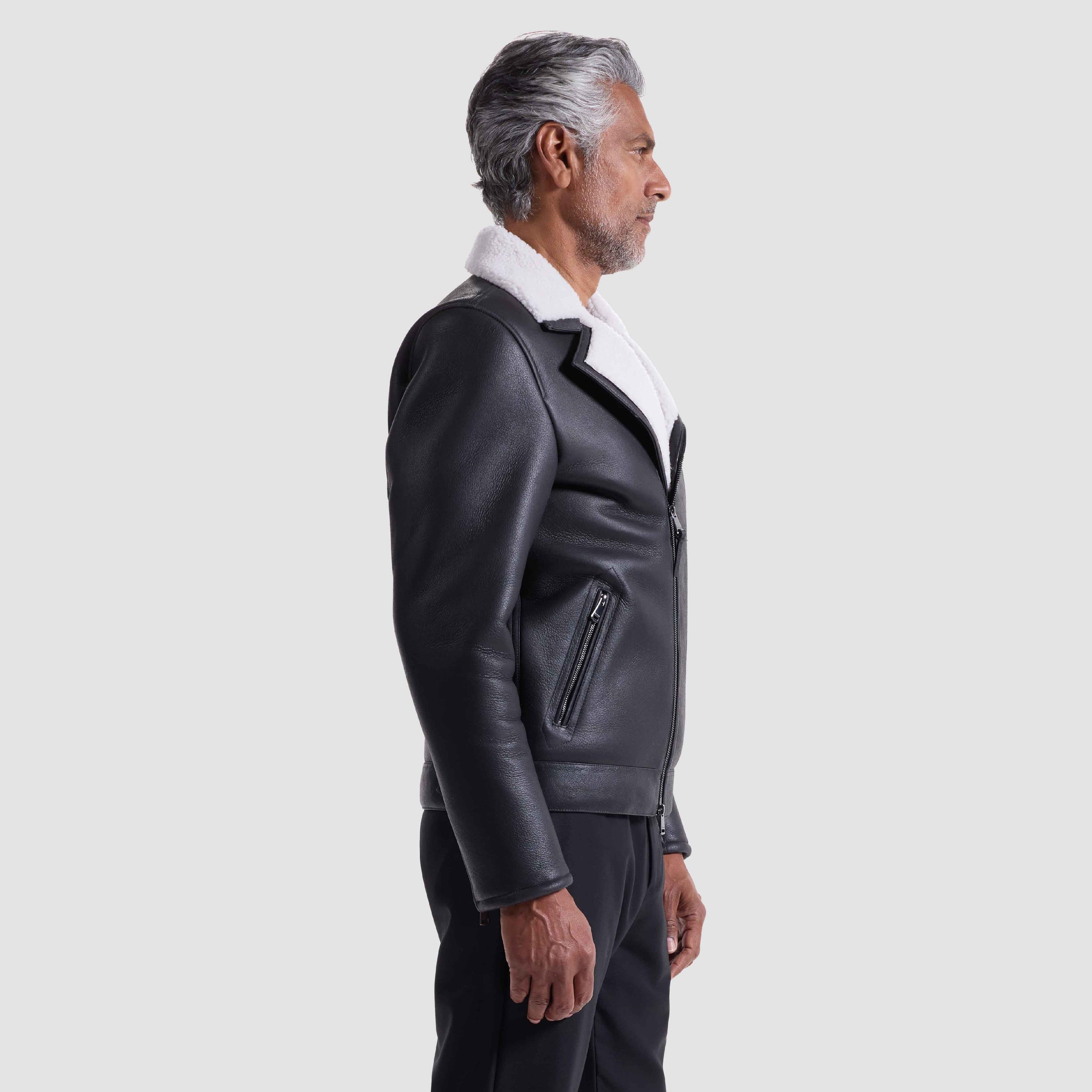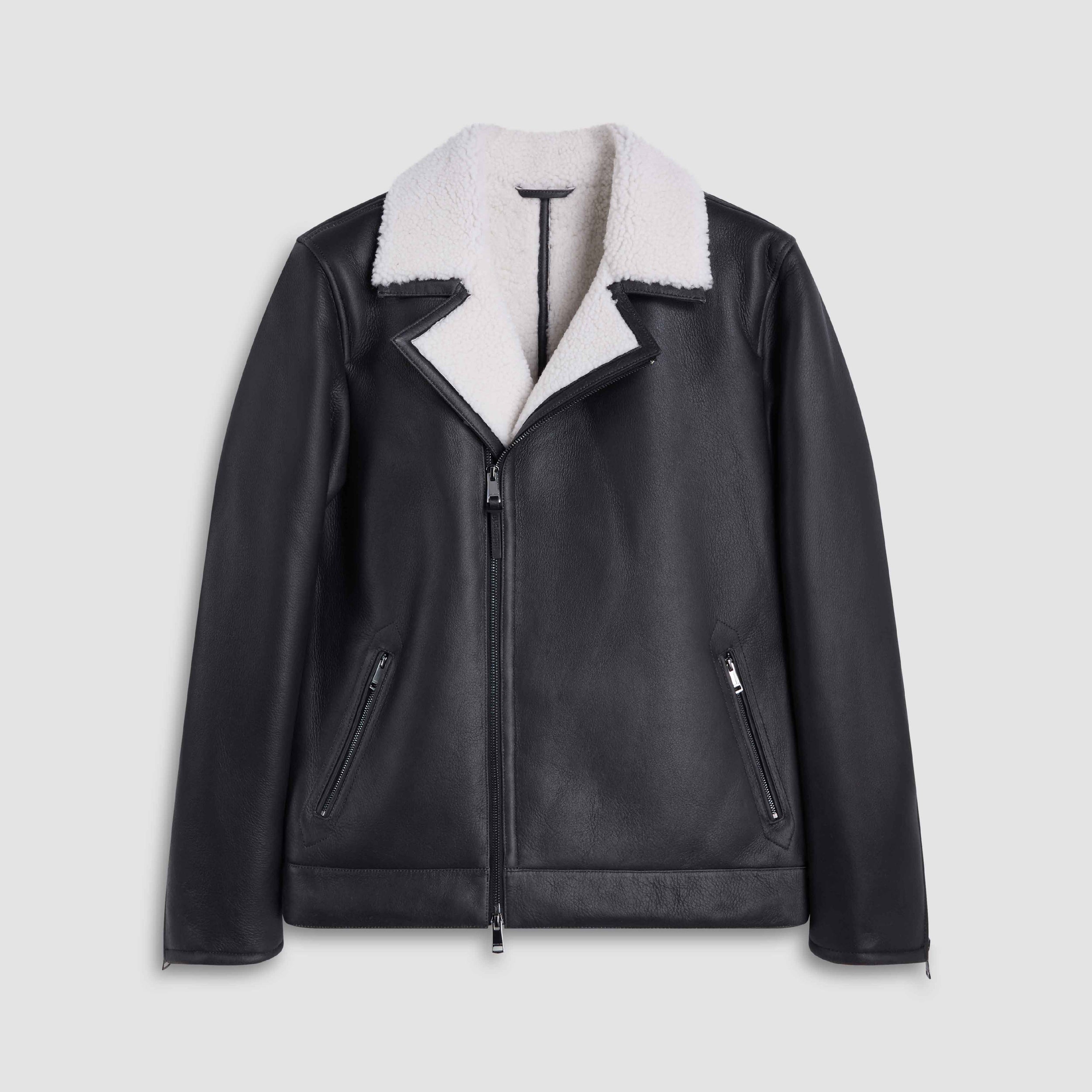 Crafted from 100% lamb leather, this biker jacket with shearling lining features a two-way zipper, two angled zip pockets, and two interior leather pockets. A functional, cold-weather essential with a bold, structured look.