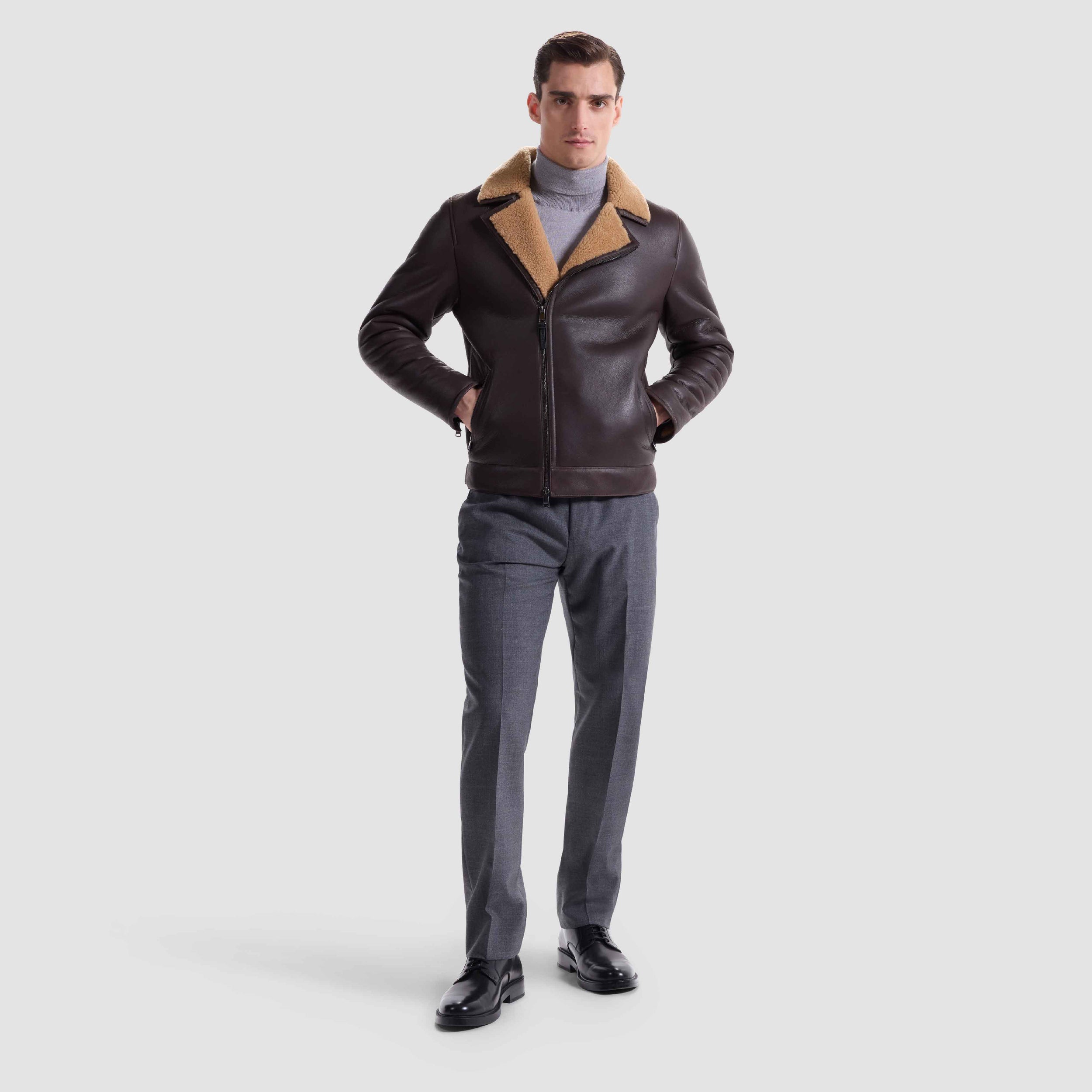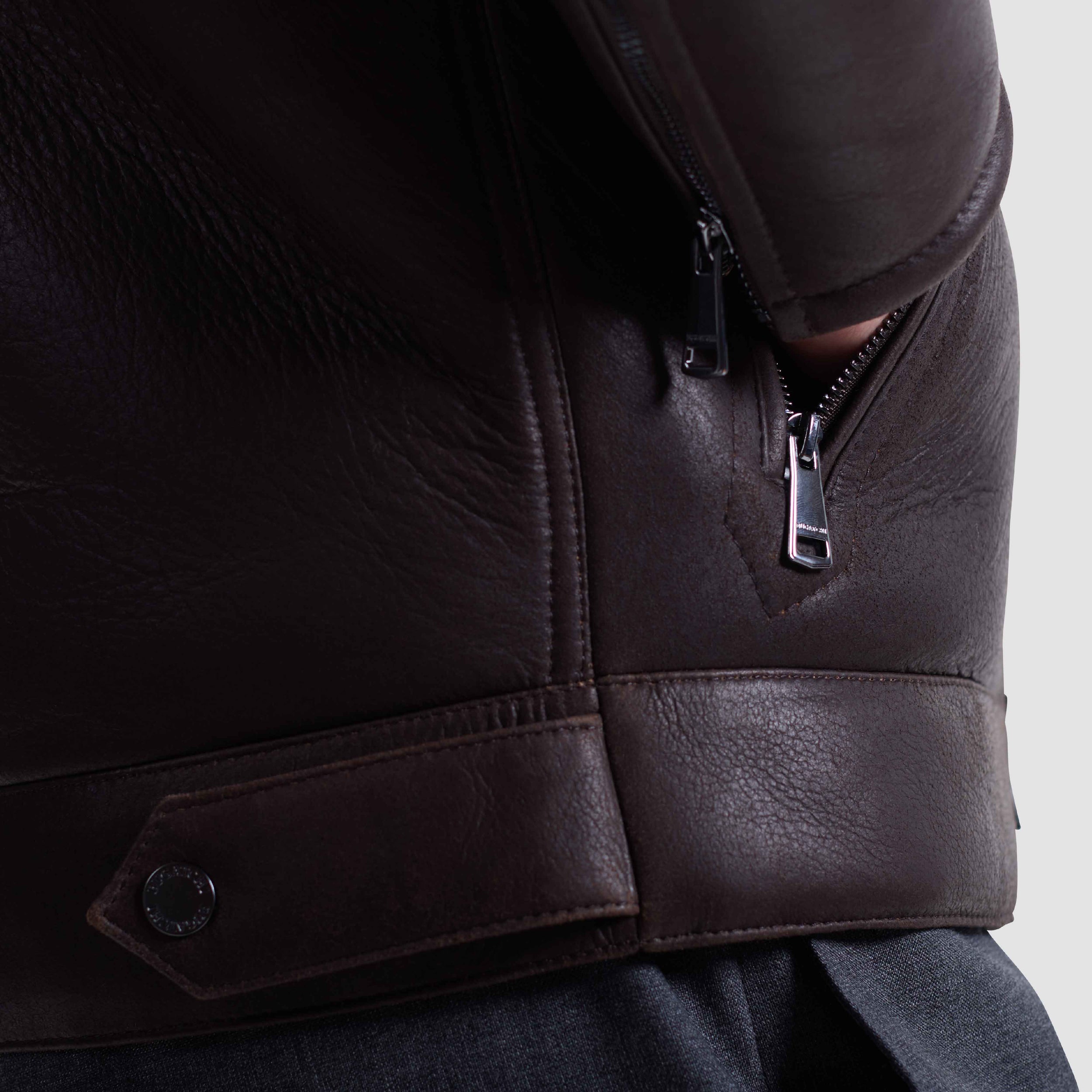 Crafted from 100% lamb leather, this biker jacket with shearling lining features a two-way zipper, two angled zip pockets, and two interior leather pockets. A functional, cold-weather essential with a bold, structured look.