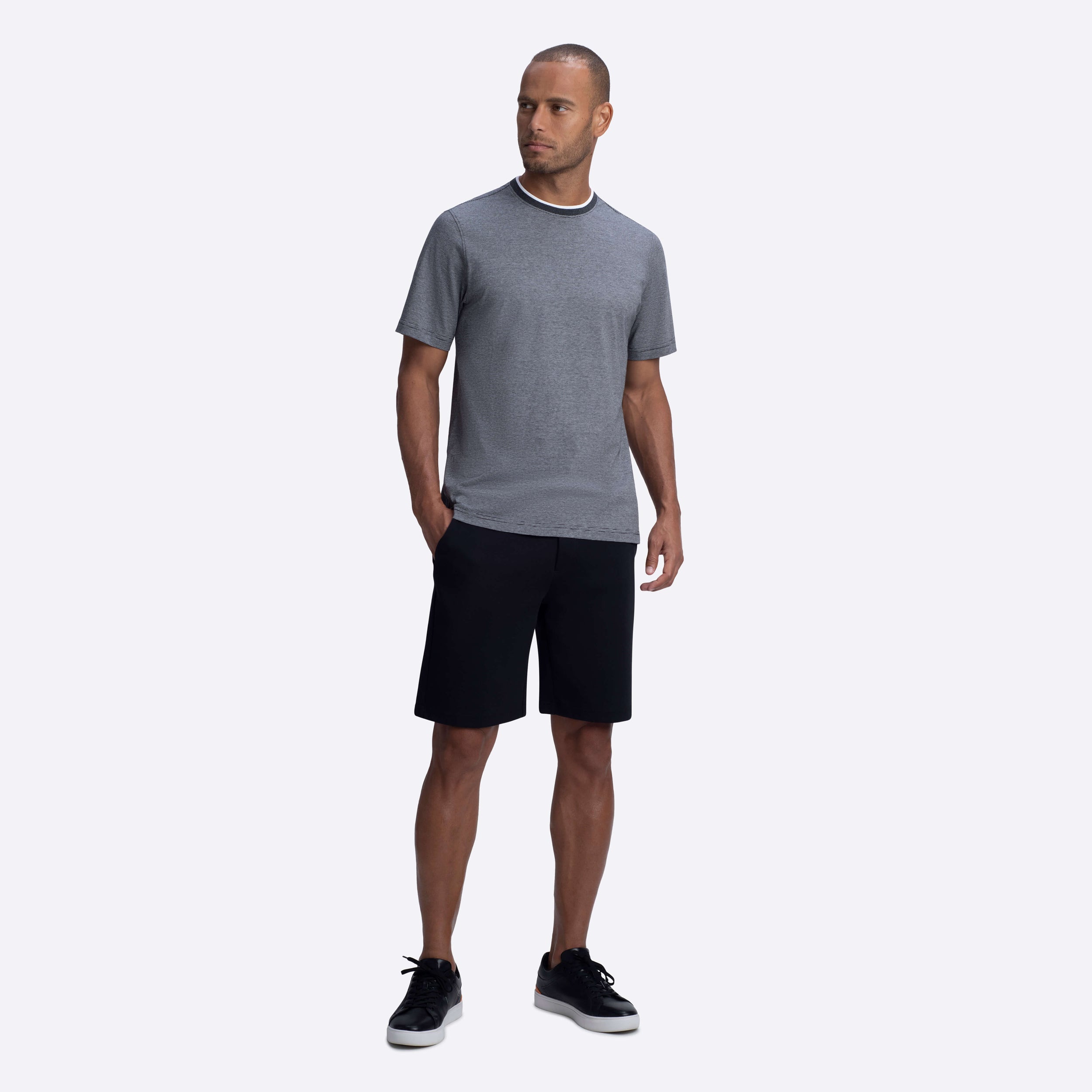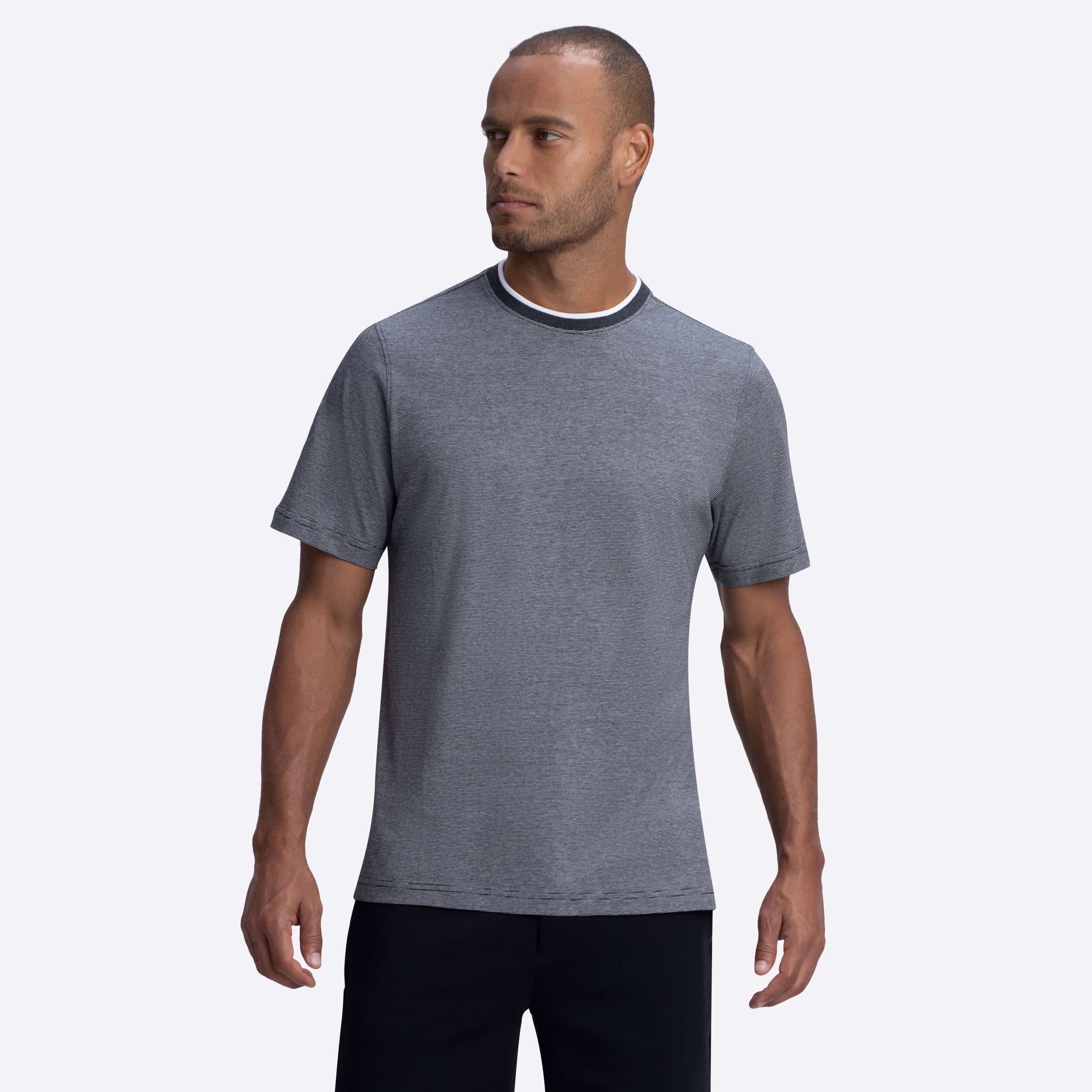 Short sleeve crew neck T-shirt in thin stripe COMFORT 100% cotton with contrast tipped rib collar band.