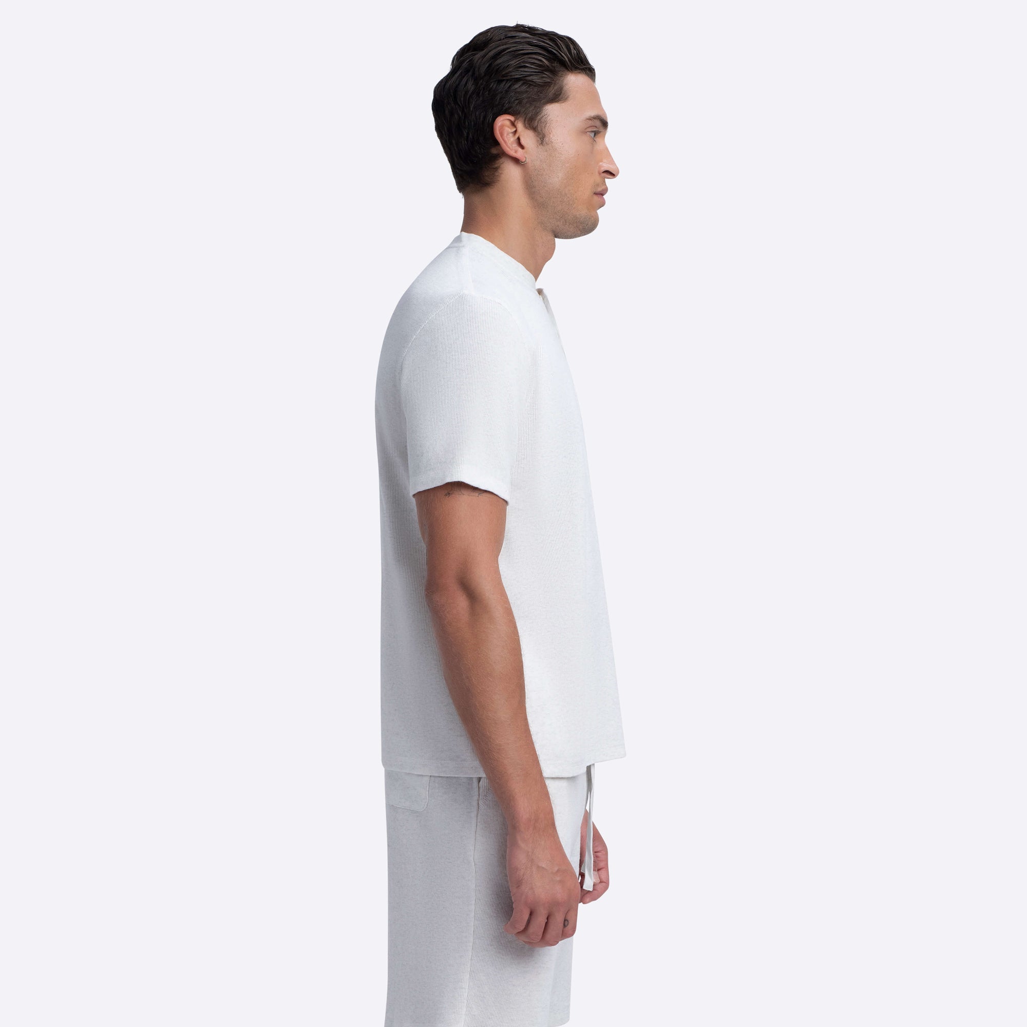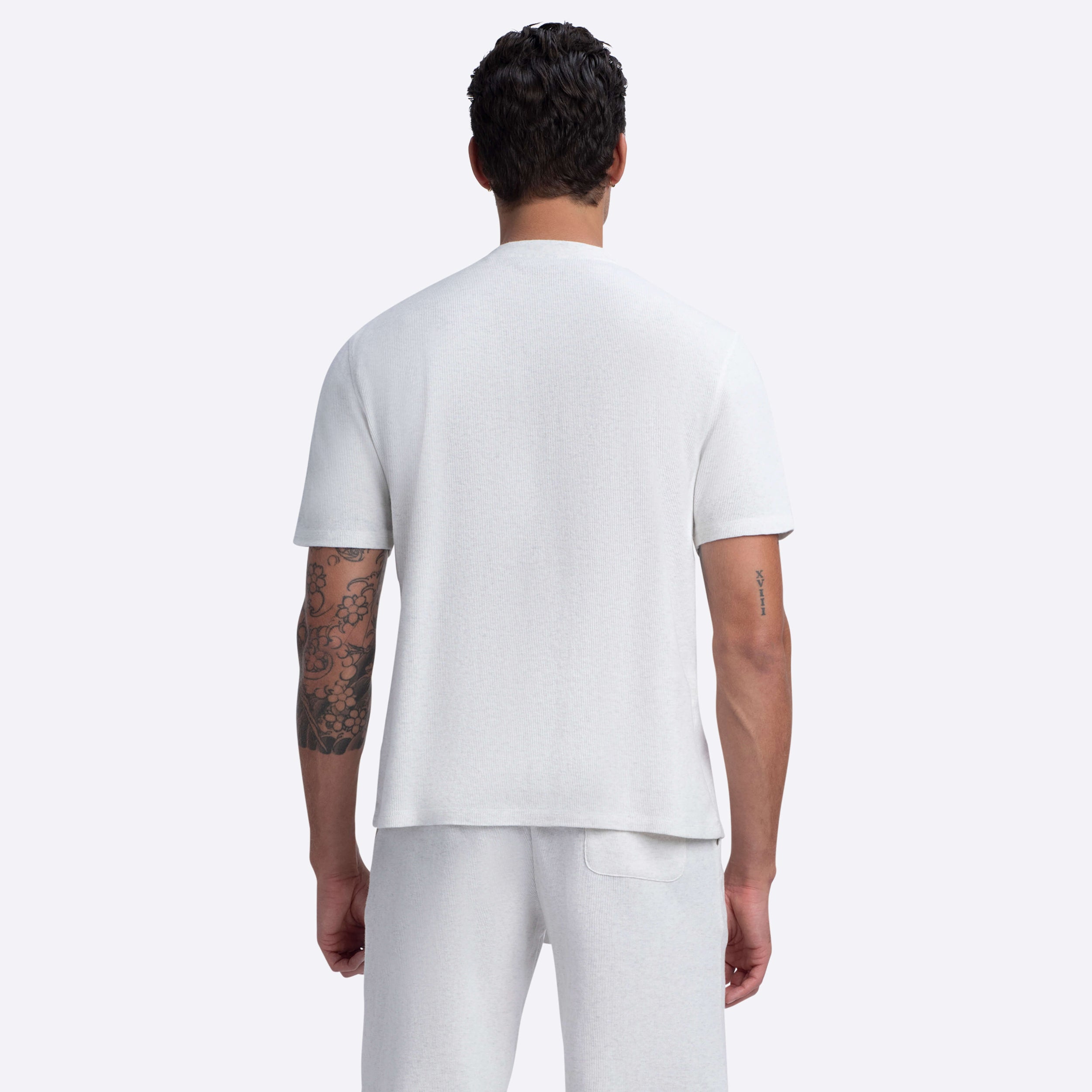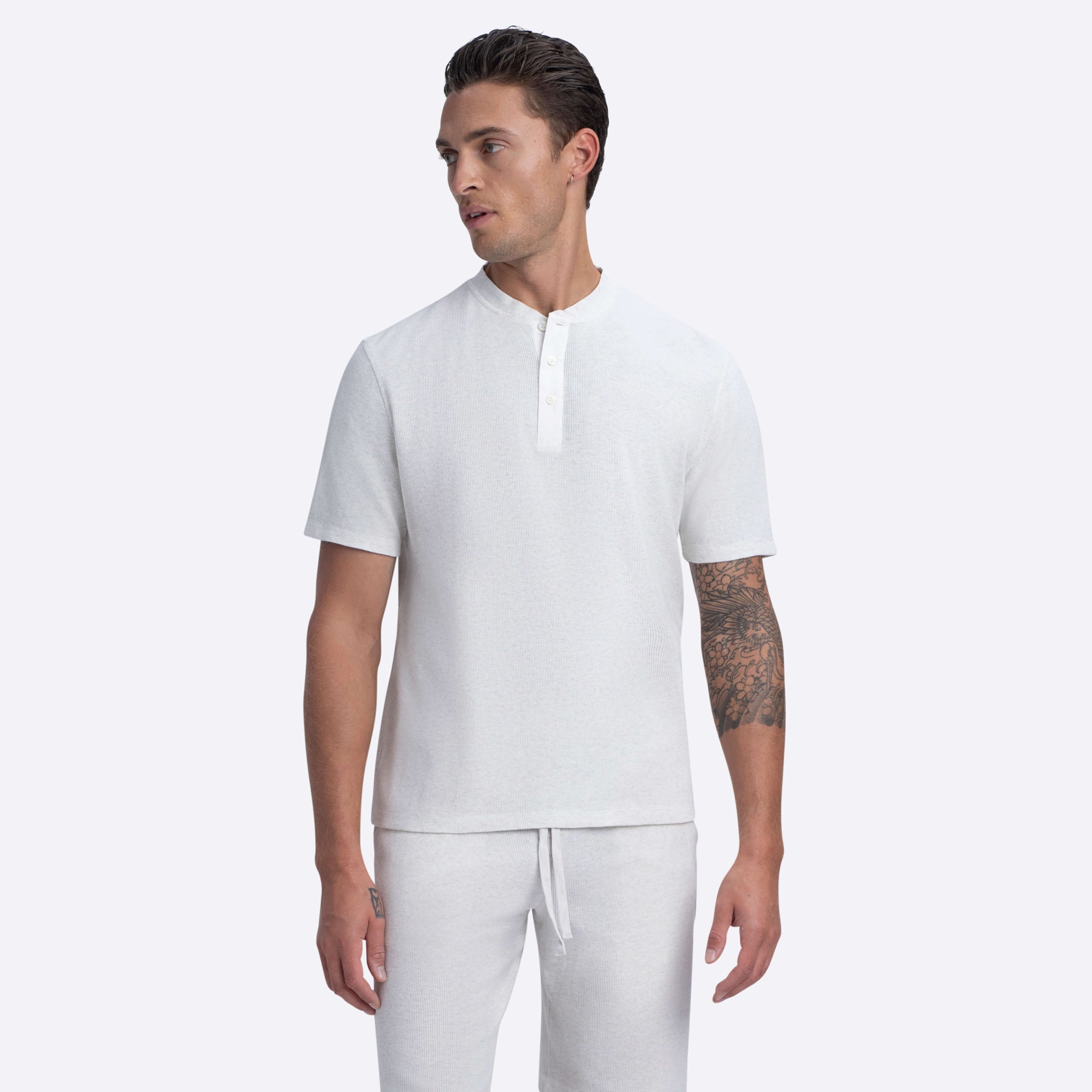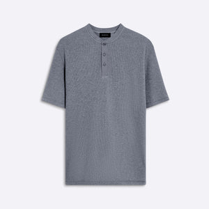 Short sleeve heather henley in heather waffle COMFORT 100% cotton with ribbed collar and three button placket.