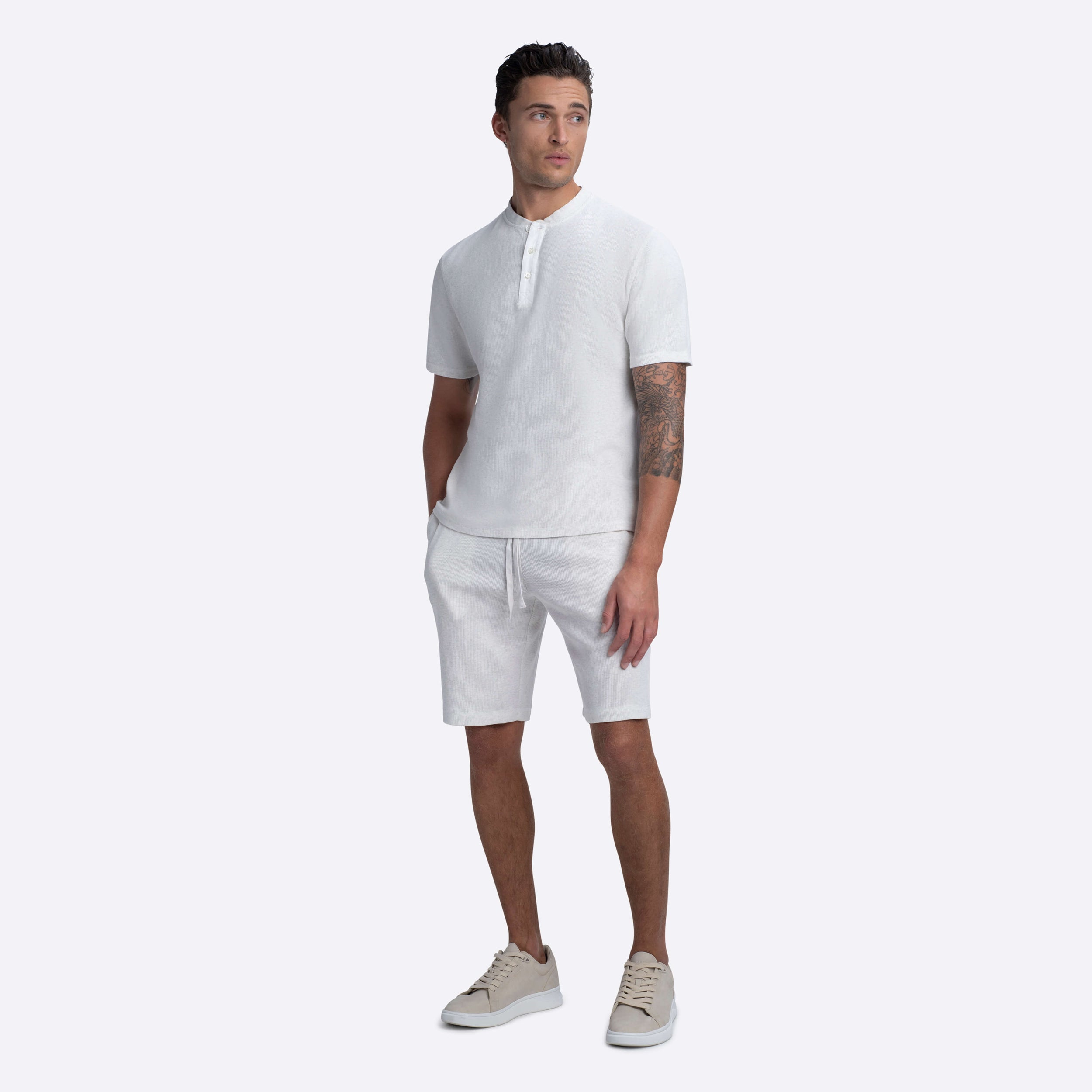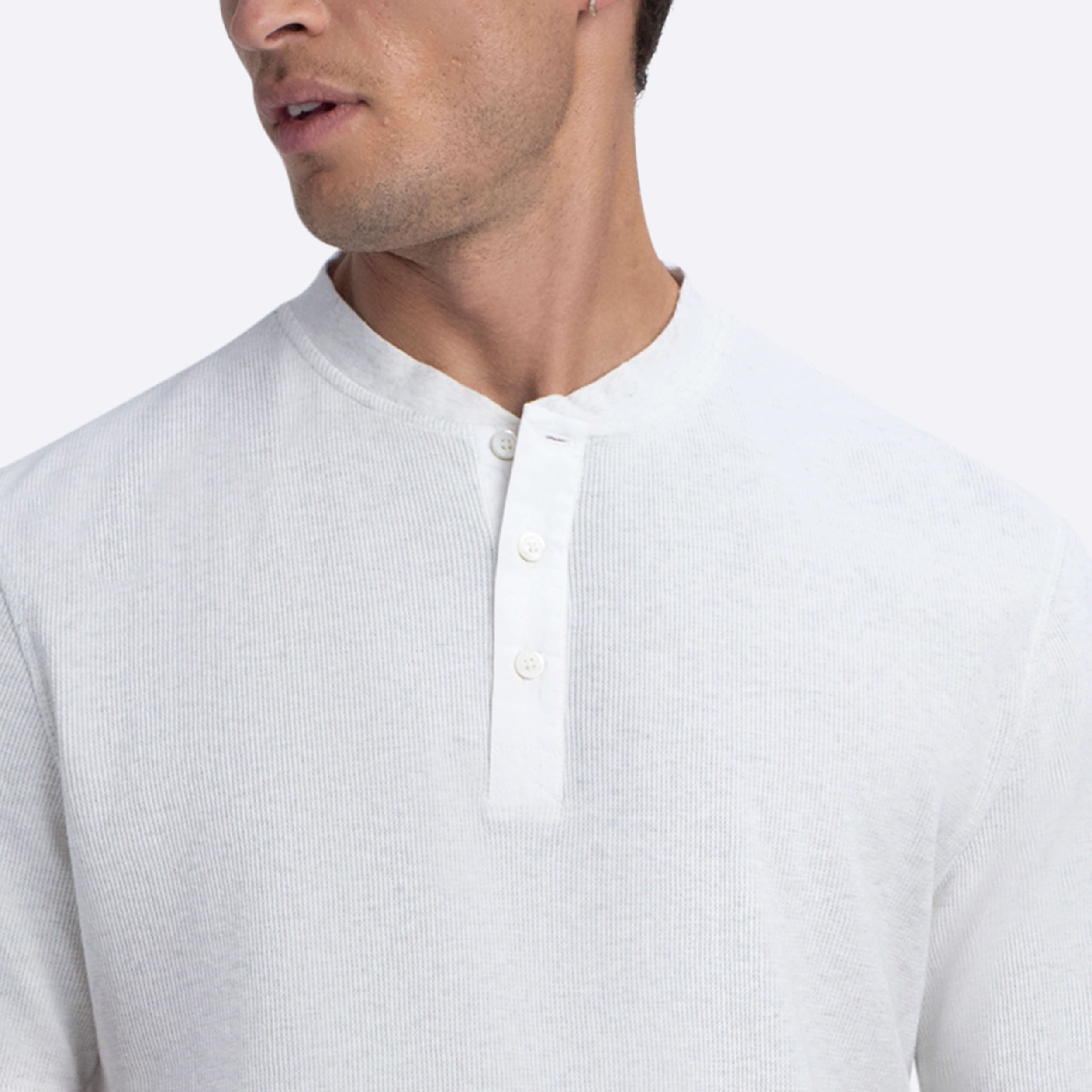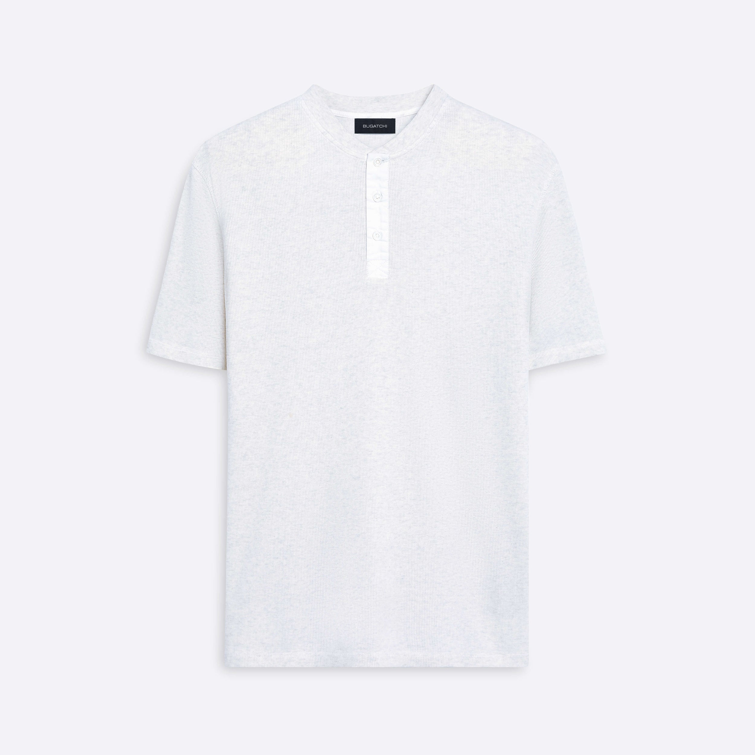 Short sleeve heather henley in heather waffle COMFORT 100% cotton with ribbed collar and three button placket.