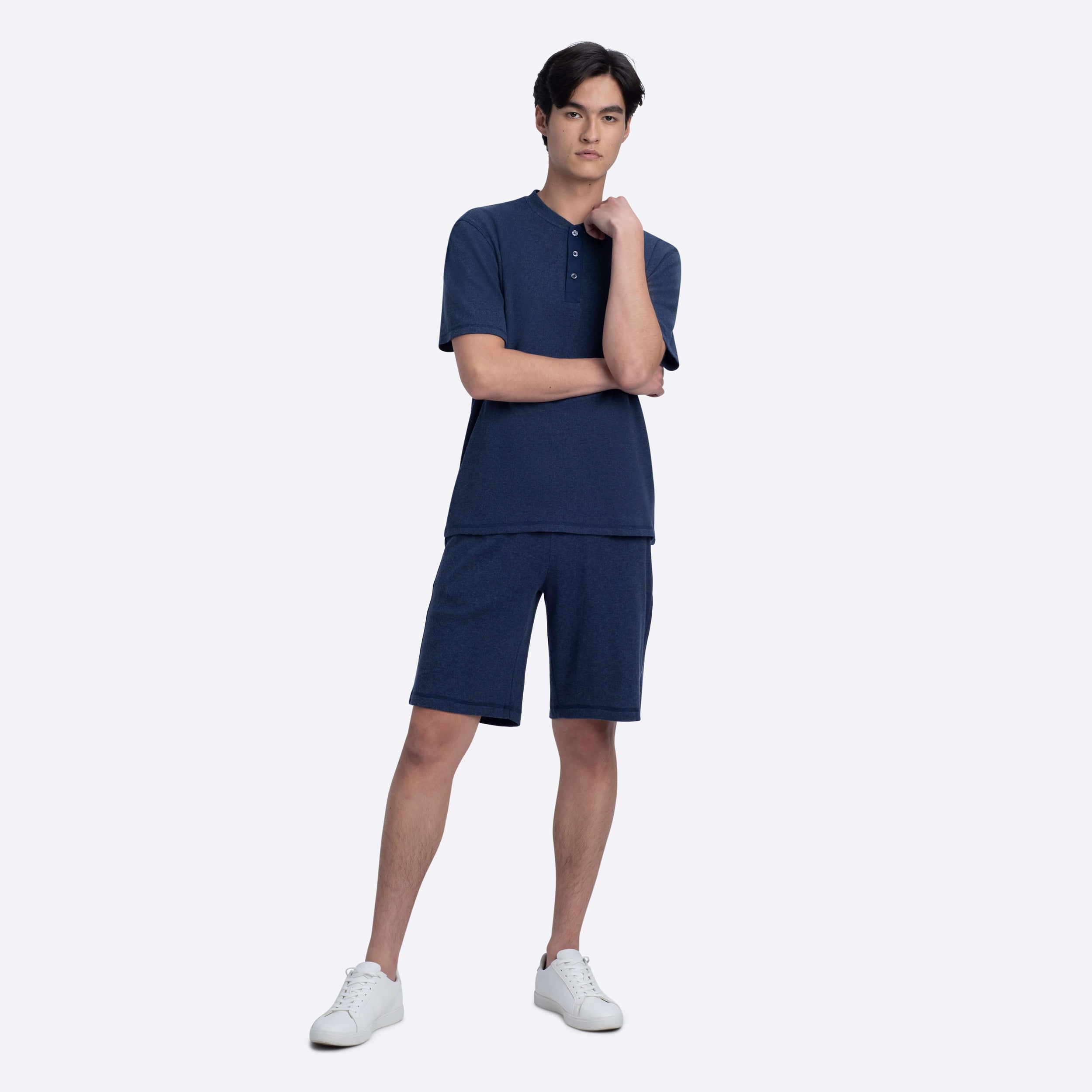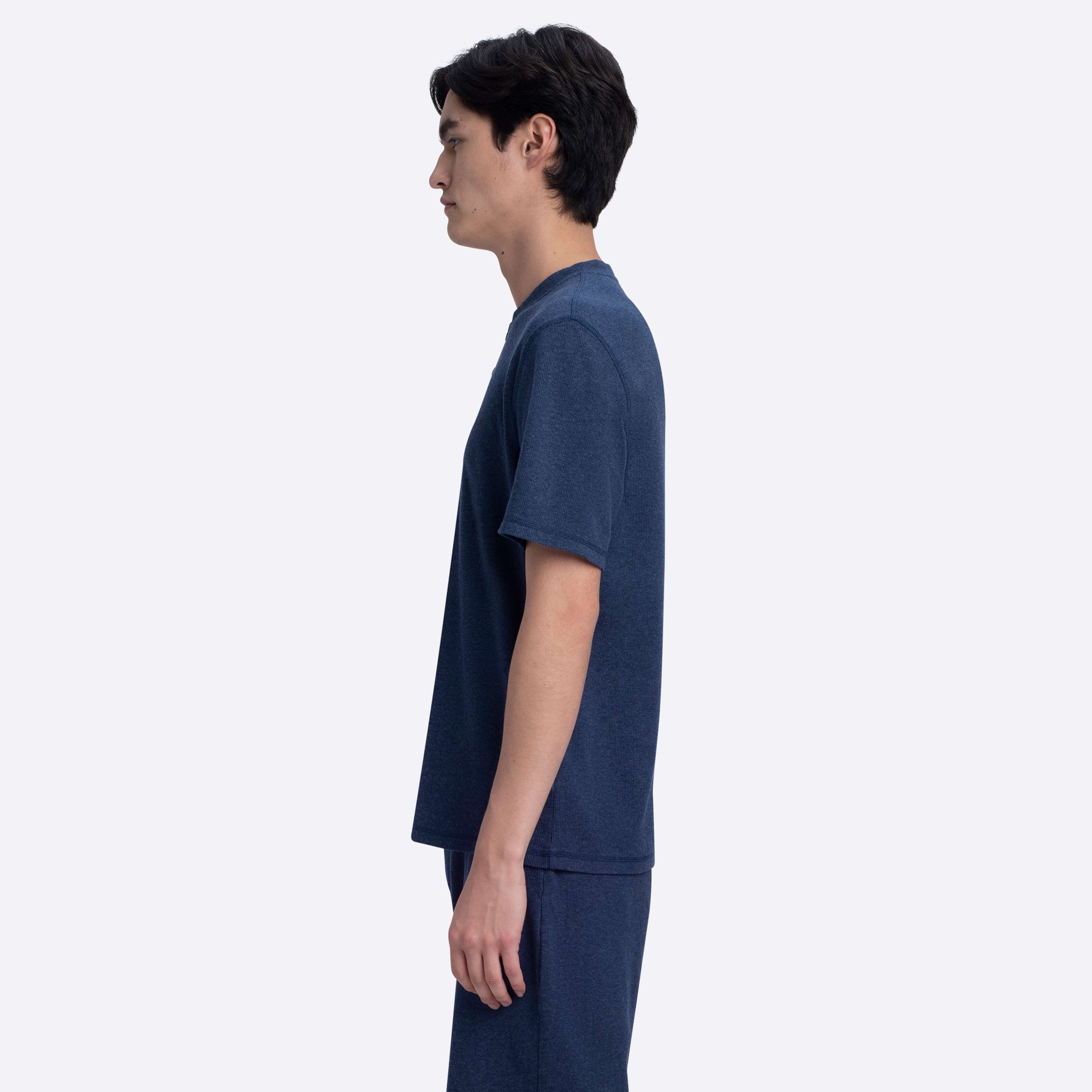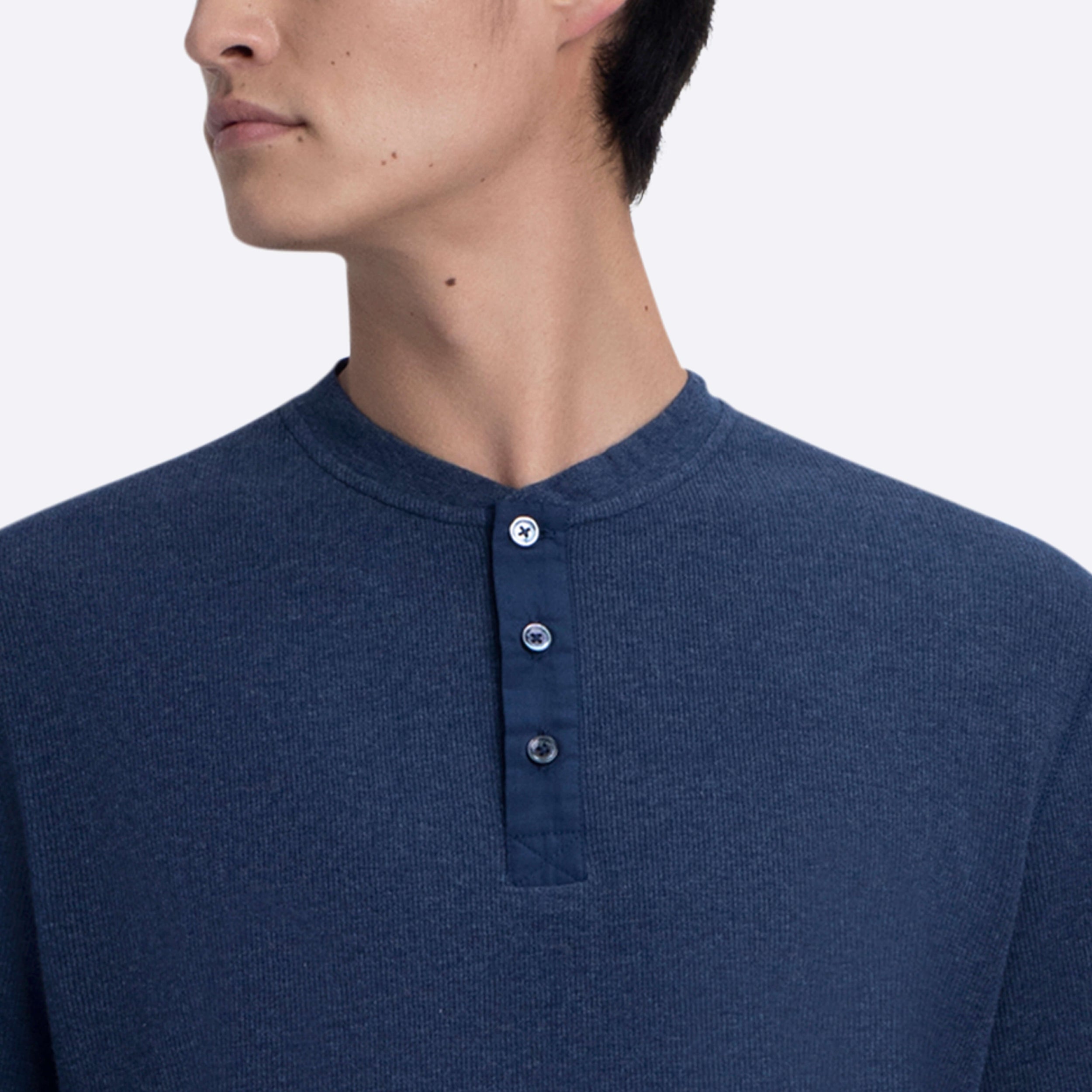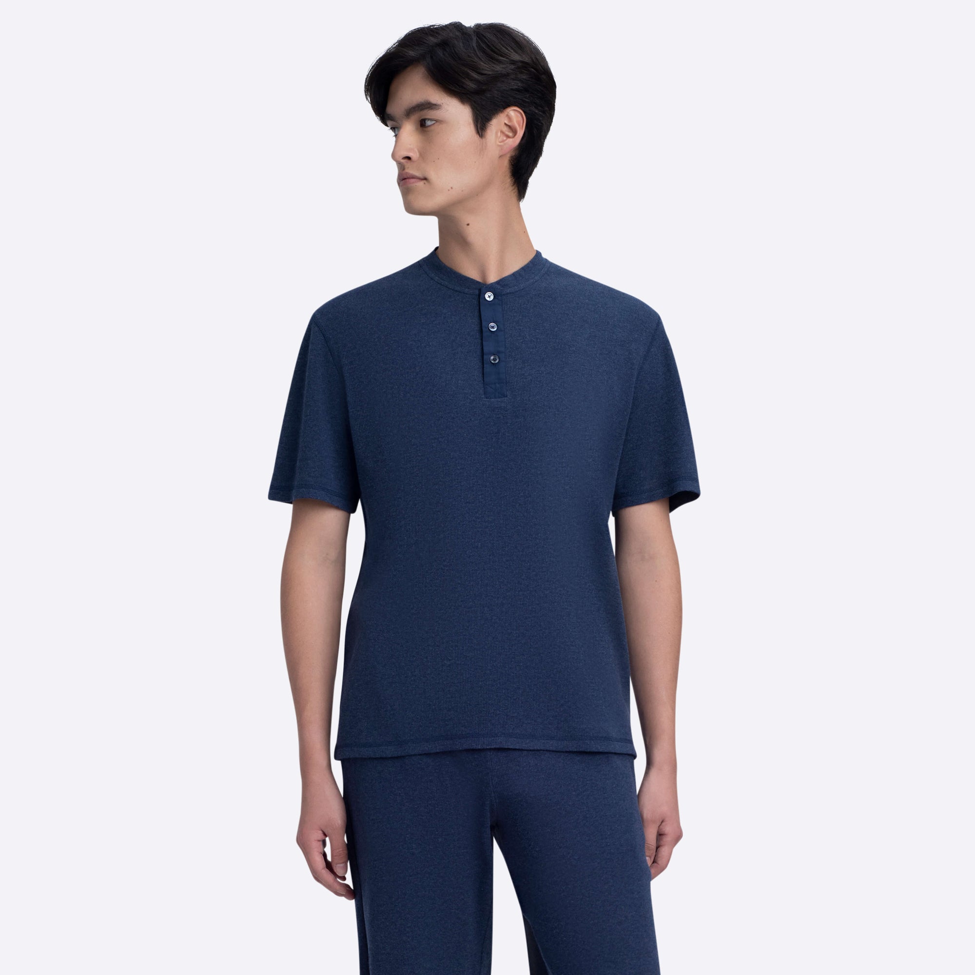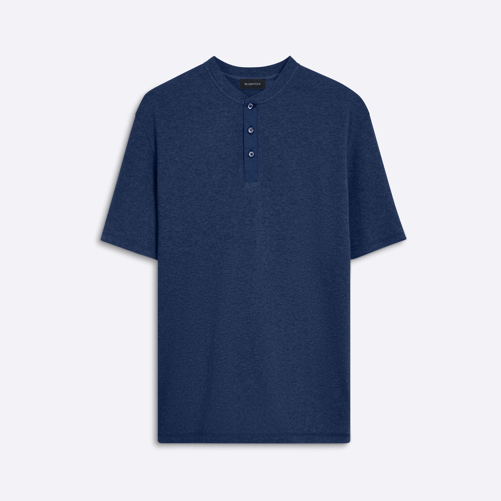 Short sleeve heather henley in heather waffle COMFORT 100% cotton with ribbed collar and three button placket.