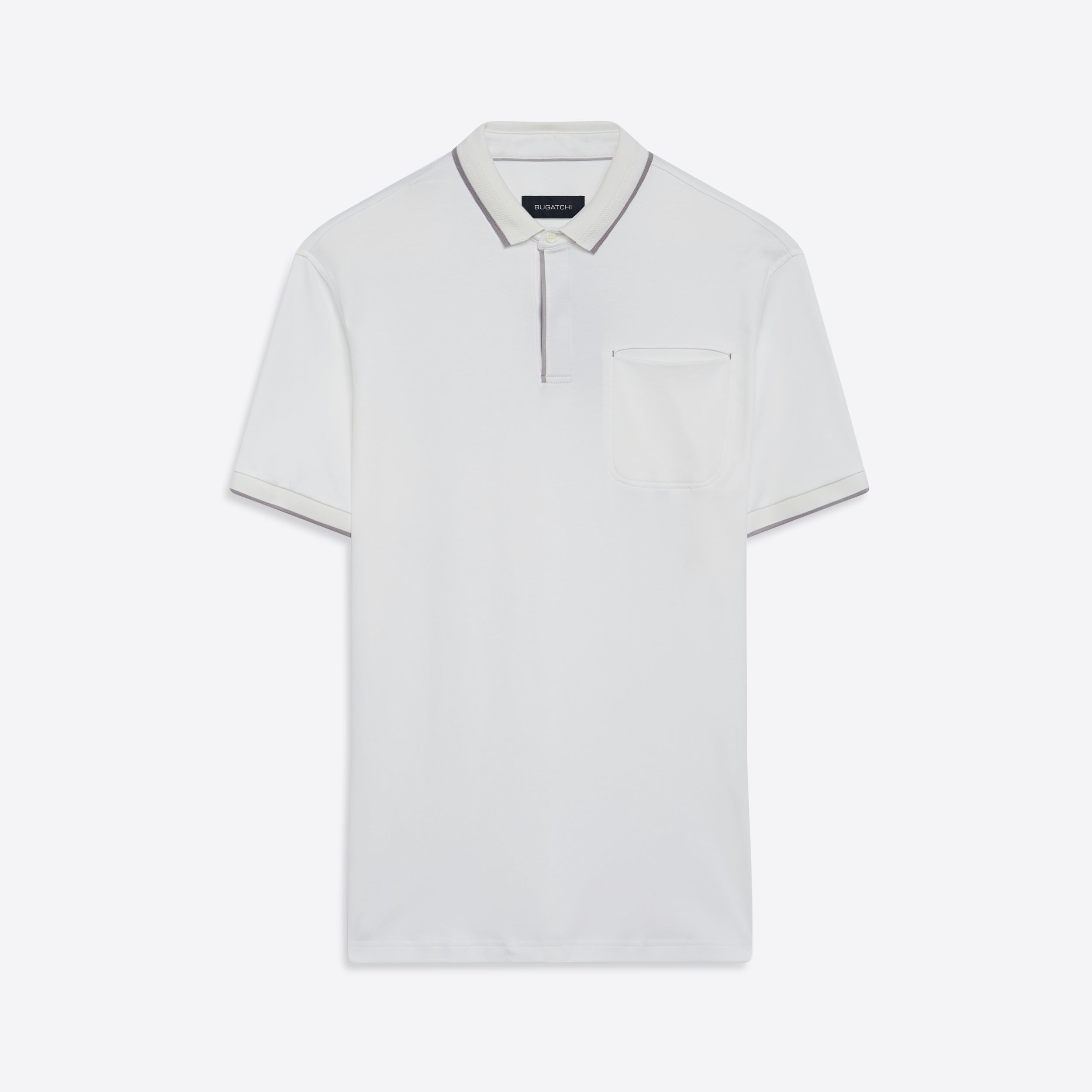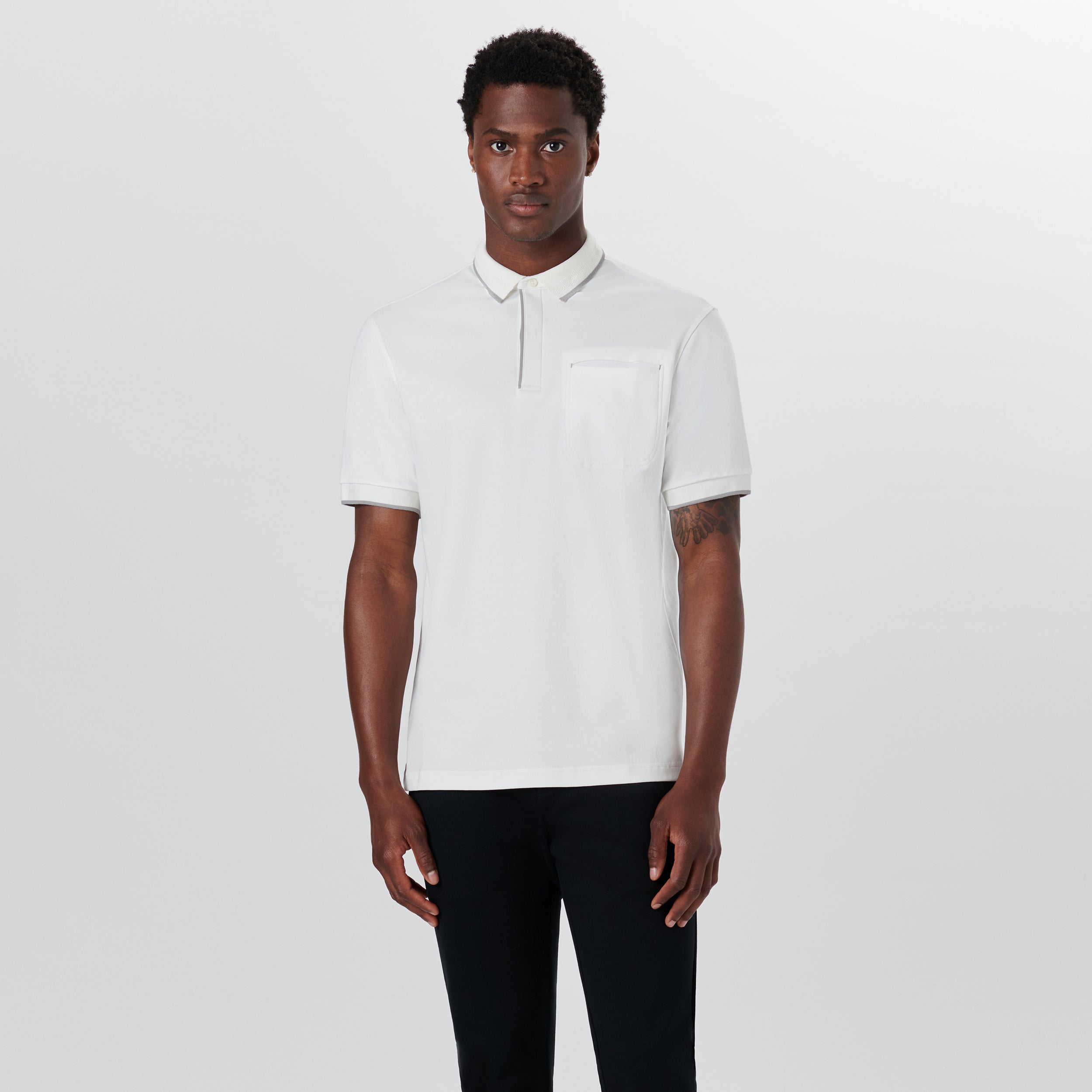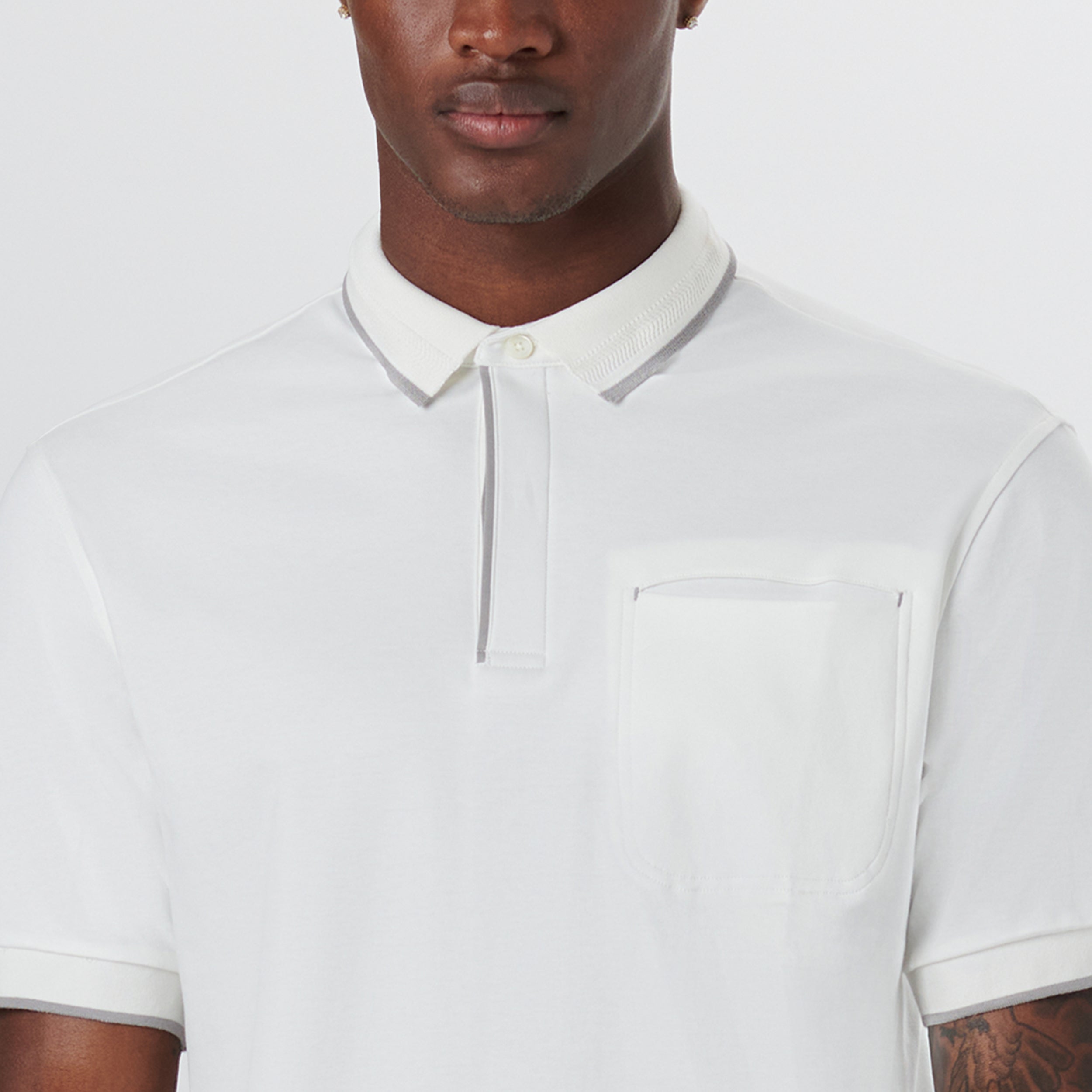 Short sleeve polo in 100% pima cotton with two button covered placket, chest pocket and chevron stripe detailed solid polo collar.