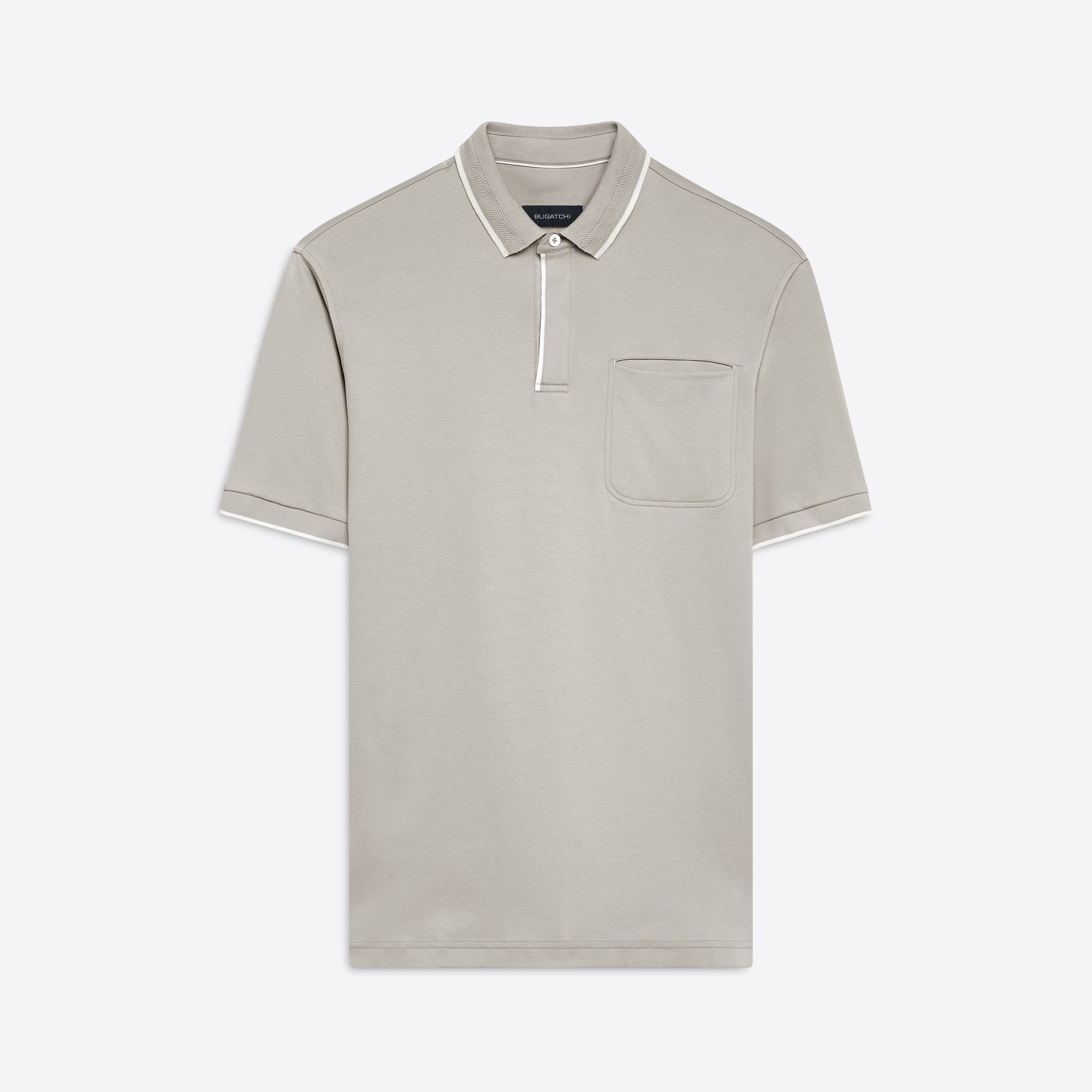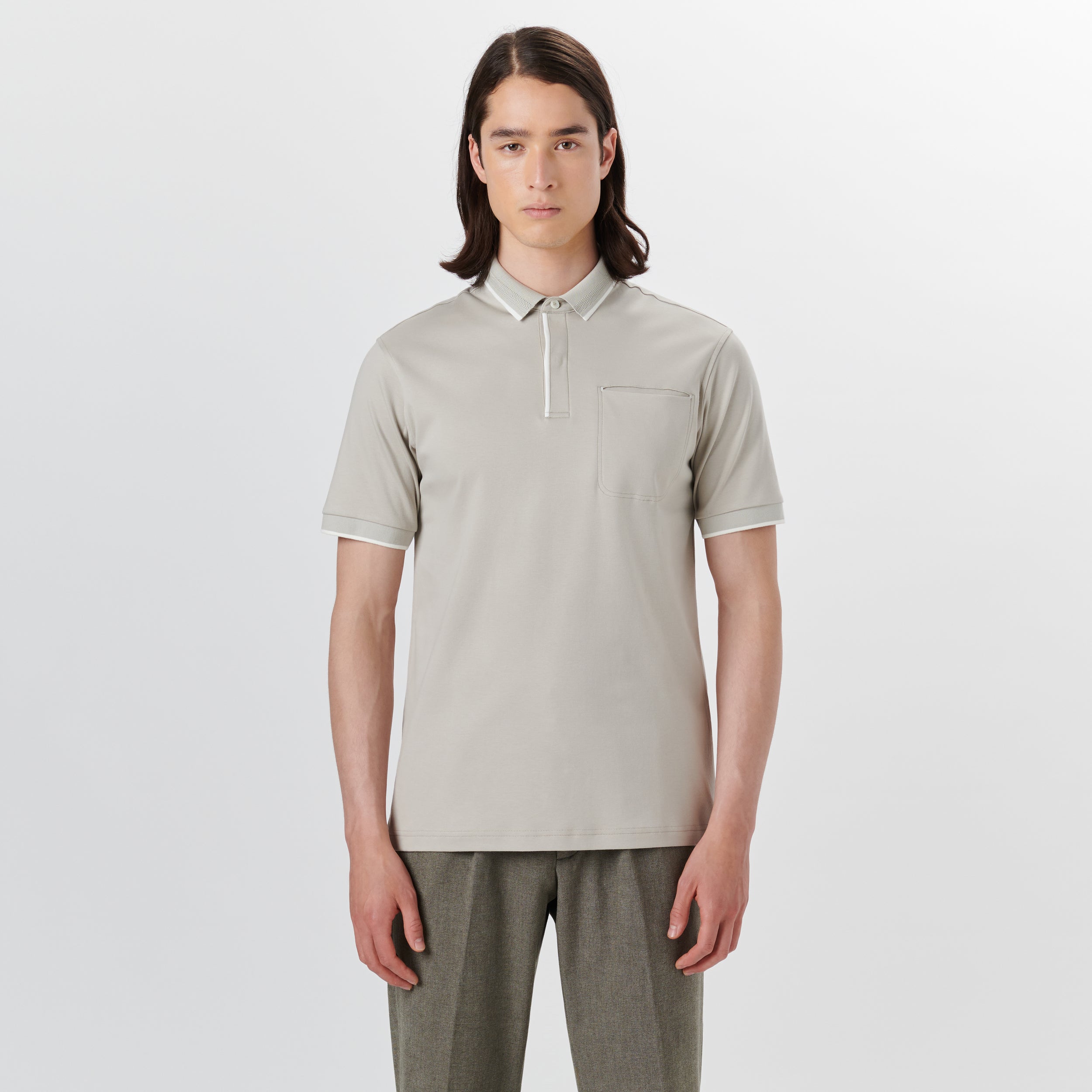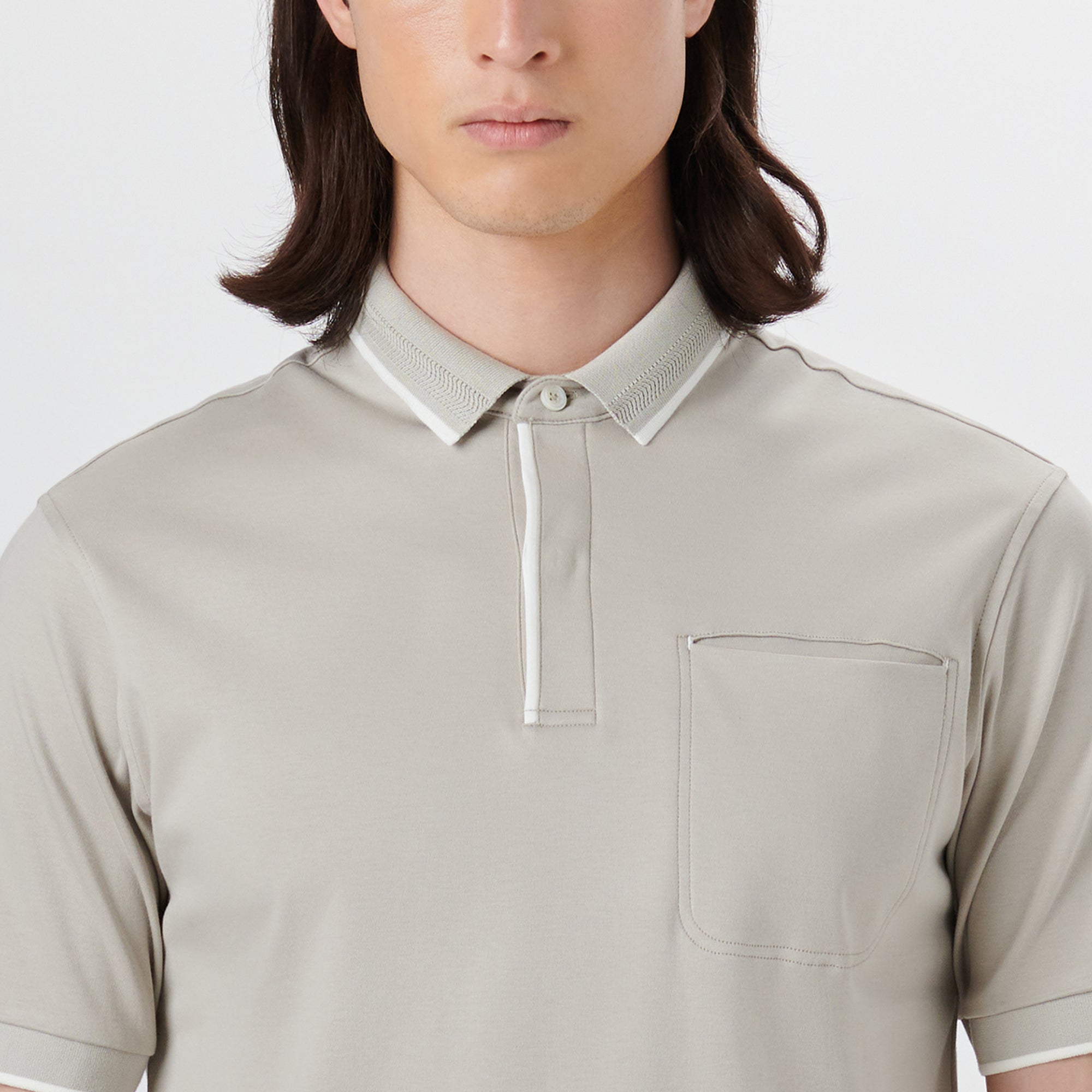 Short sleeve polo in 100% pima cotton with two button covered placket, chest pocket and chevron stripe detailed solid polo collar.