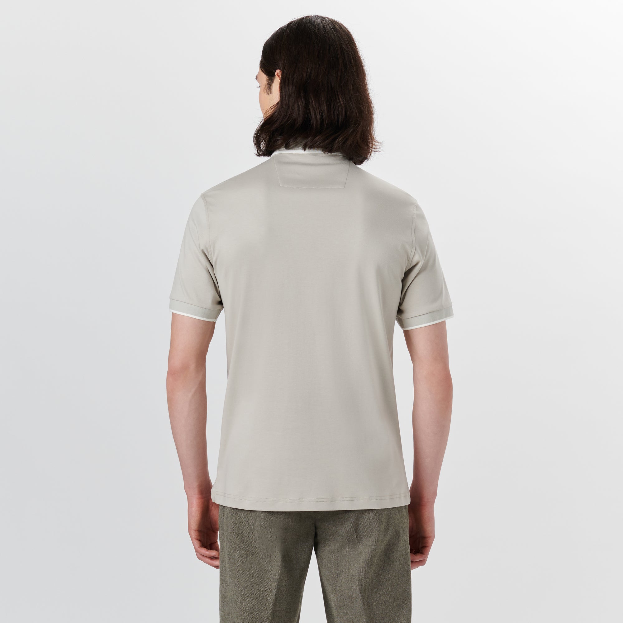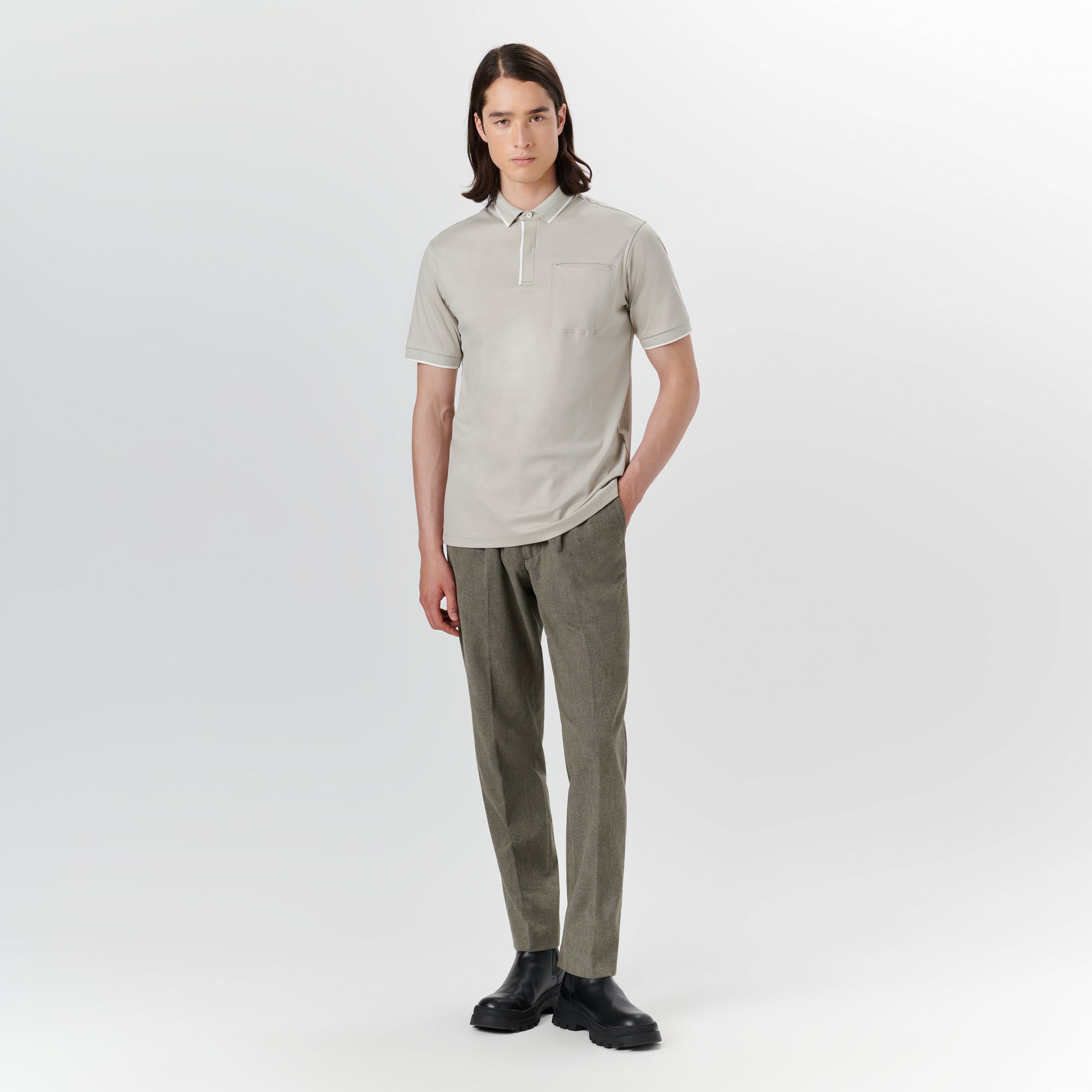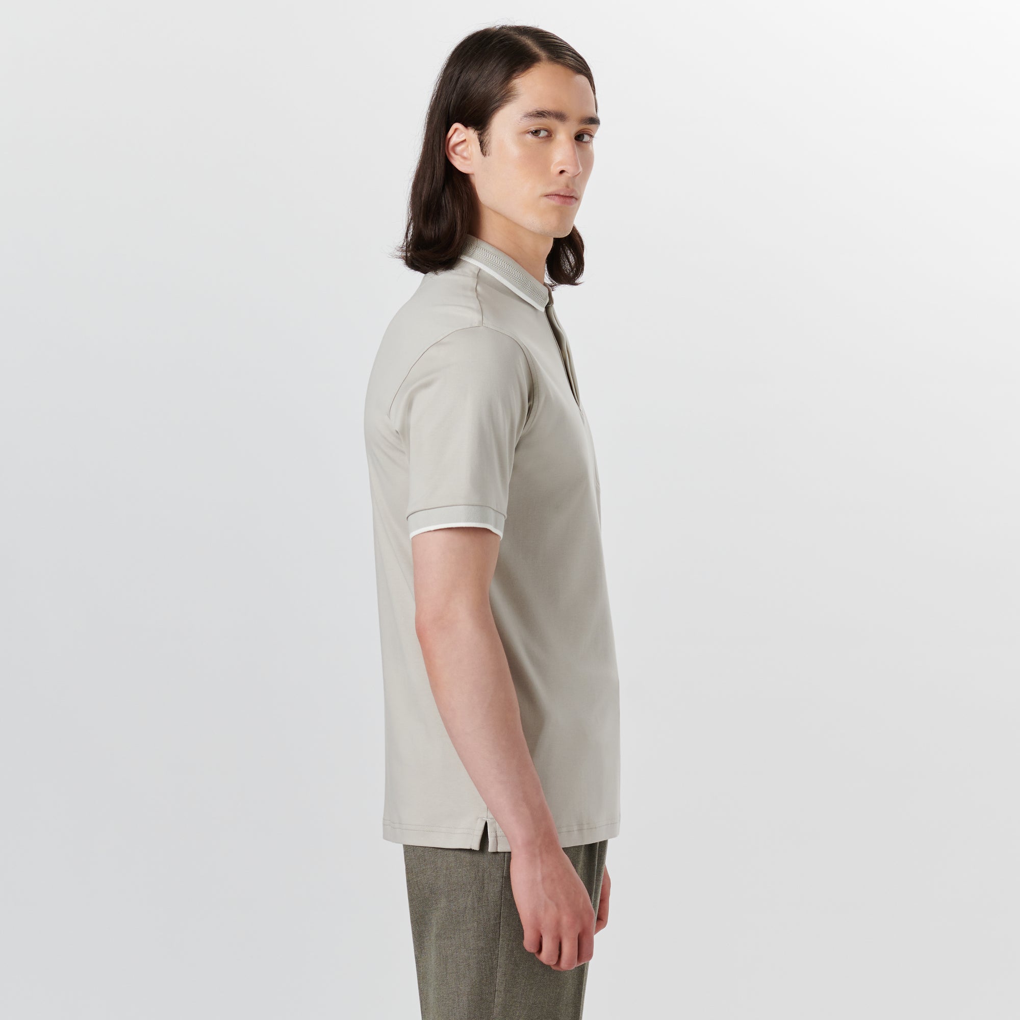 Short sleeve polo in 100% pima cotton with two button covered placket, chest pocket and chevron stripe detailed solid polo collar.