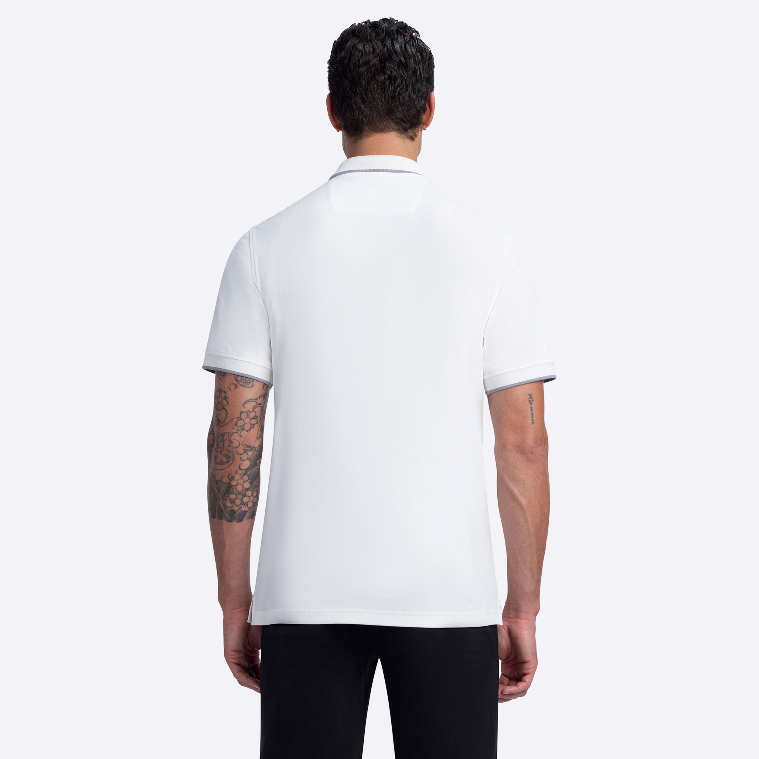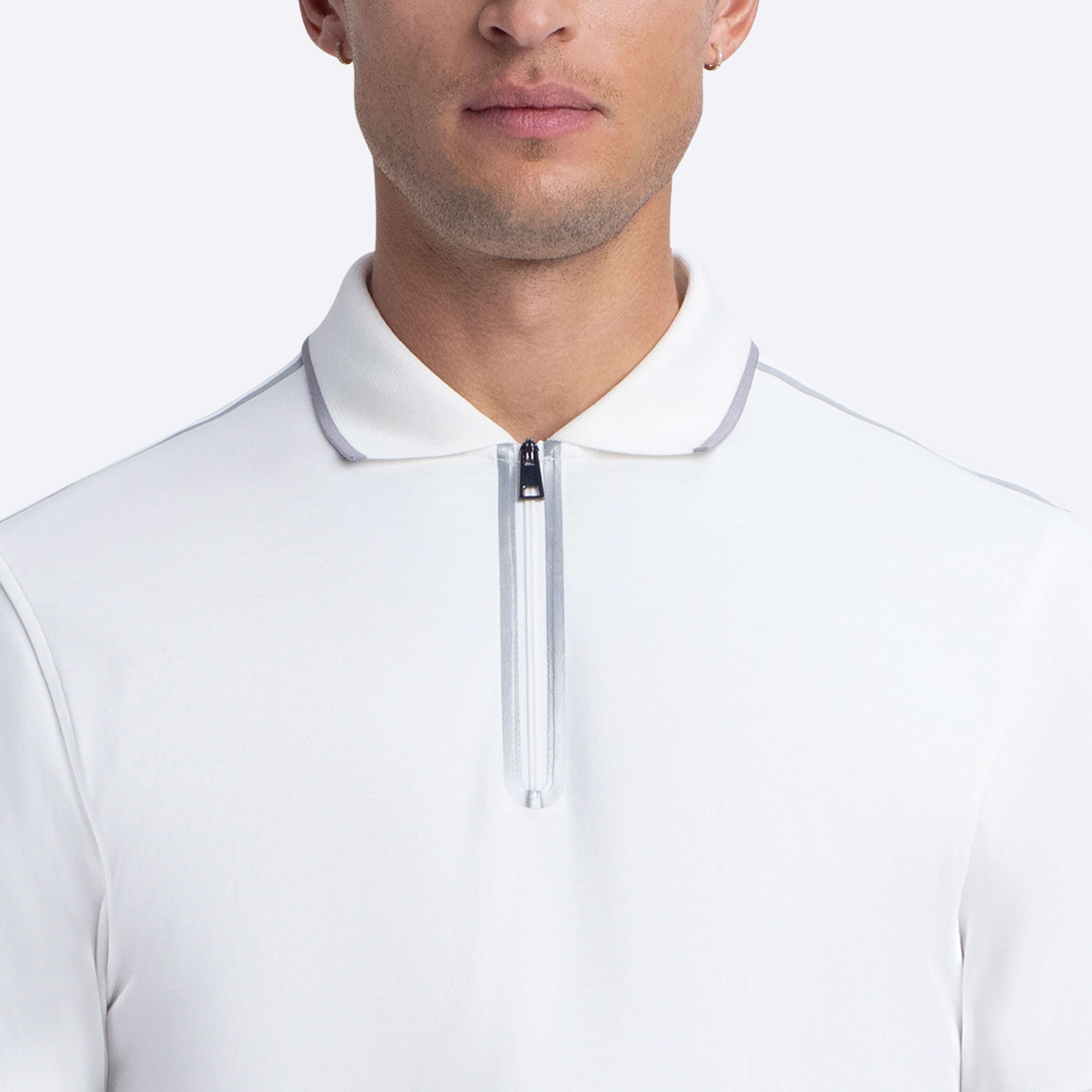 Short sleeve quarter zip polo in 100% Pima cotton with contrast rubber bonding tape and tipped rib collar and arm bands.