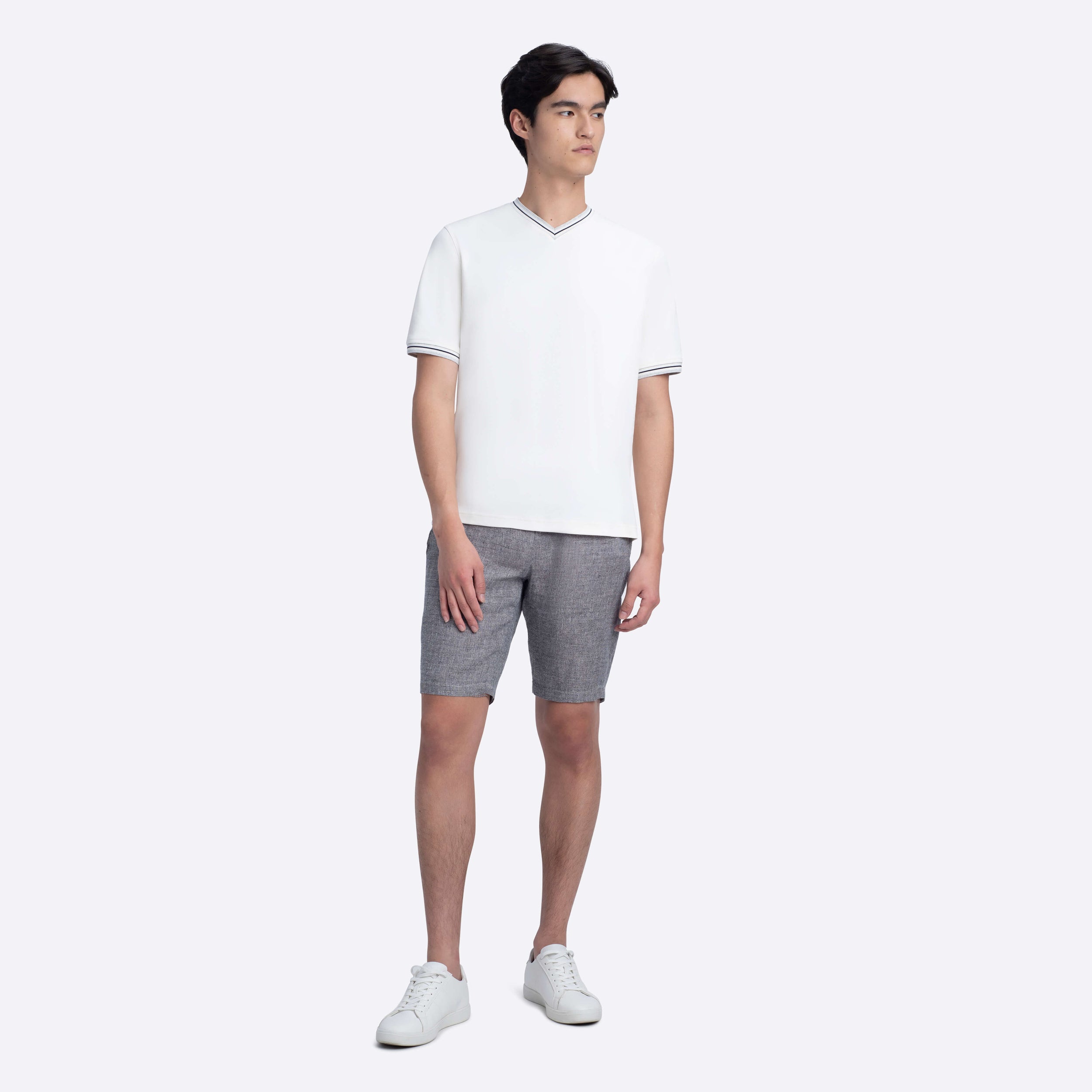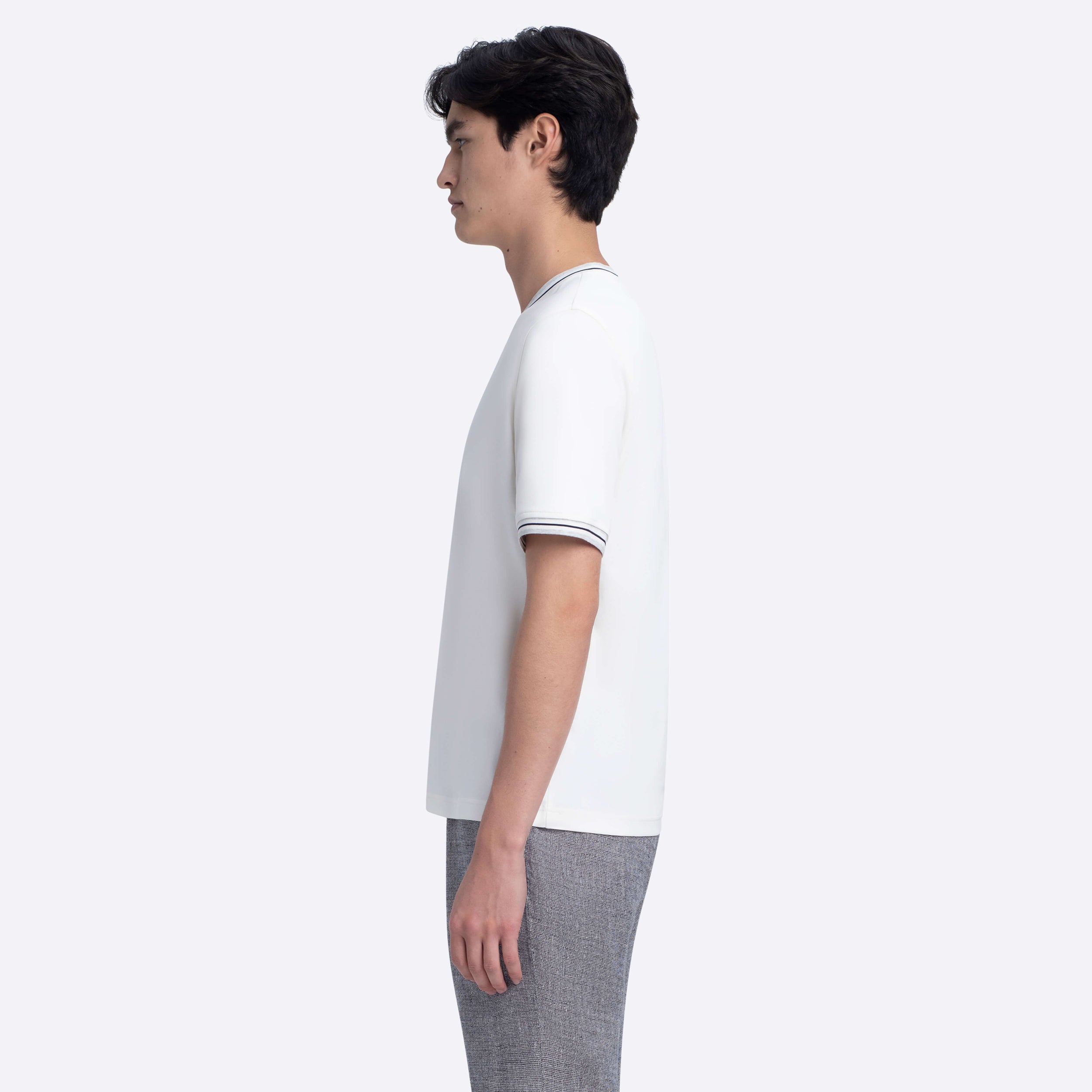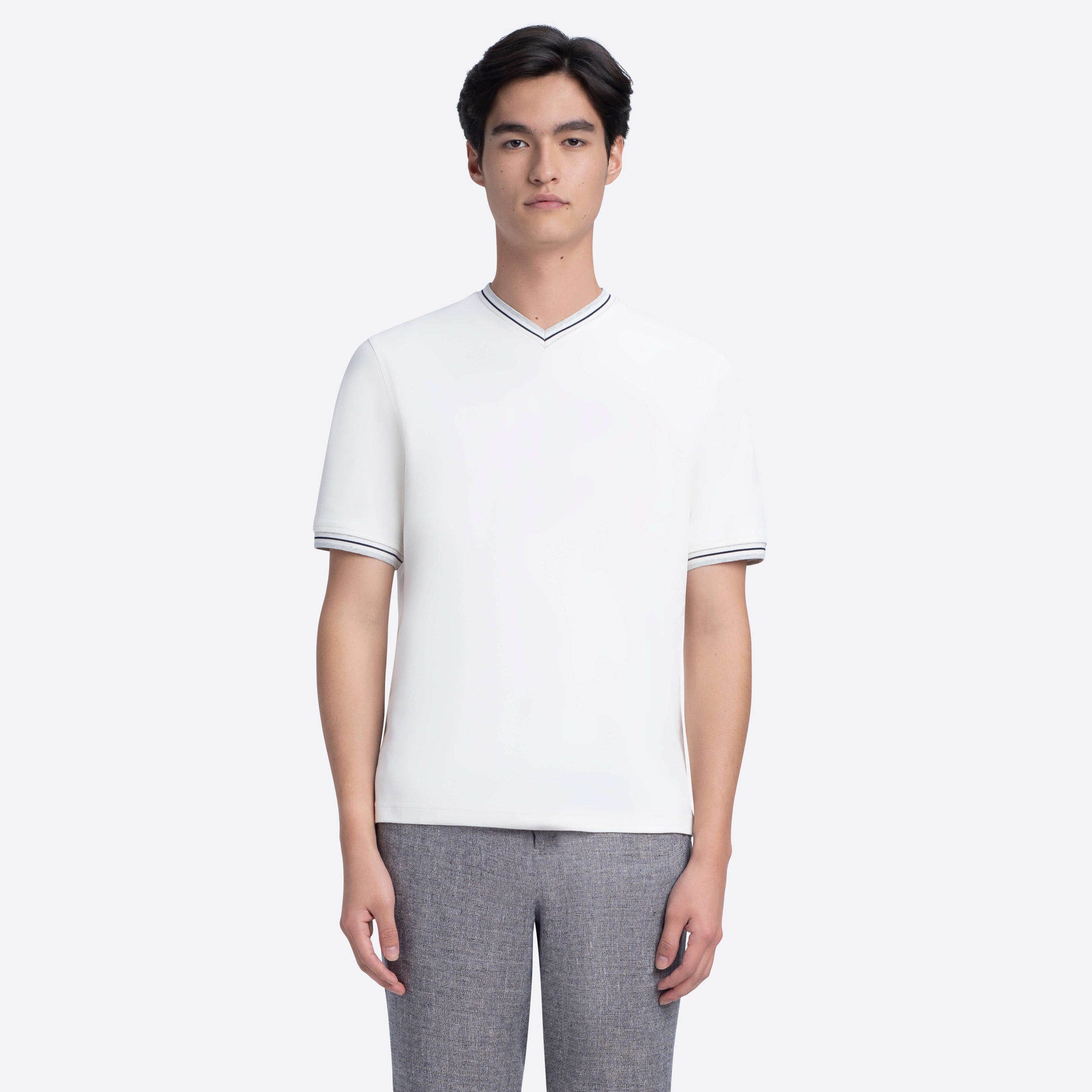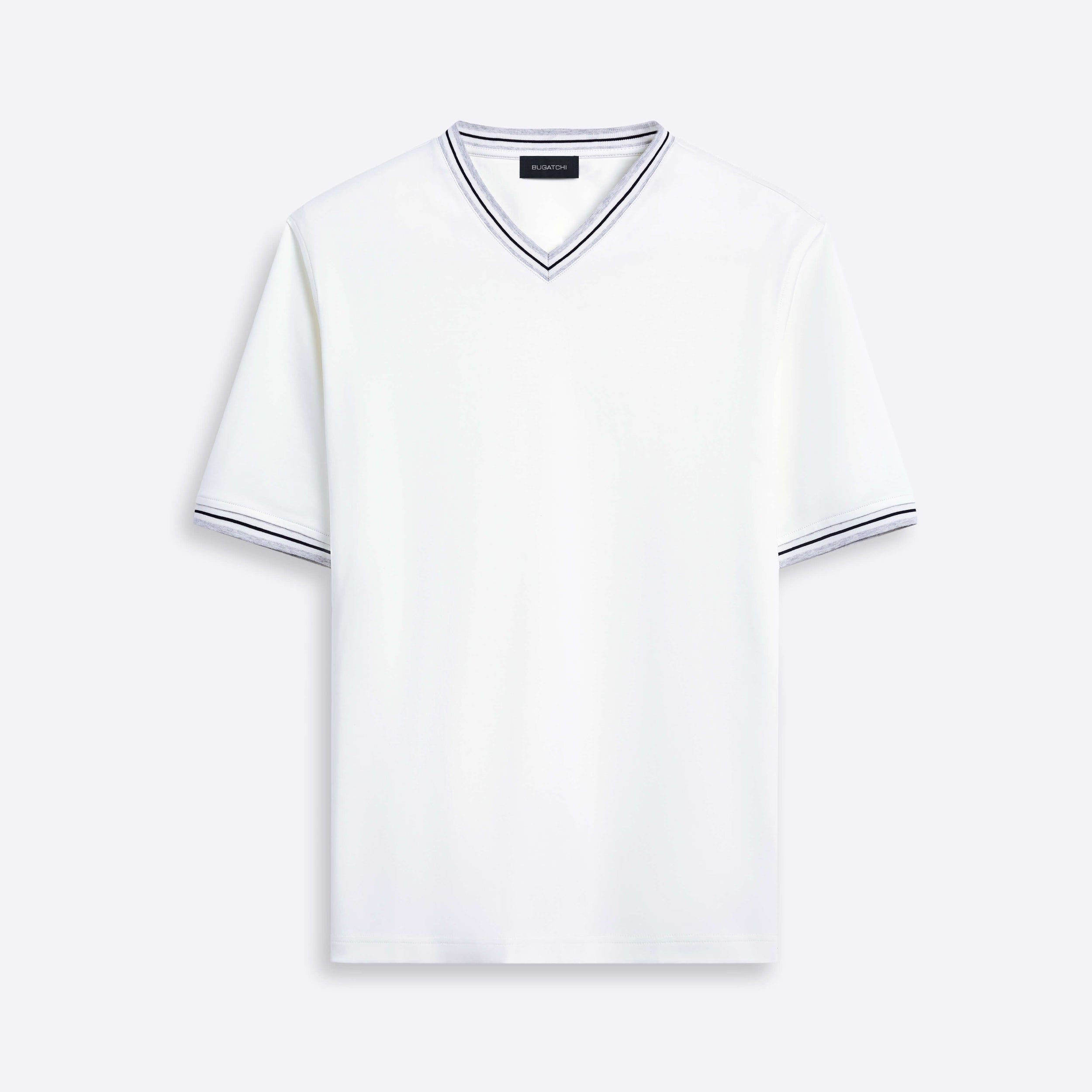 Short sleeve V-neck shirt in 100% Pima cotton with contrast striped rib detail.