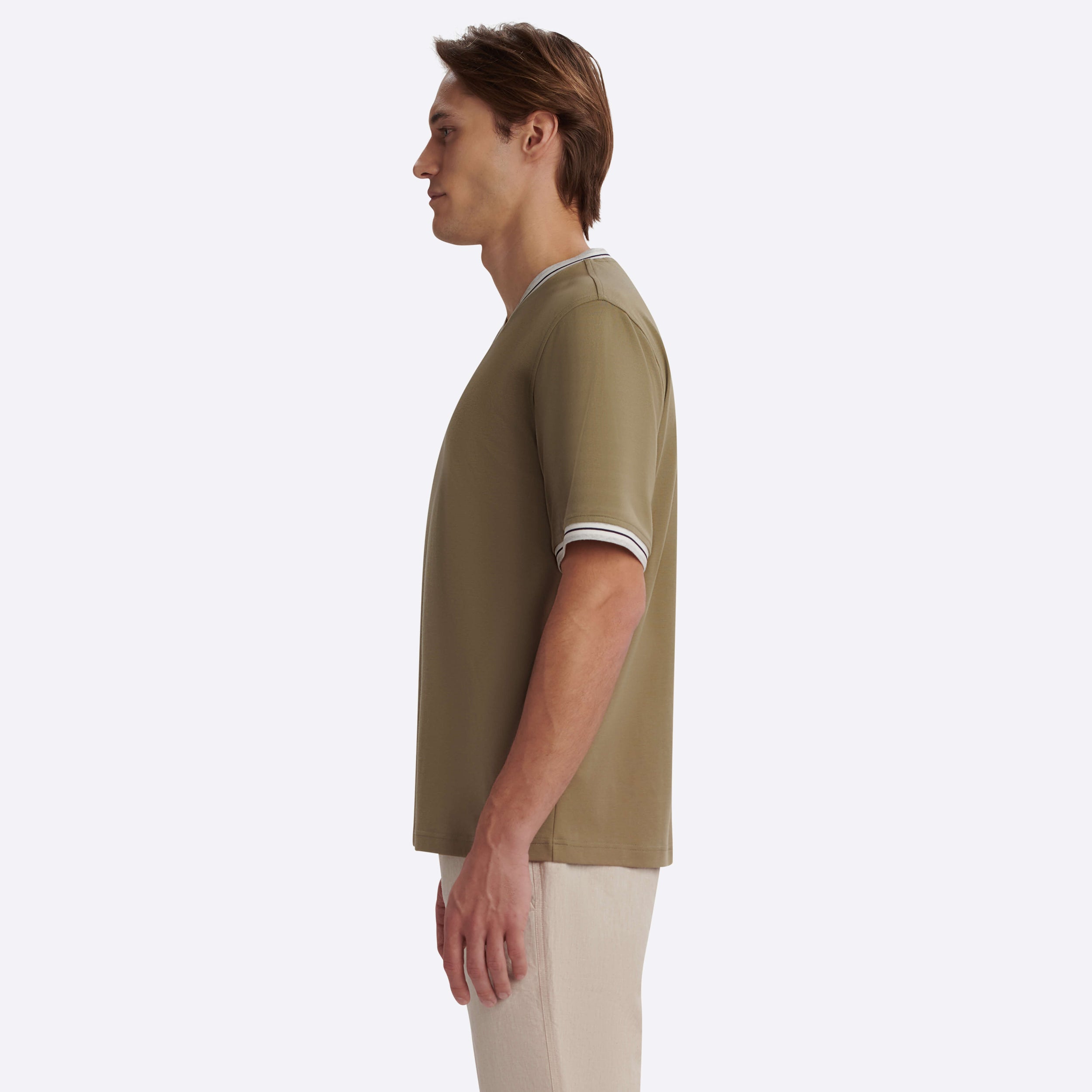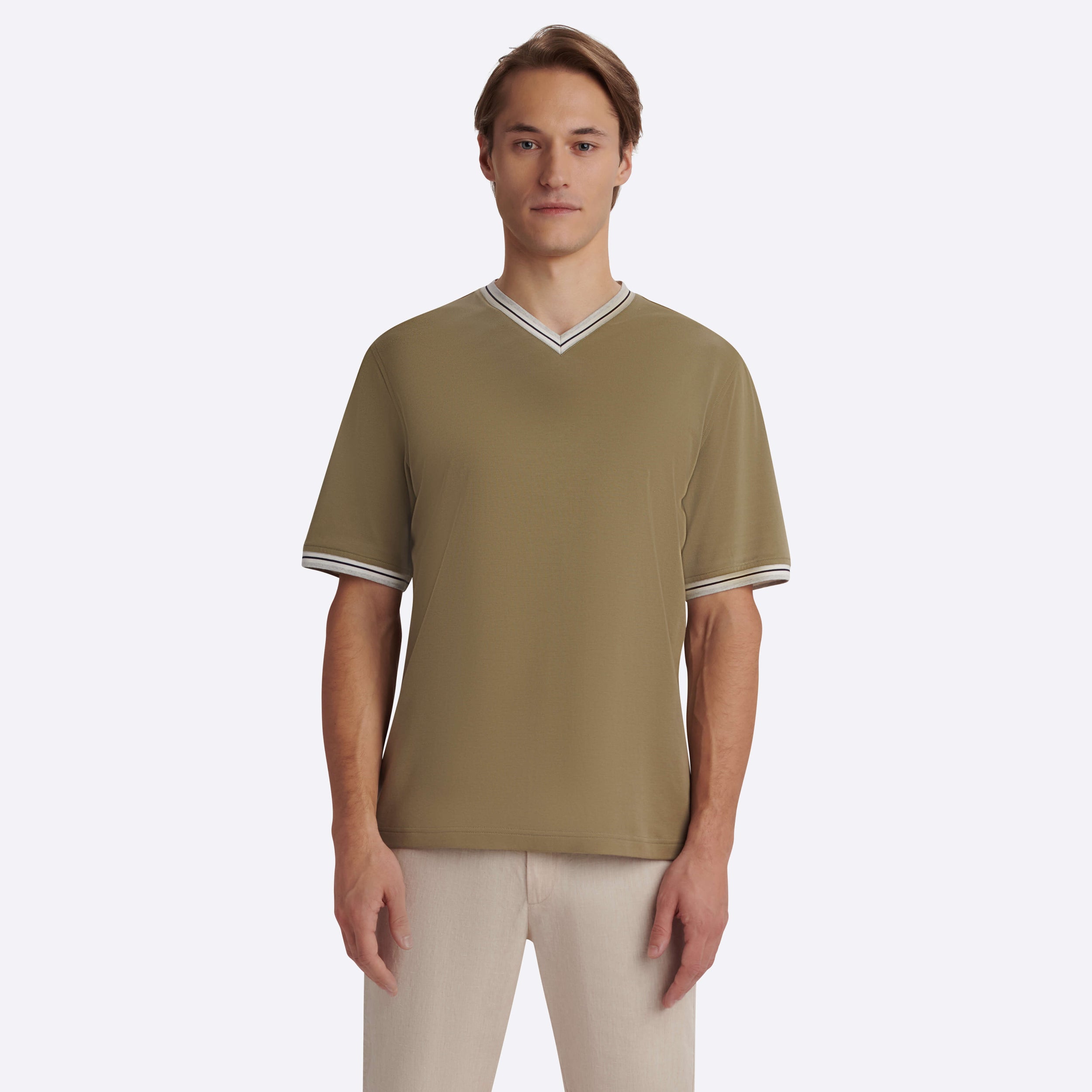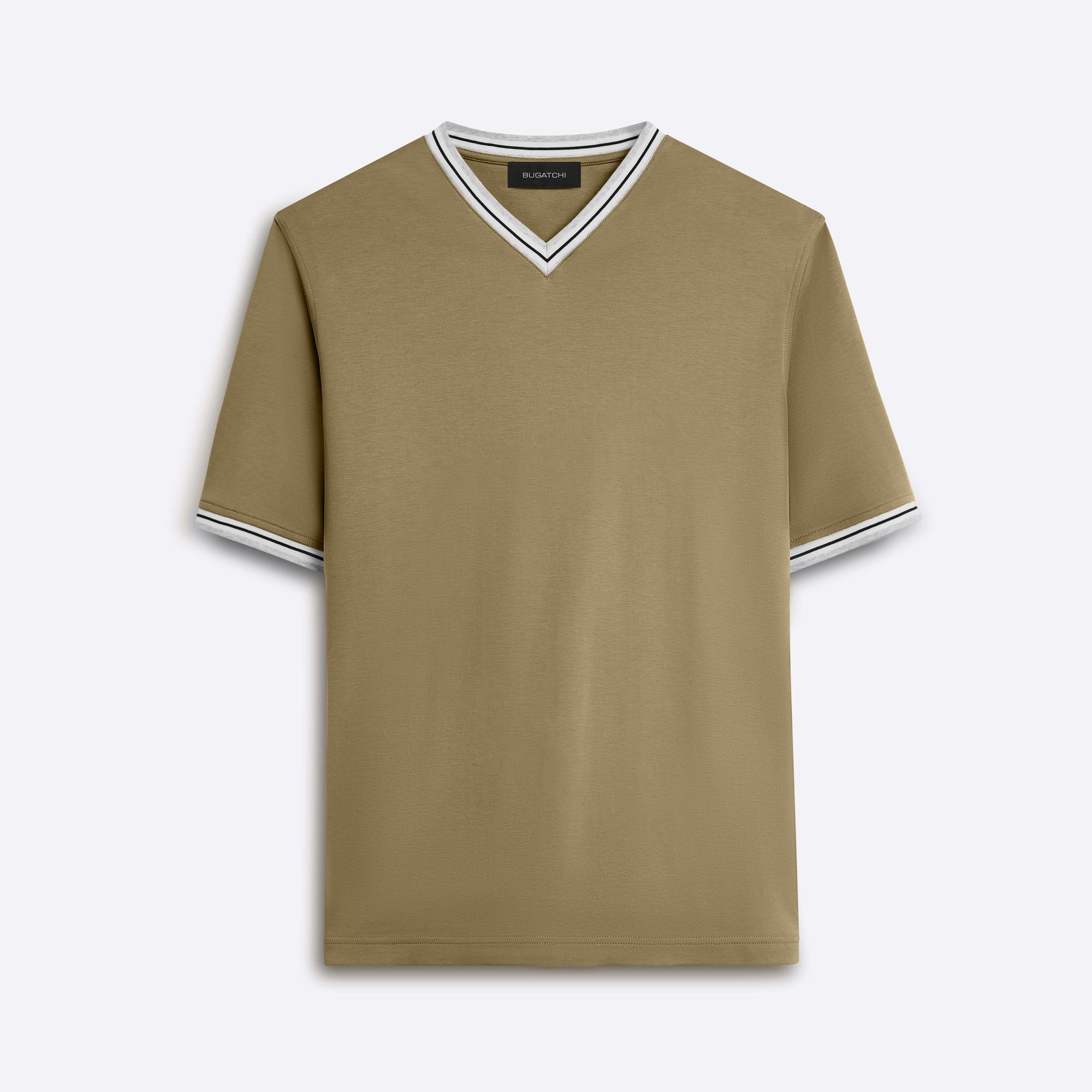 Short sleeve V-neck shirt in 100% Pima cotton with contrast striped rib detail.