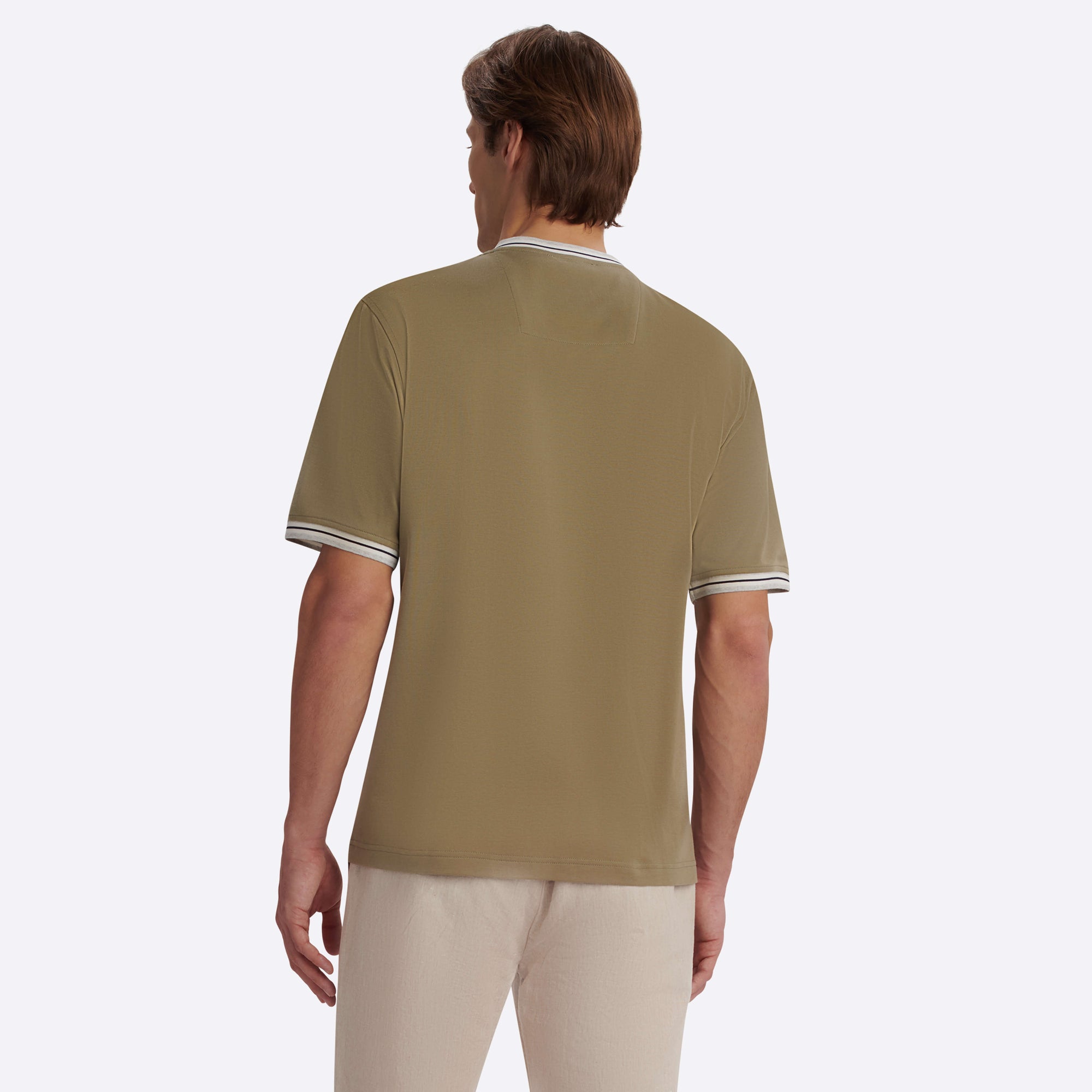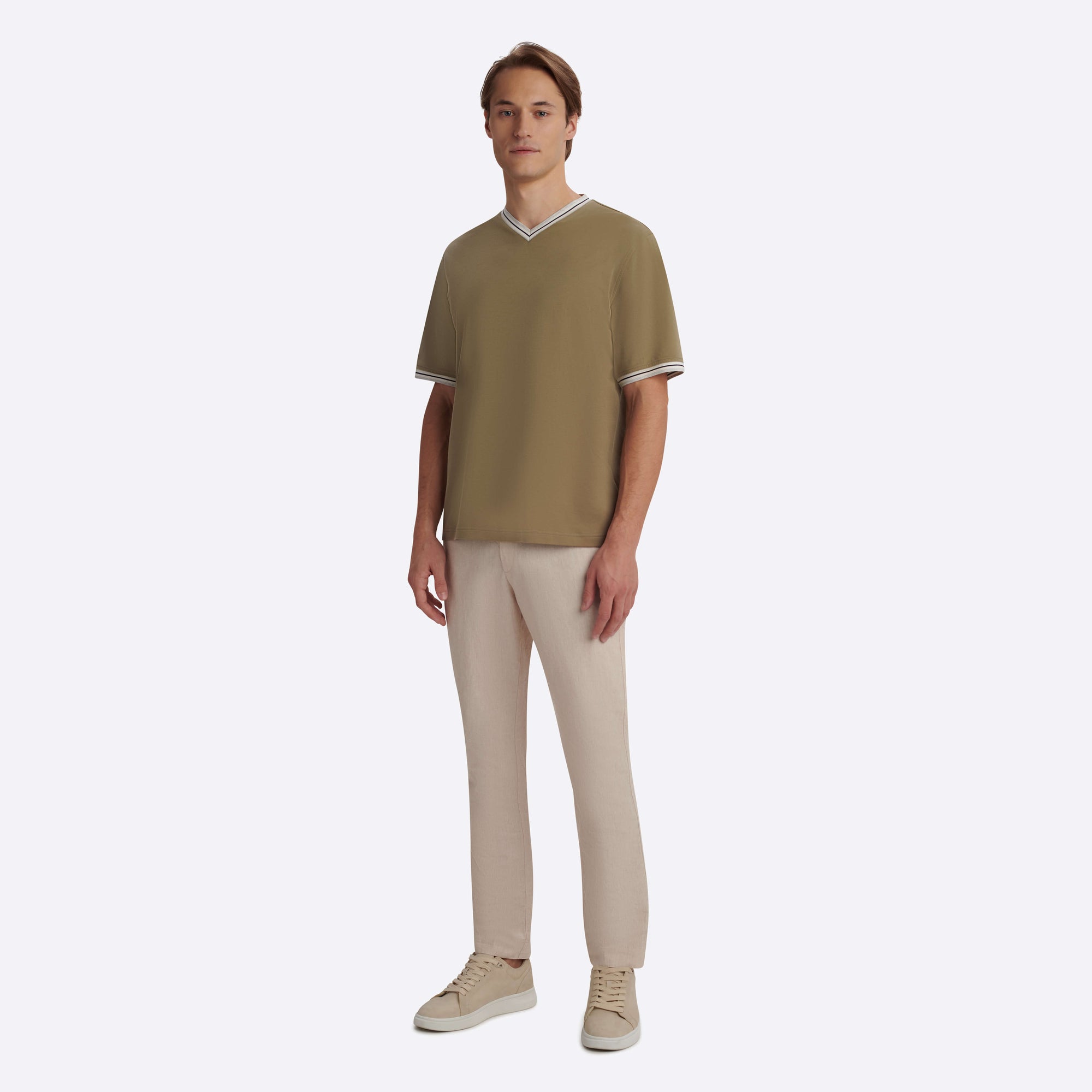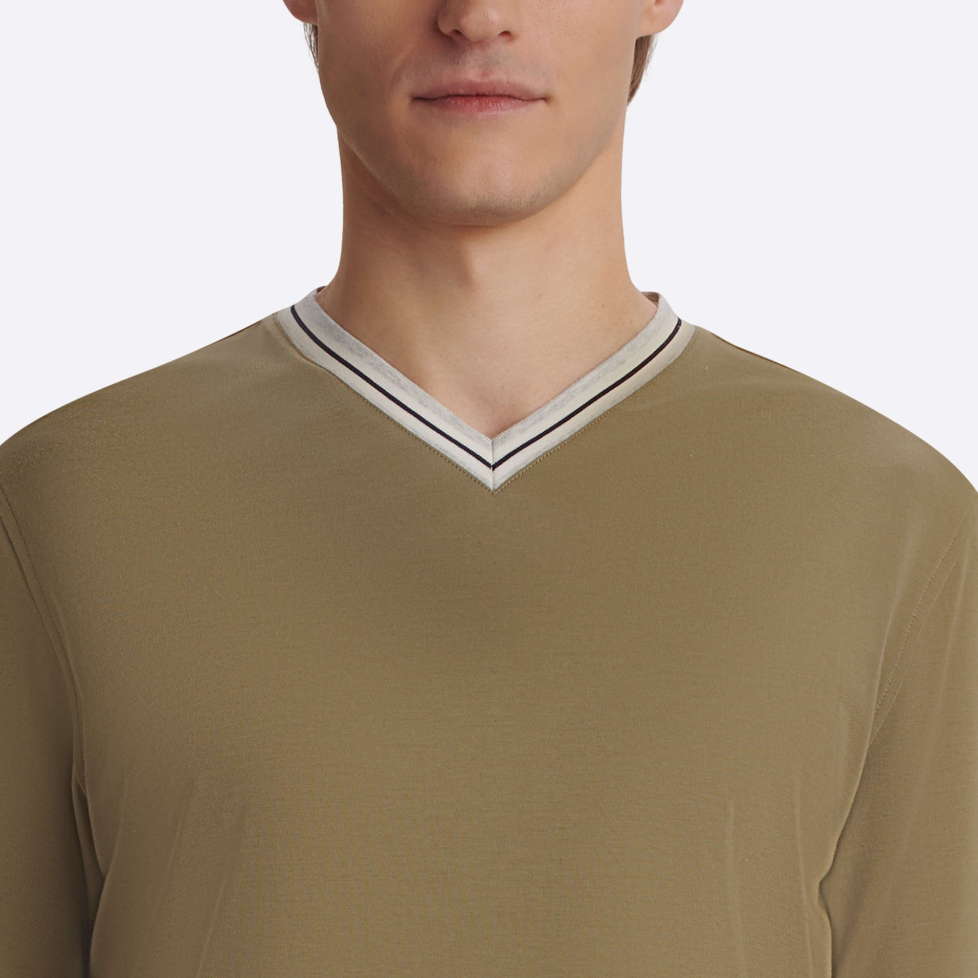 Short sleeve V-neck shirt in 100% Pima cotton with contrast striped rib detail.