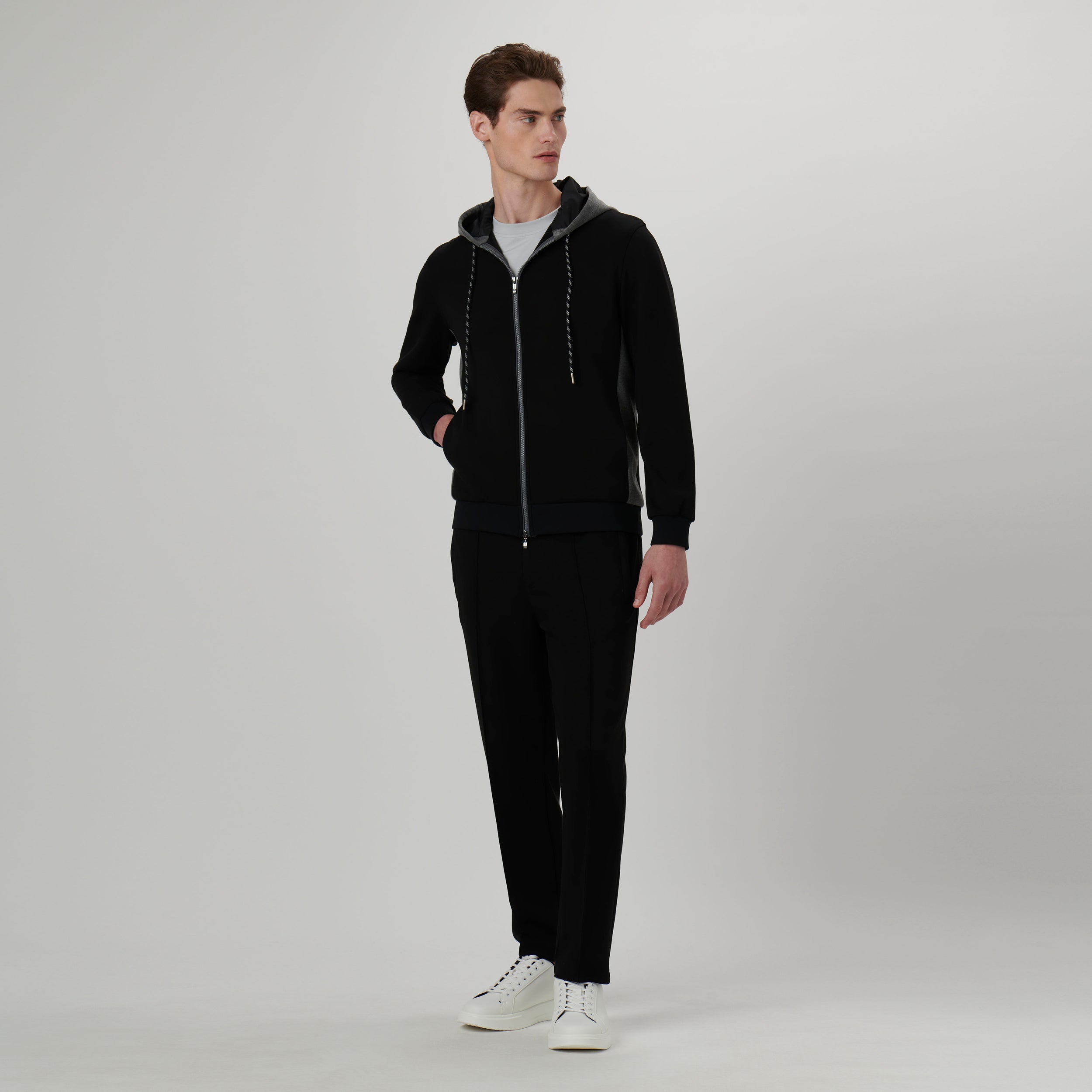 Solid jacket in thick in performance scuba fabric with adjustable drawstring hood, two-way zipper, contrast color detail and rib knit cuffs and waistband.