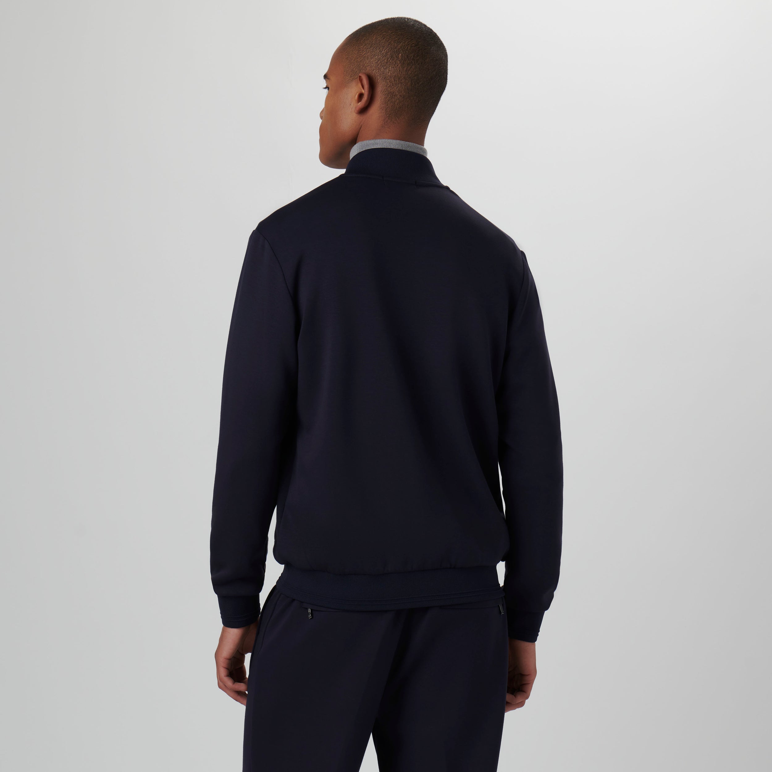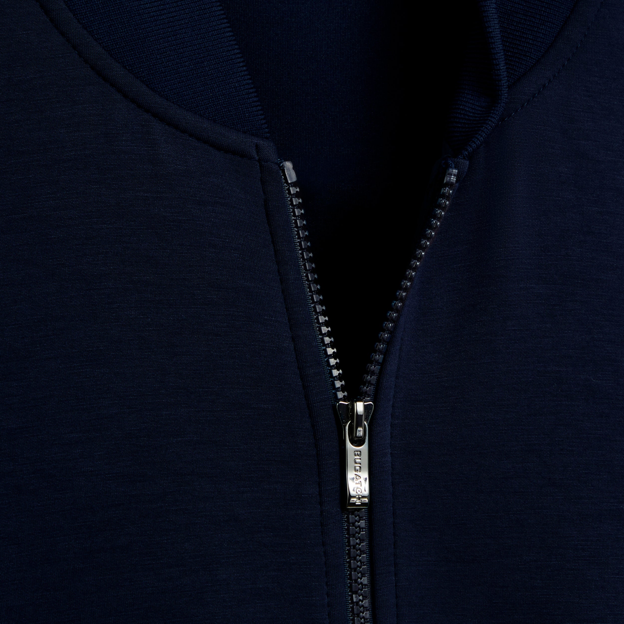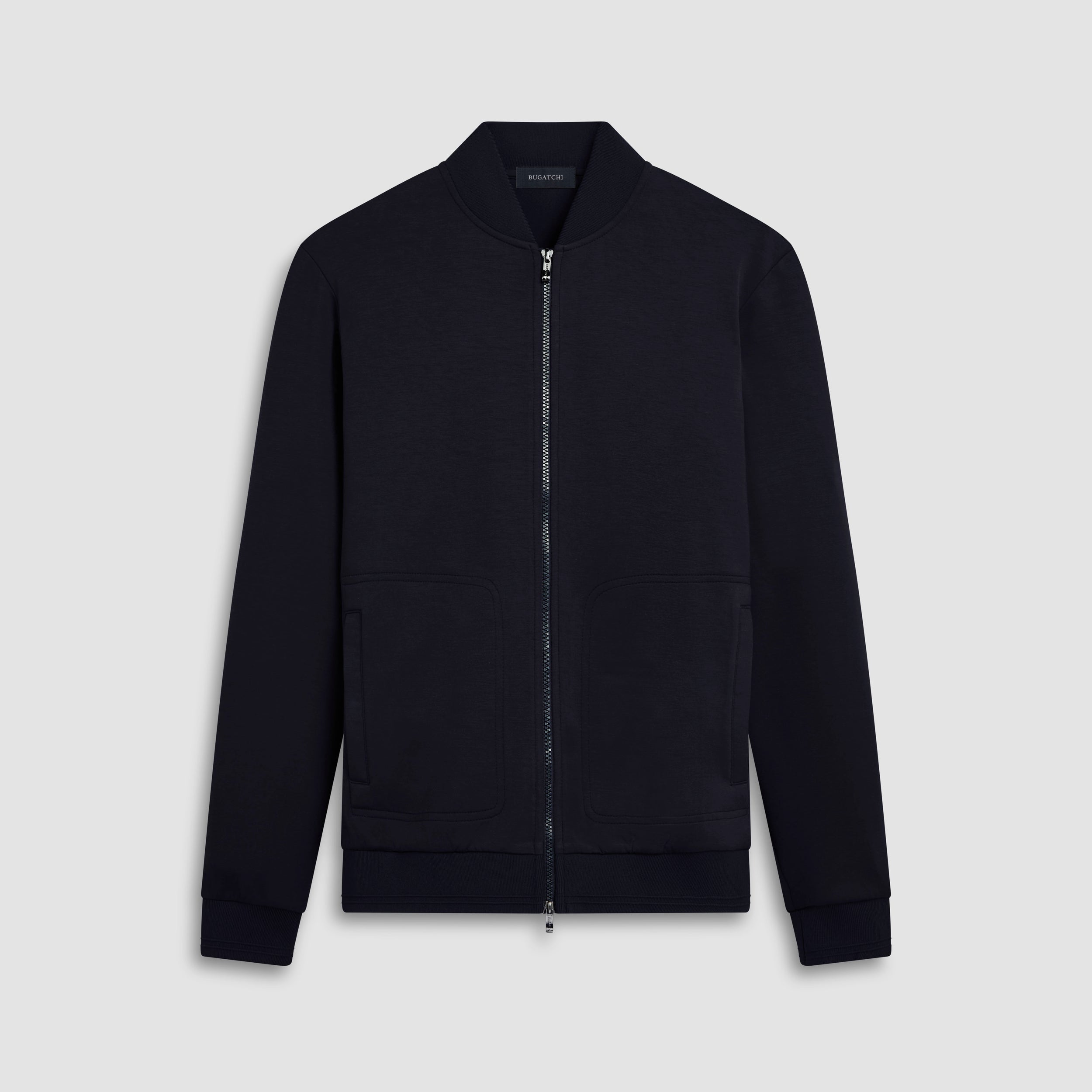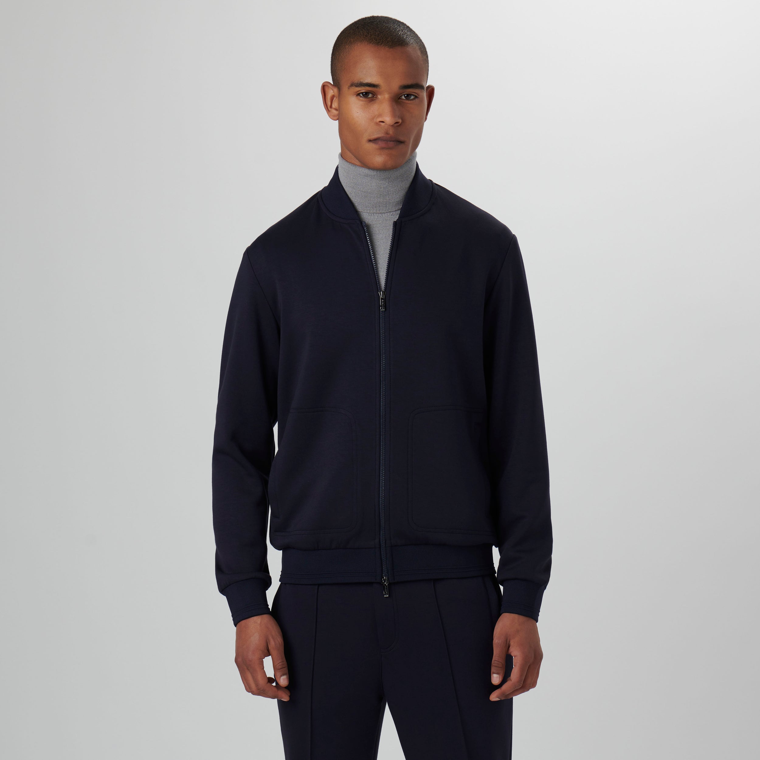 Solid knit bomber jacket in soft touch performance fabric with two-way zipper closure and baseball collar.