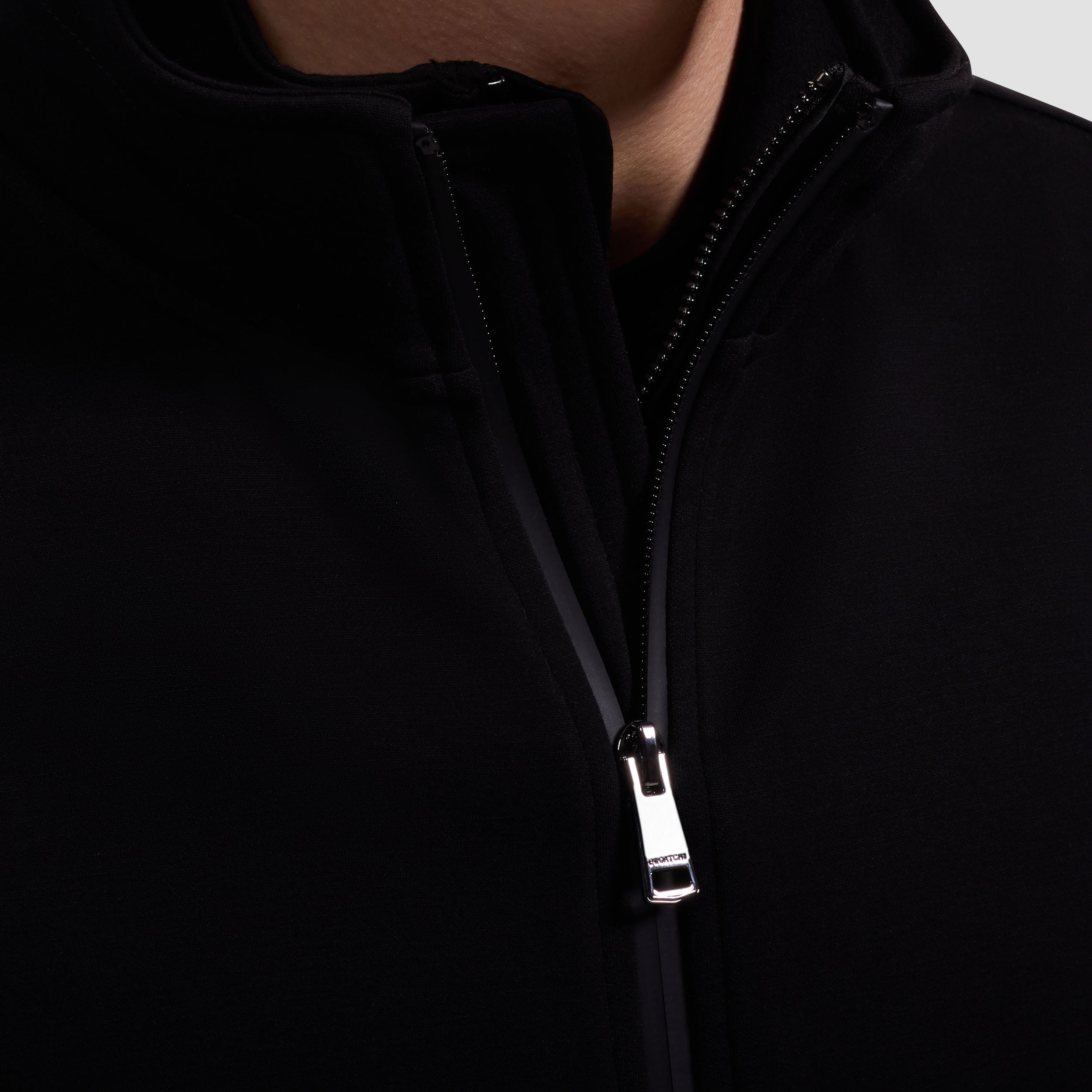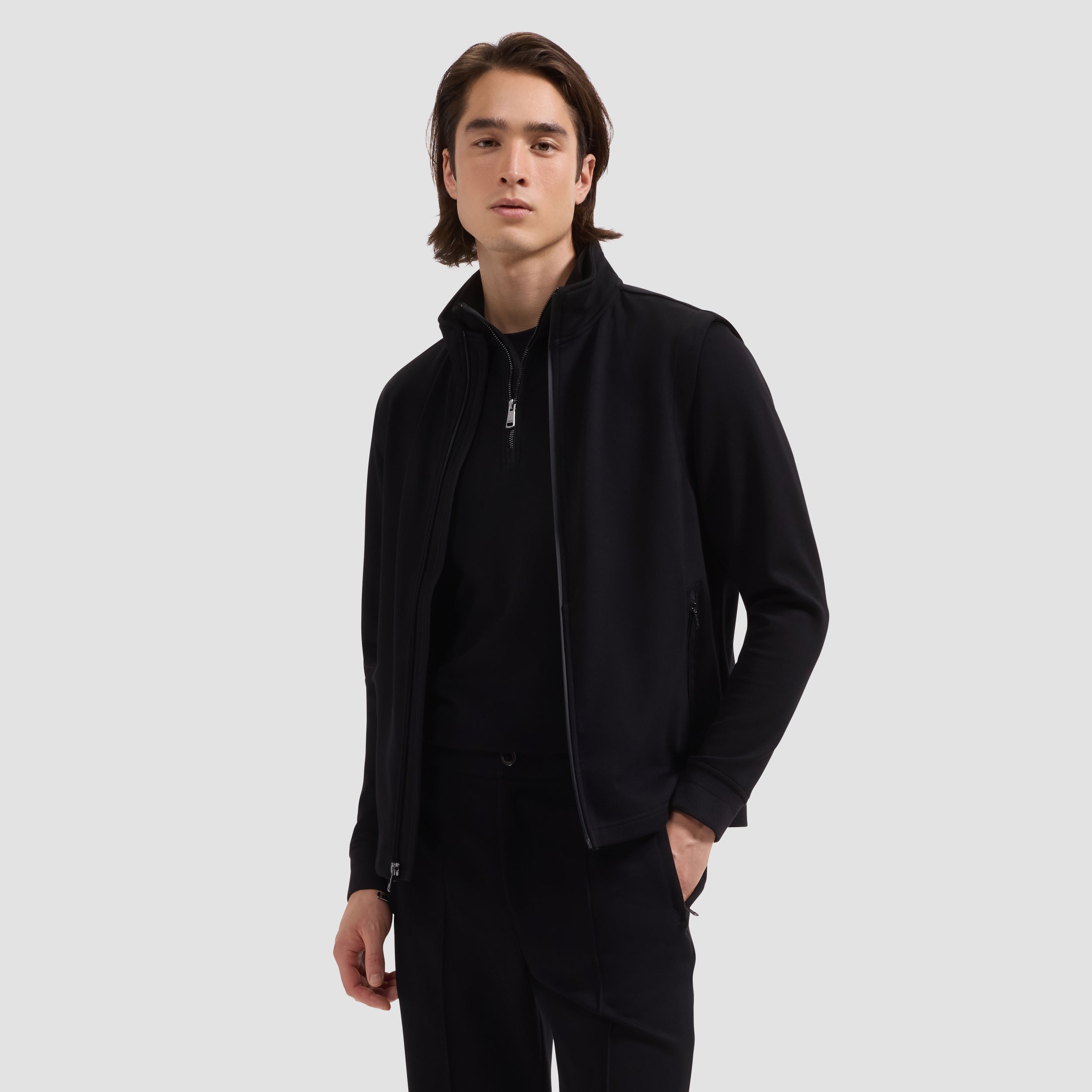 Add a refined layer to your look with this sleek vest crafted in Soft Touch performance fabric. Designed with a full-zip front and a high-standing collar, it features nylon trim detailing throughout for a modern finish. Zippered pockets offer functional storage, while a reflective tape tab below the back collar adds a subtle technical touch.