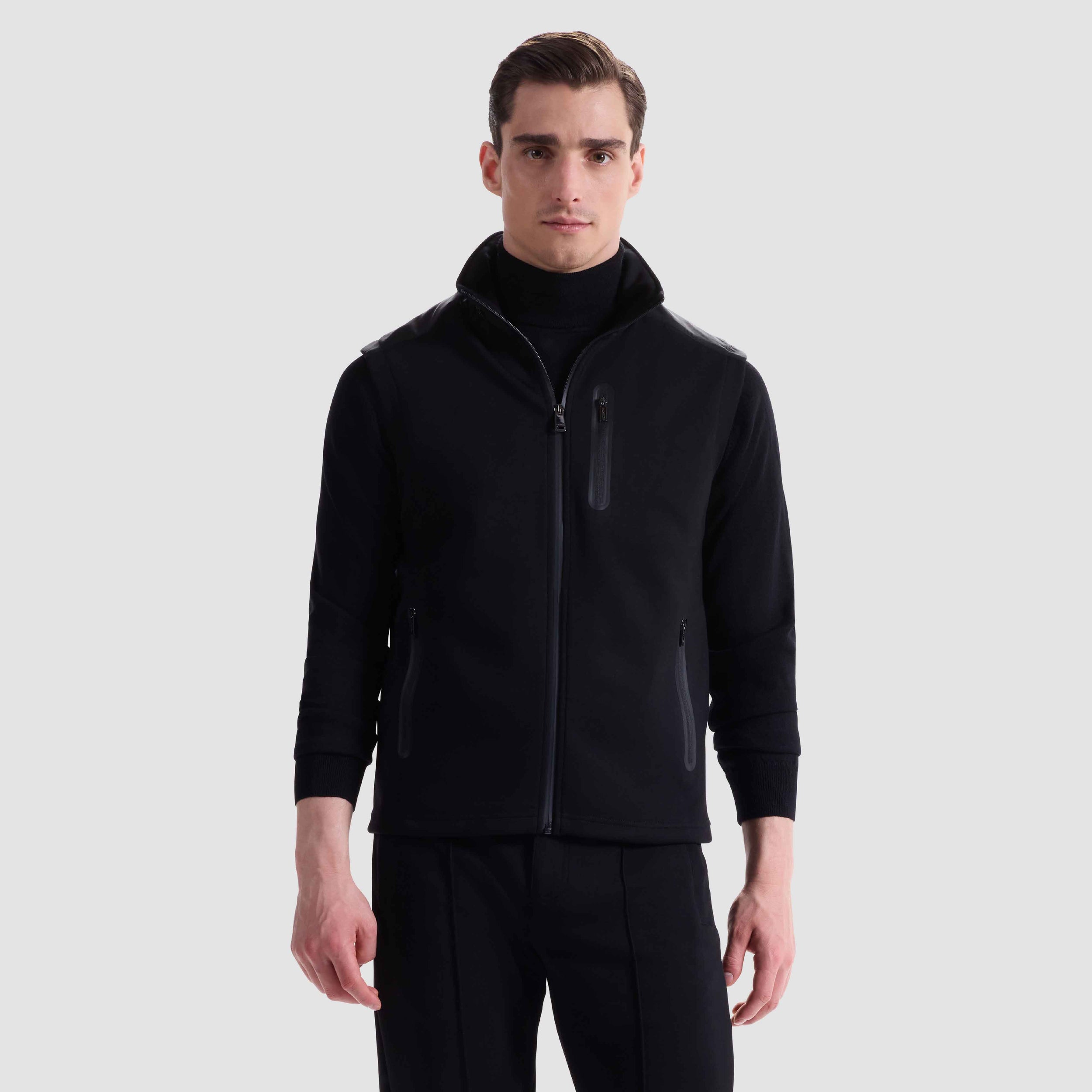 This practical vest in Soft Touch performance fabric features a nylon collar with a stowable nylon hood that tucks neatly into a zippered pocket, adjustable toggles, and nylon shoulder trim. The full zipper closure and three vertical zip pockets are accented with rubber bonding for a sleek, versatile finish. Ideal for transitional weather and effortless layering.