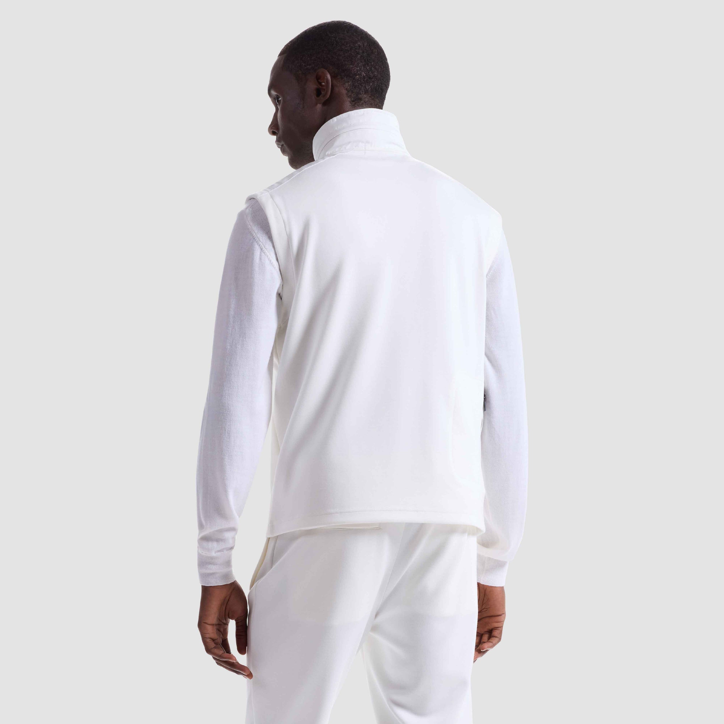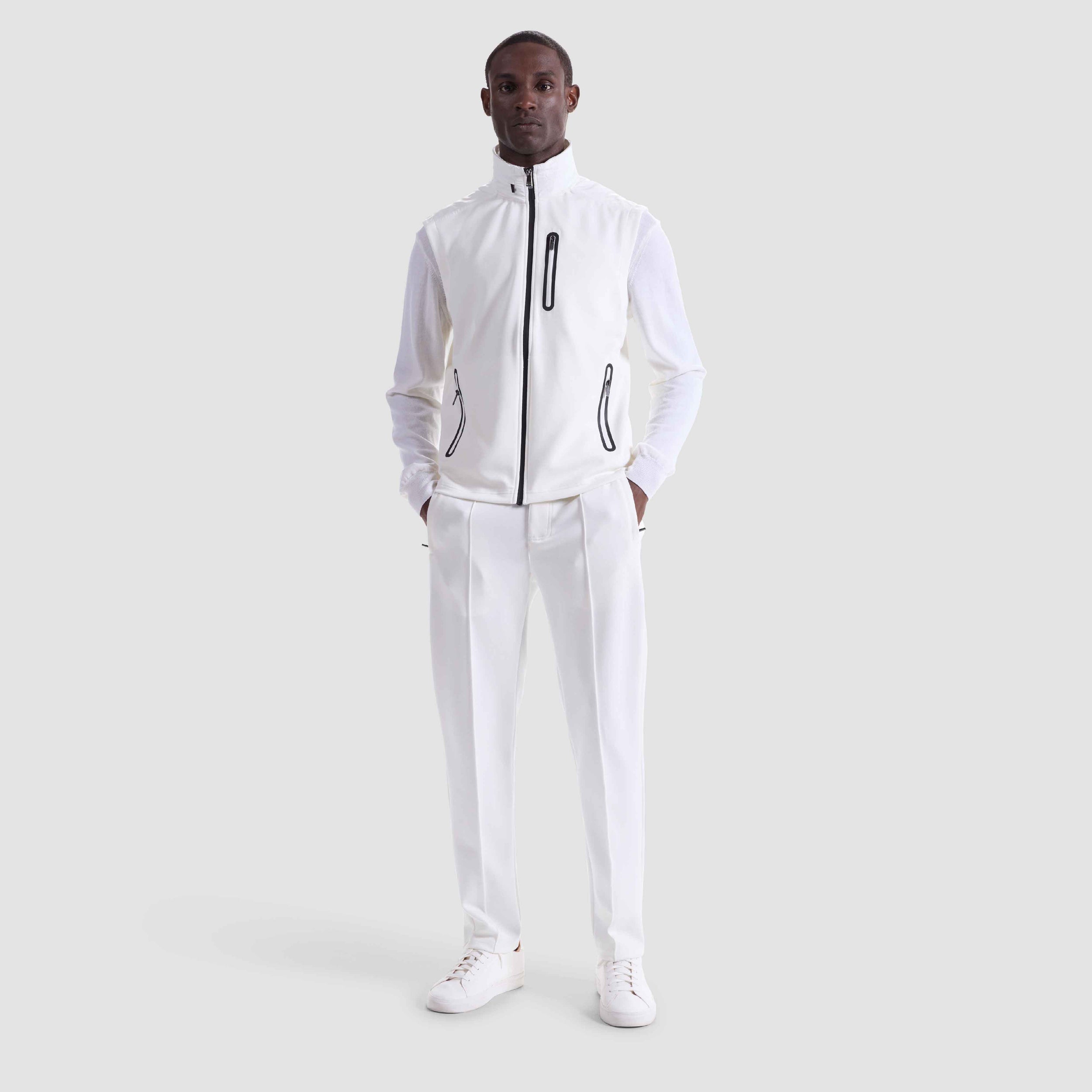 This practical vest in Soft Touch performance fabric features a nylon collar with a stowable nylon hood that tucks neatly into a zippered pocket, adjustable toggles, and nylon shoulder trim. The full zipper closure and three vertical zip pockets are accented with rubber bonding for a sleek, versatile finish. Ideal for transitional weather and effortless layering.