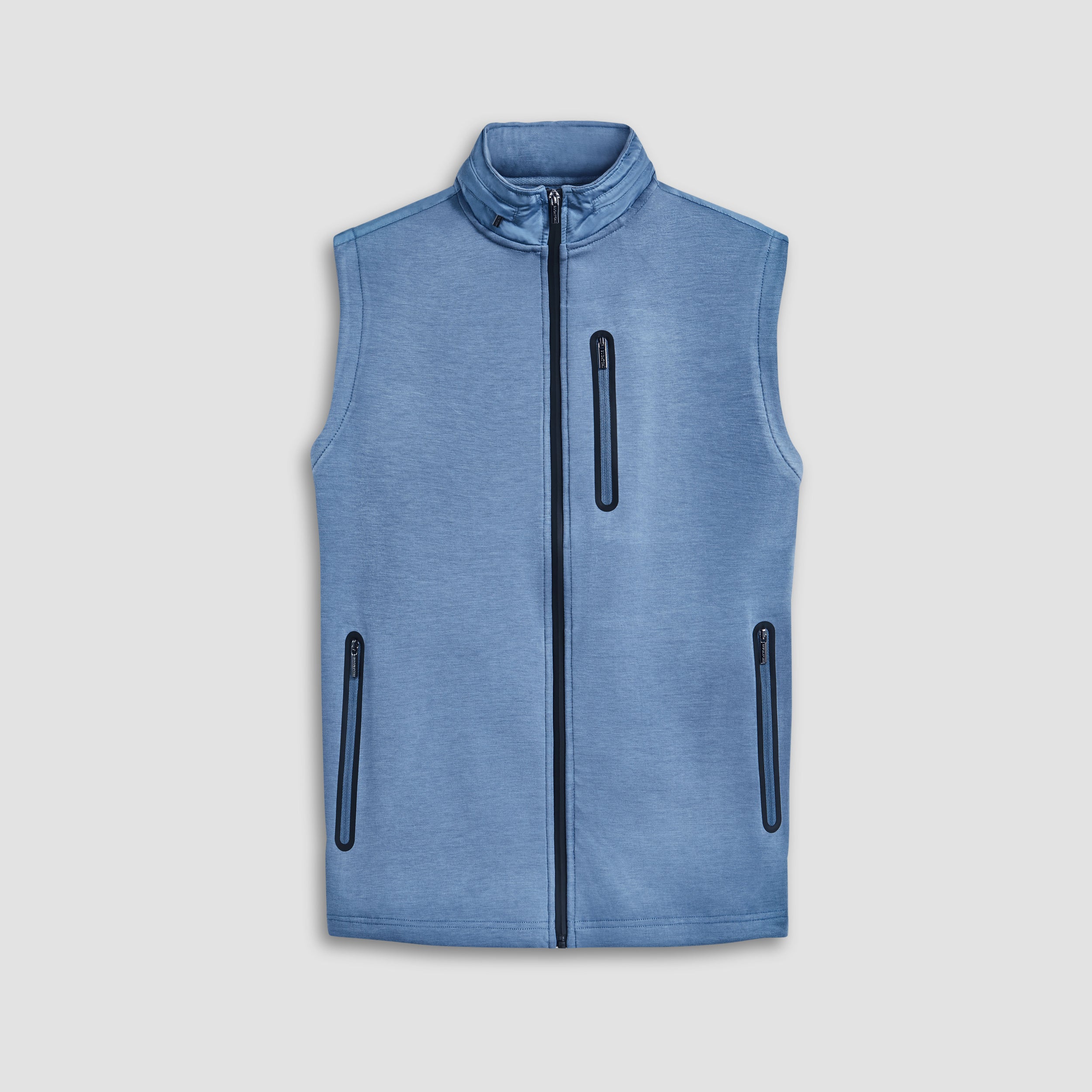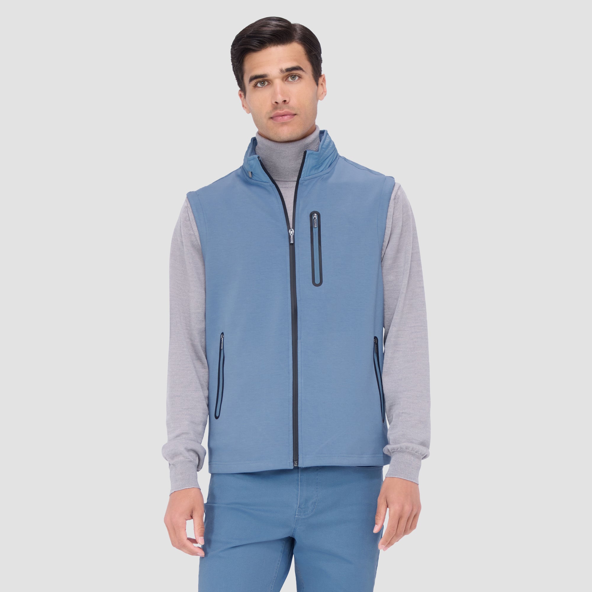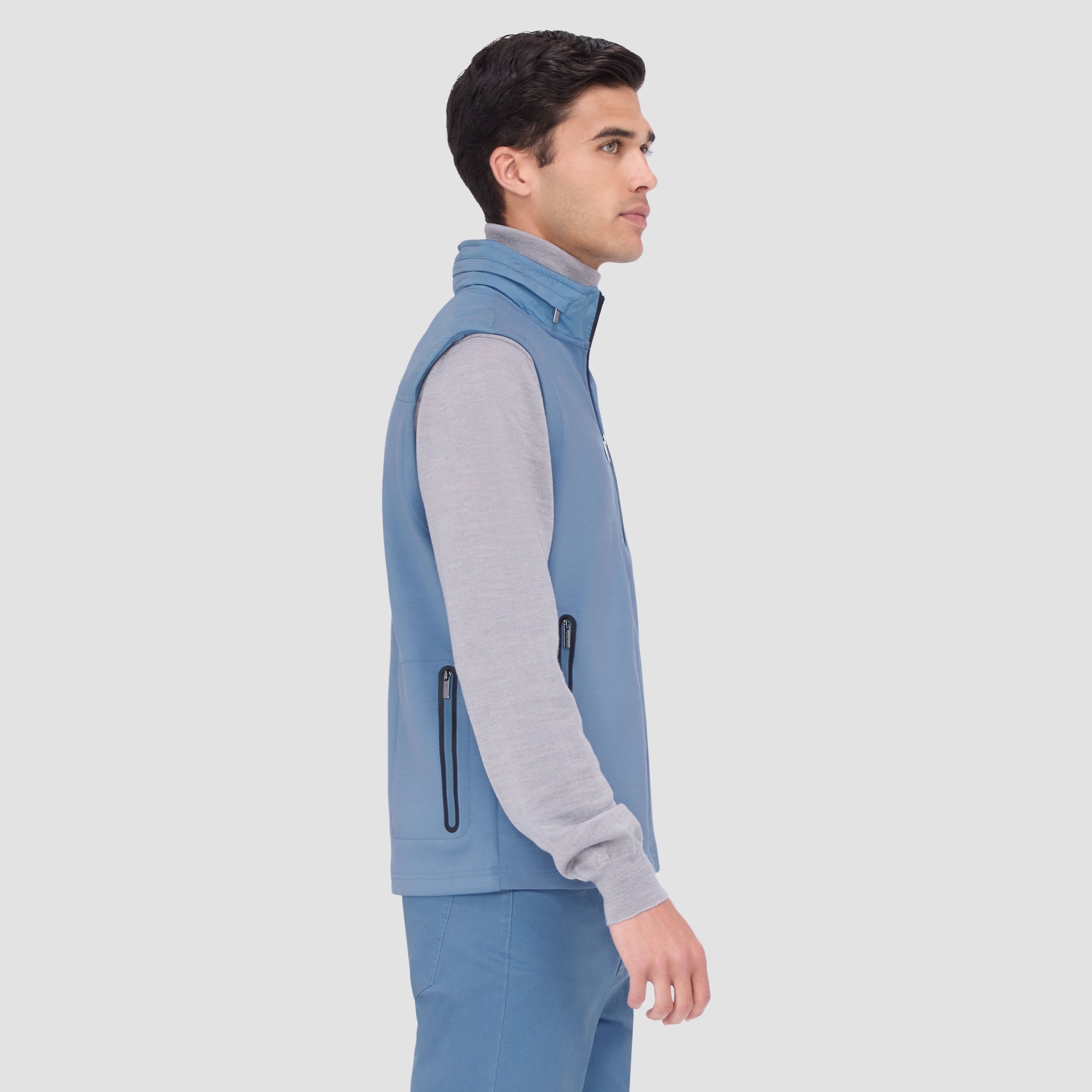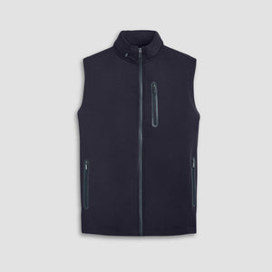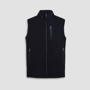 Made from a luxurious soft-touch knit fabric, this performance sleeveless vest features a full zipper closure, a stow-away hood, three vertical zippered pockets in the front and one in the back, sleek nylon trimming and rubber bonding detail. Combining practicality with modern sophistication, this vest is a great choice for both casual and activewear.
