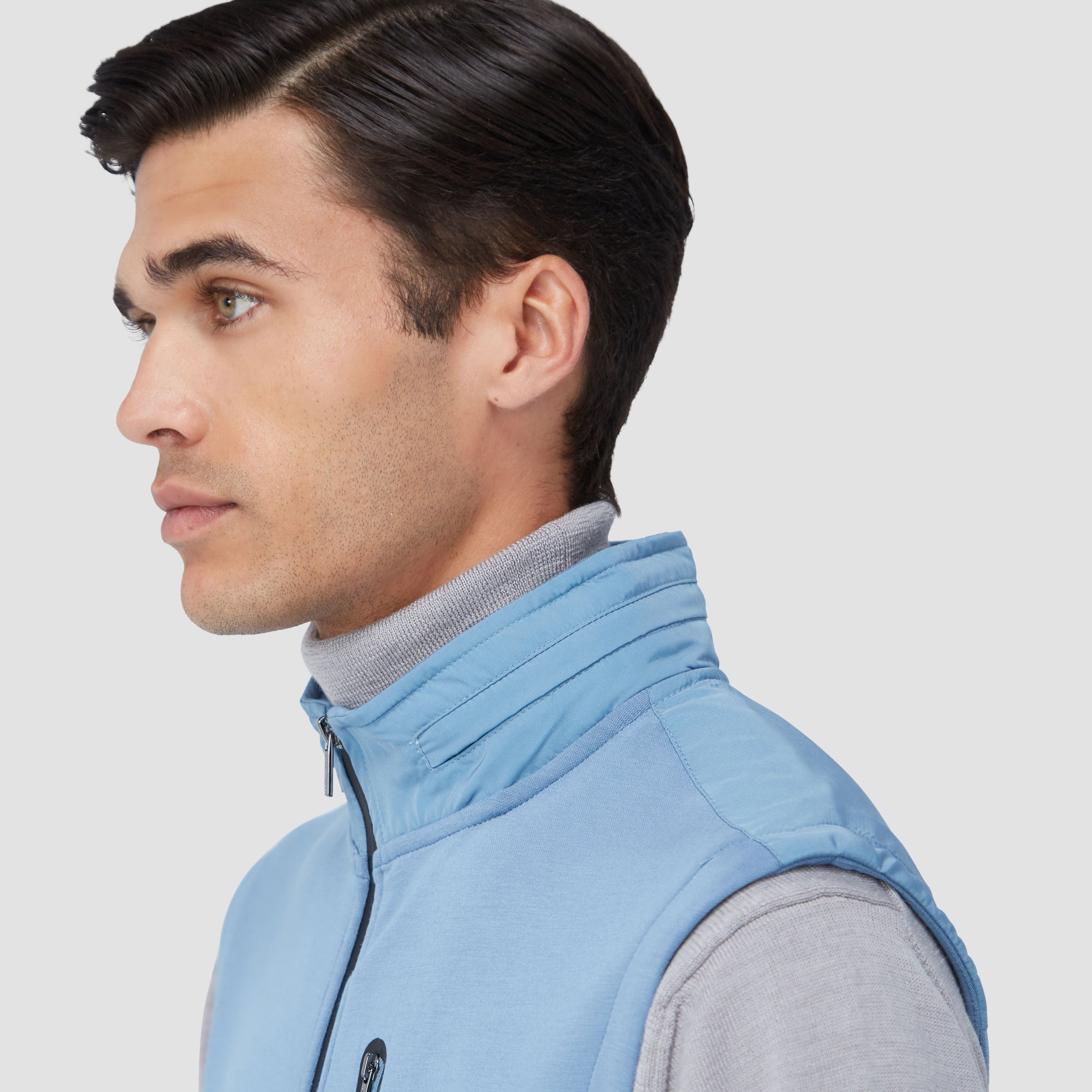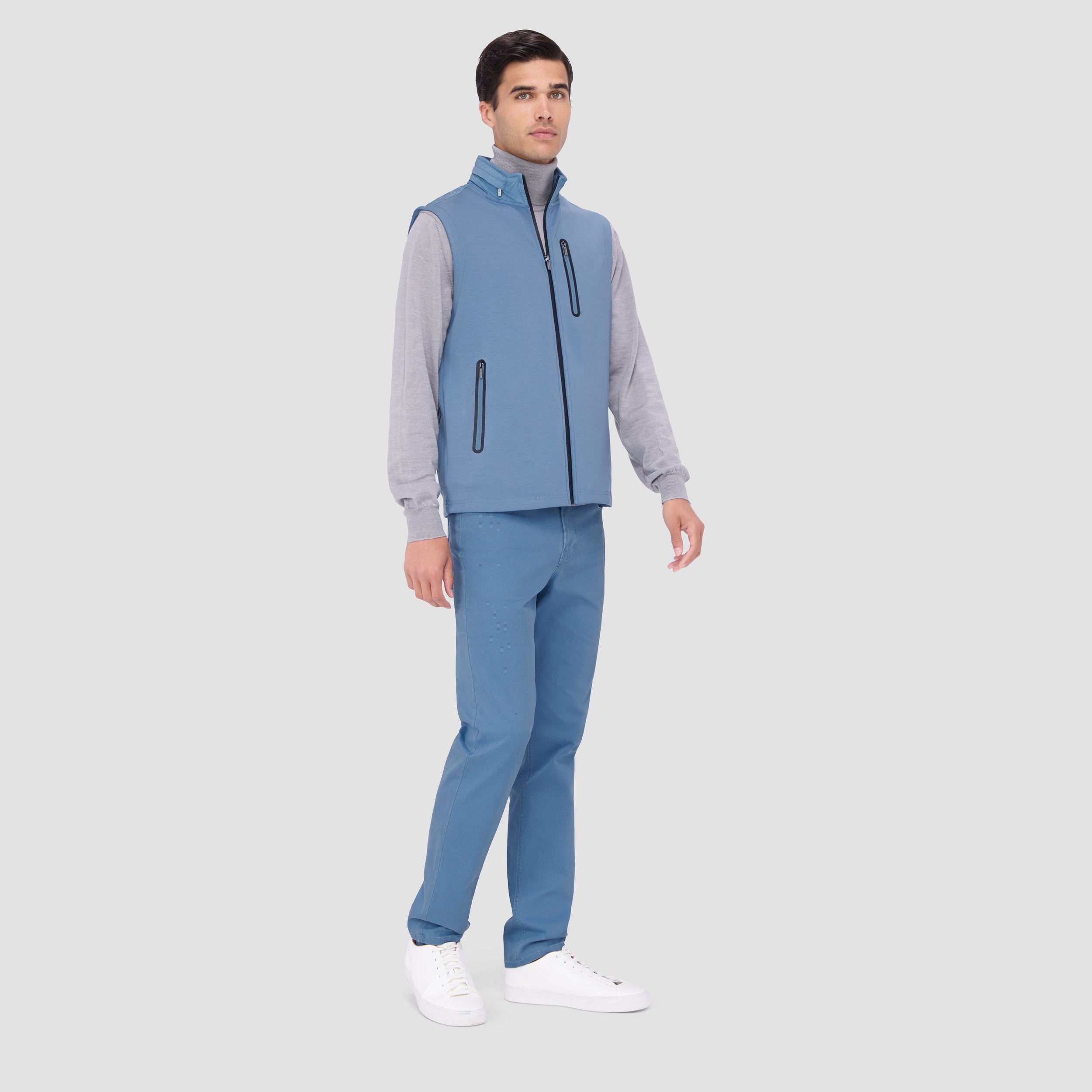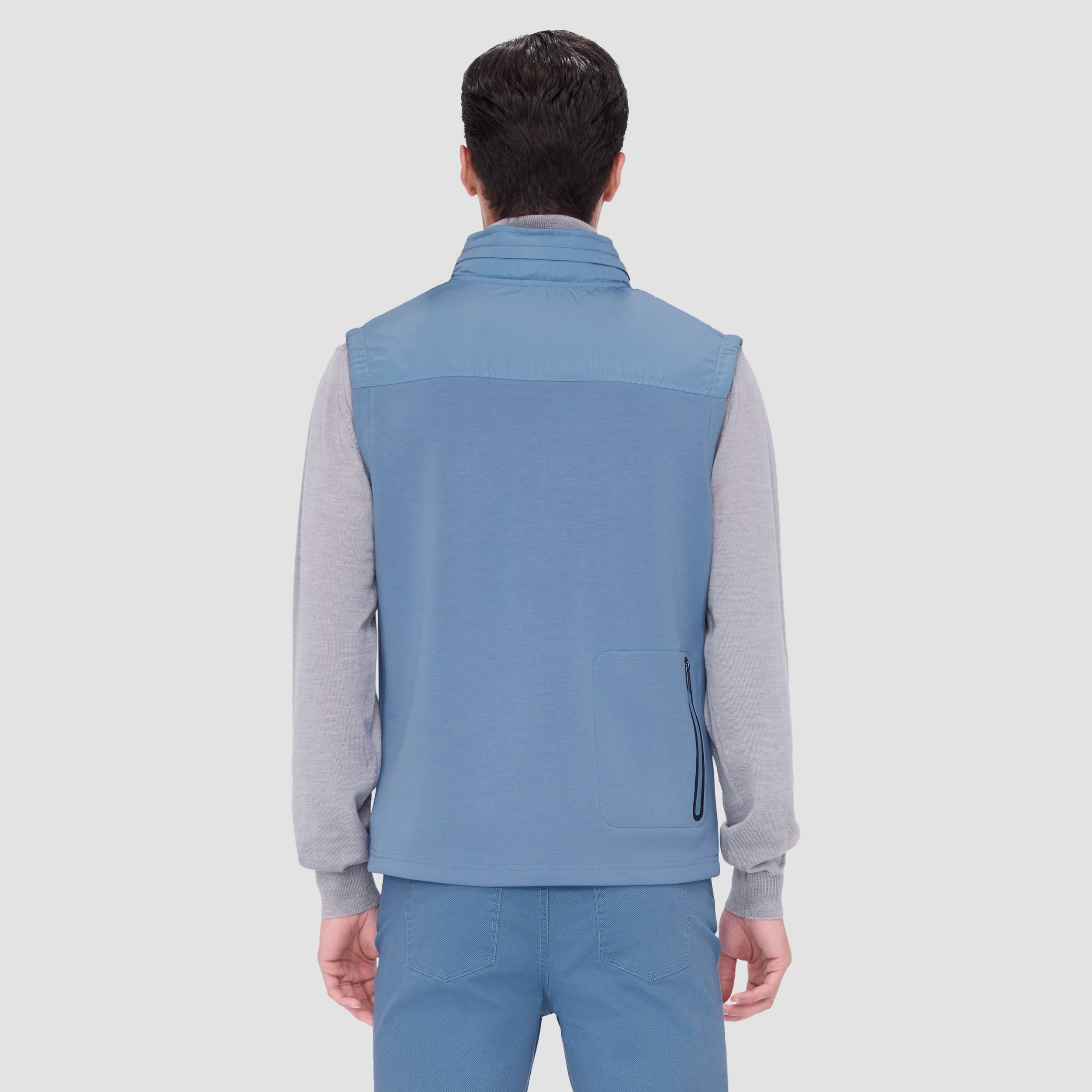 Made from a luxurious soft-touch knit fabric, this performance sleeveless vest features a full zipper closure, a stow-away hood, three vertical zippered pockets in the front and one in the back, sleek nylon trimming and rubber bonding detail. Combining practicality with modern sophistication, this vest is a great choice for both casual and activewear.