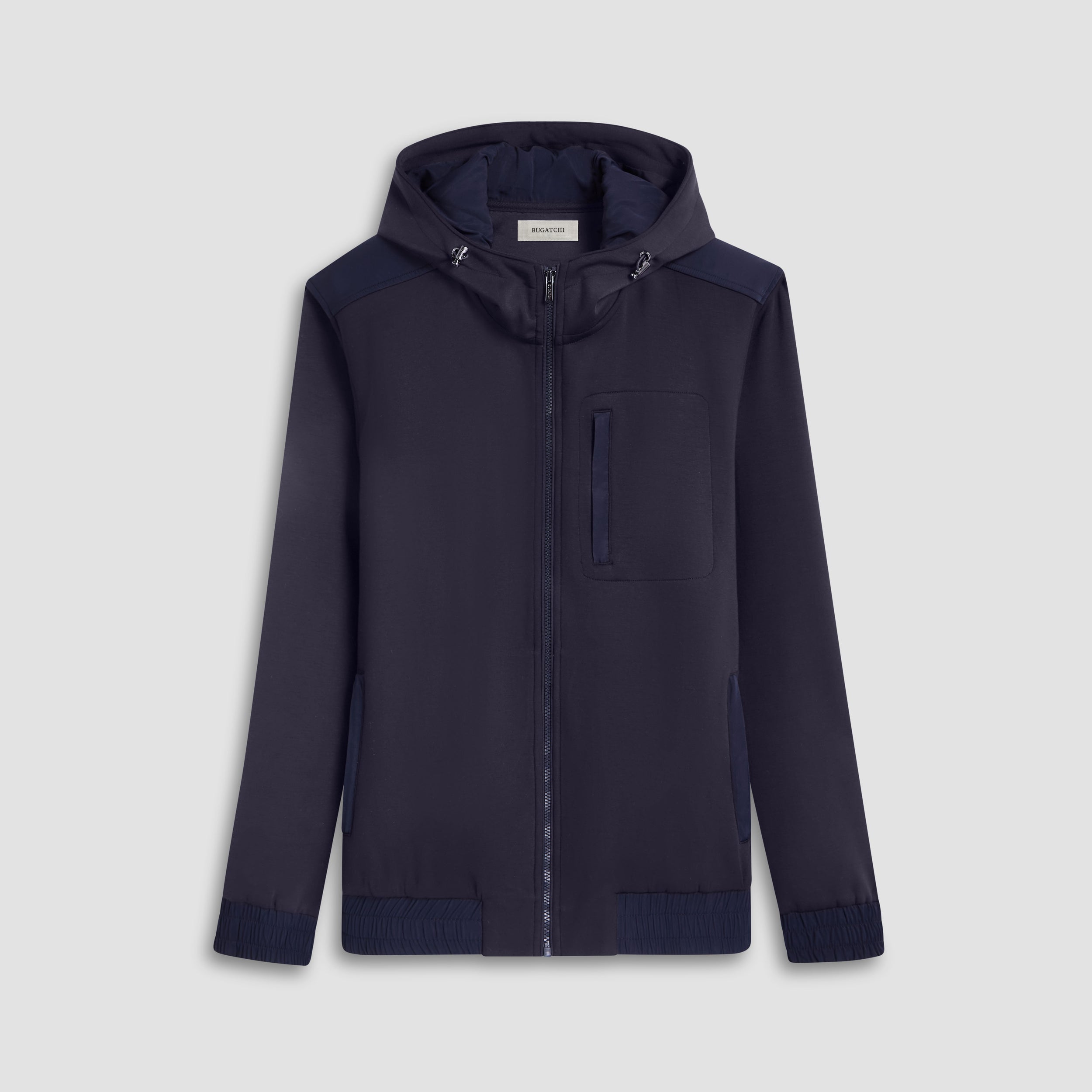 Made from a luxurious soft-touch knit fabric, this zip-up performance jacket offers exceptional comfort and style. It features a funnel neck with adjustable hood, elasticized cuffs and waist, zippered side pockets, a vertical chest pocket and sleek nylon trimming. Combining practicality with modern sophistication, this versatile jacket is a great choice for both casual and activewear.