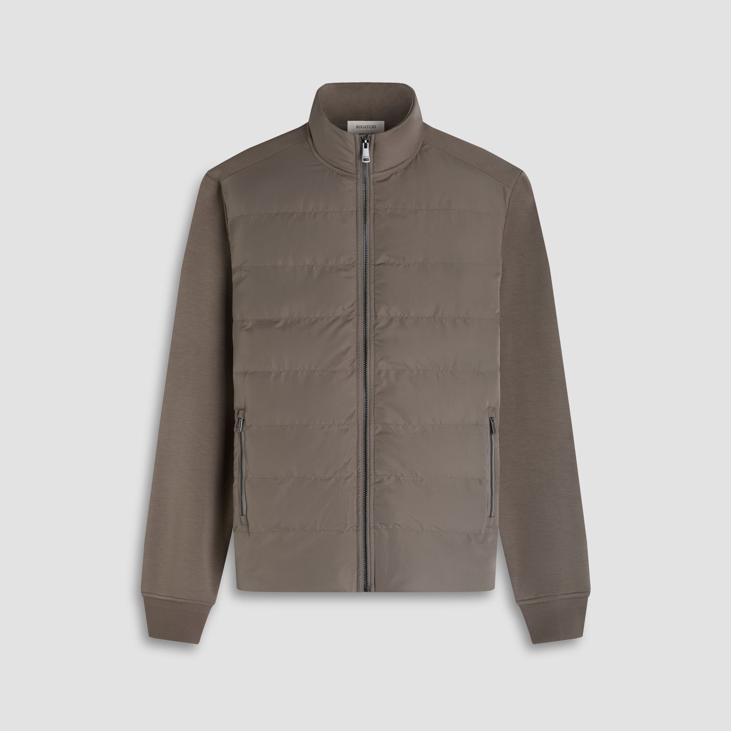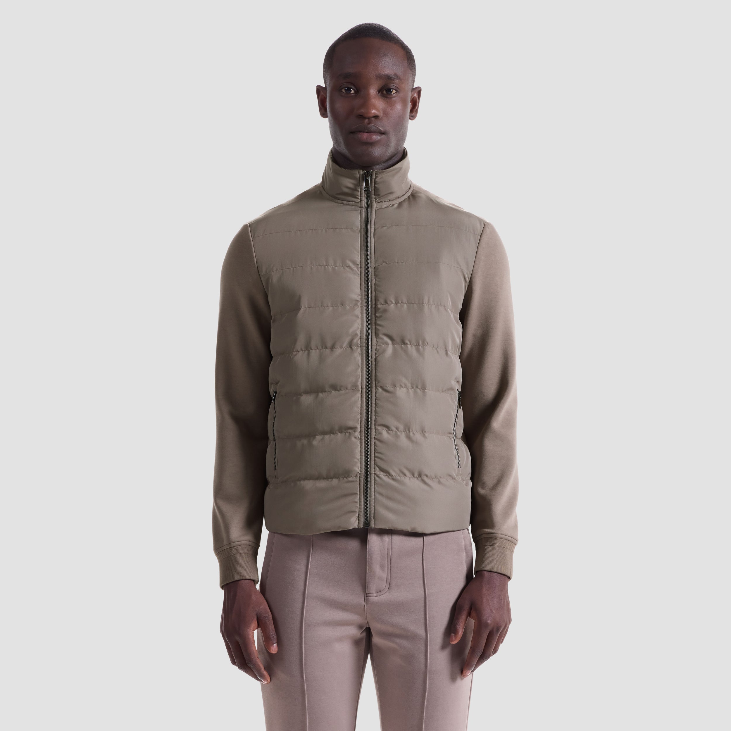 Designed for both style and function, this jacket features a lightly quilted nylon front panel and high collar for added warmth and structure. The back and sleeves are crafted from Soft Touch performance knit fabric, offering comfort and flexibility. Finished with ribbed cuffs, a two-way zipper and zippered side pockets with protective zipper guards, this versatile piece combines lightweight insulation with a sleek, streamlined look.