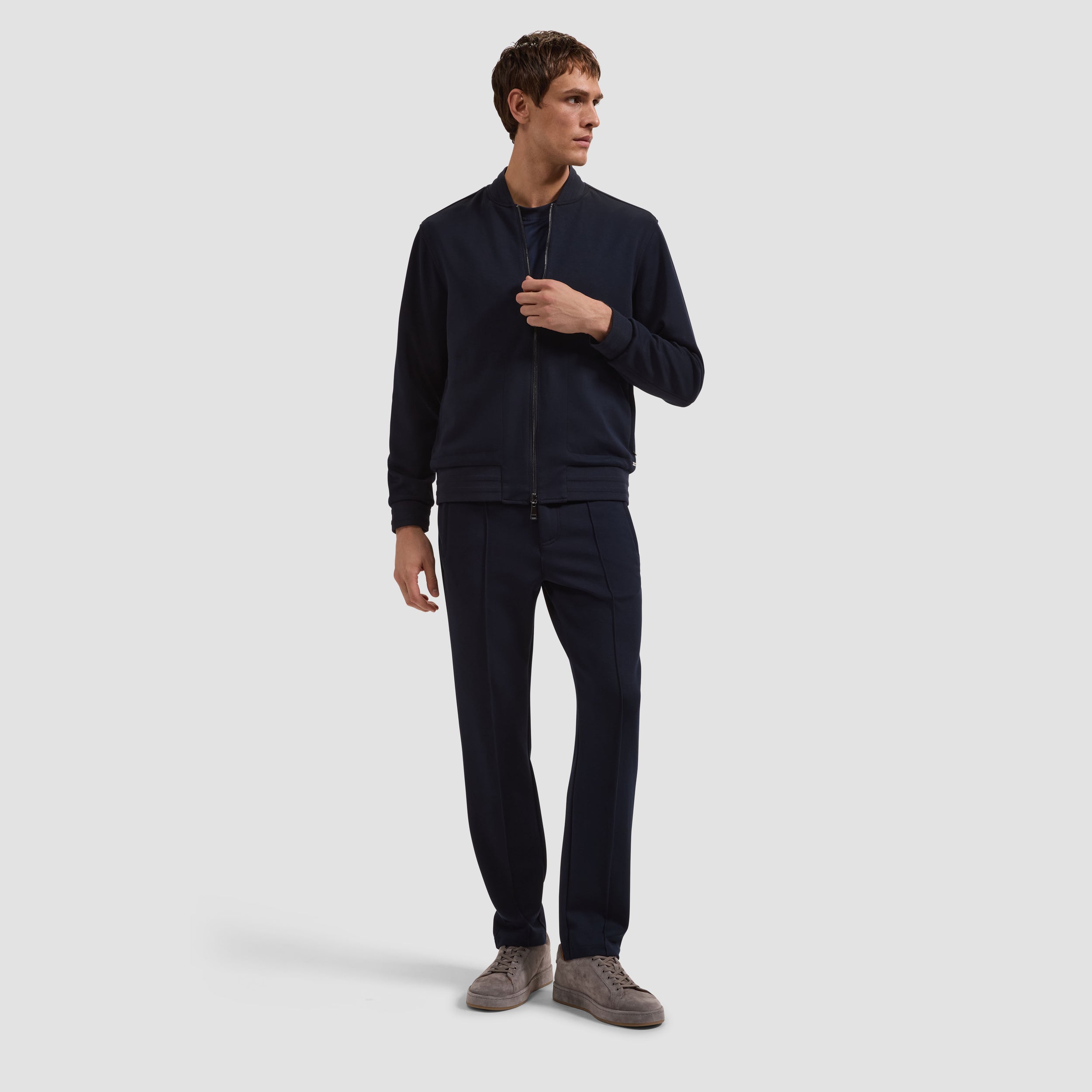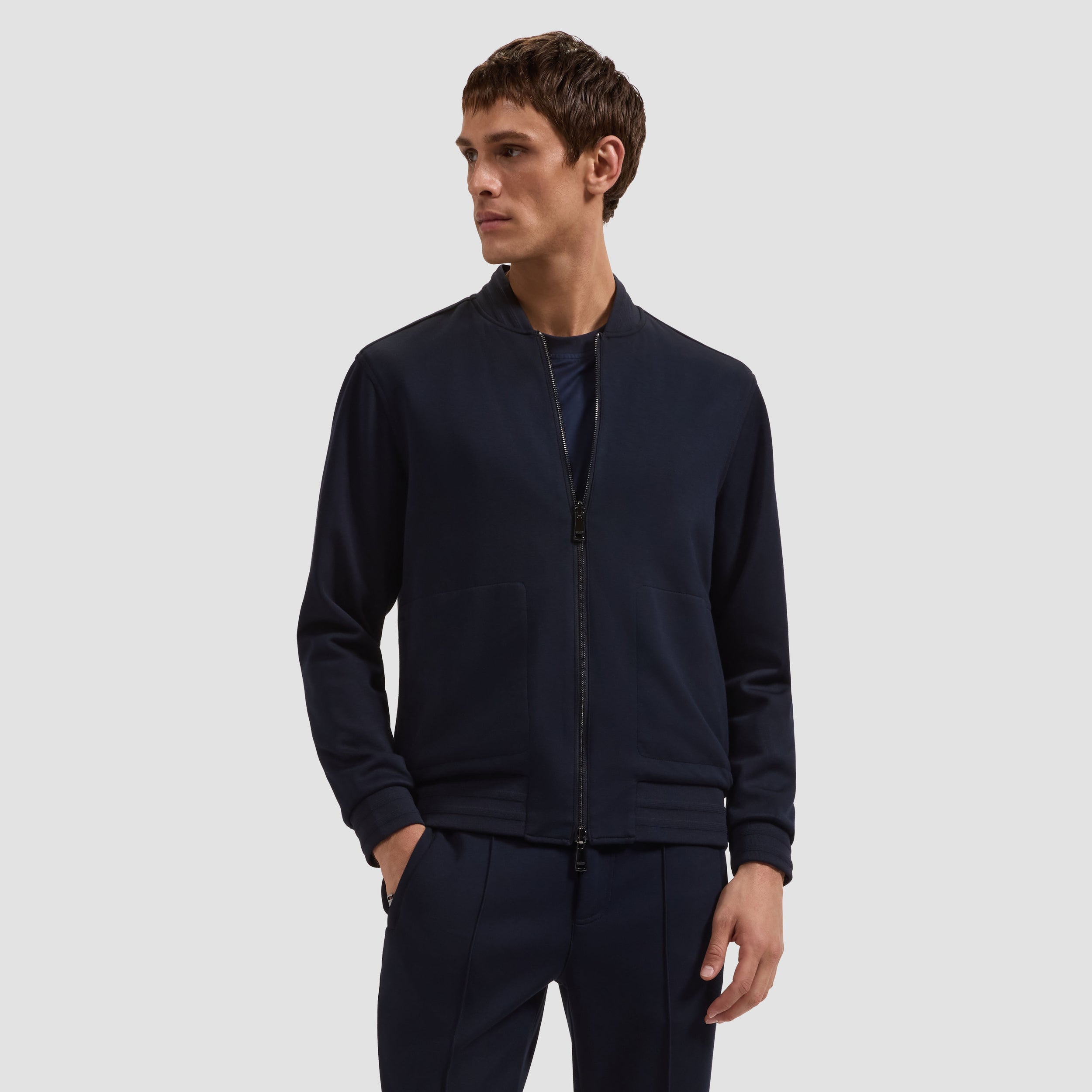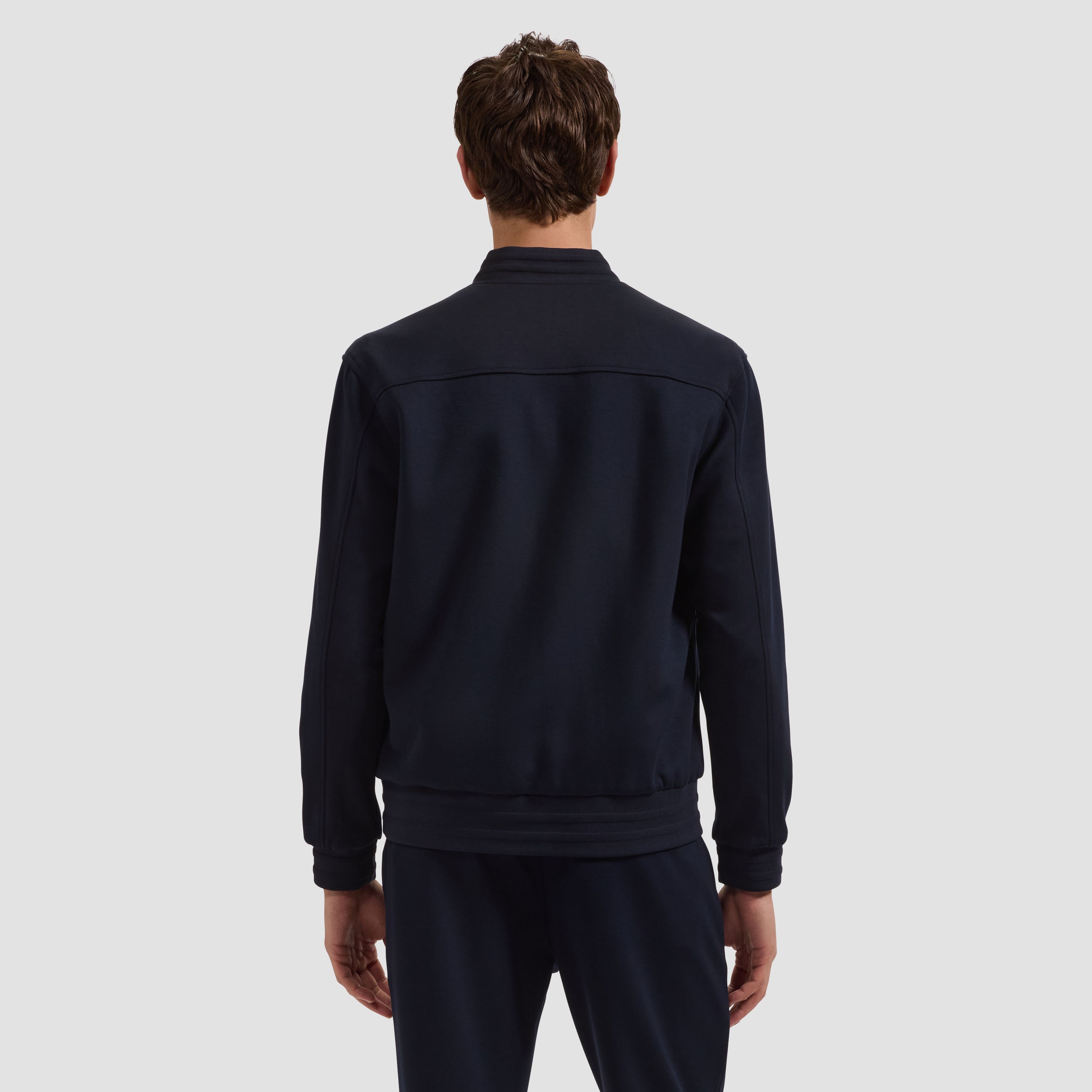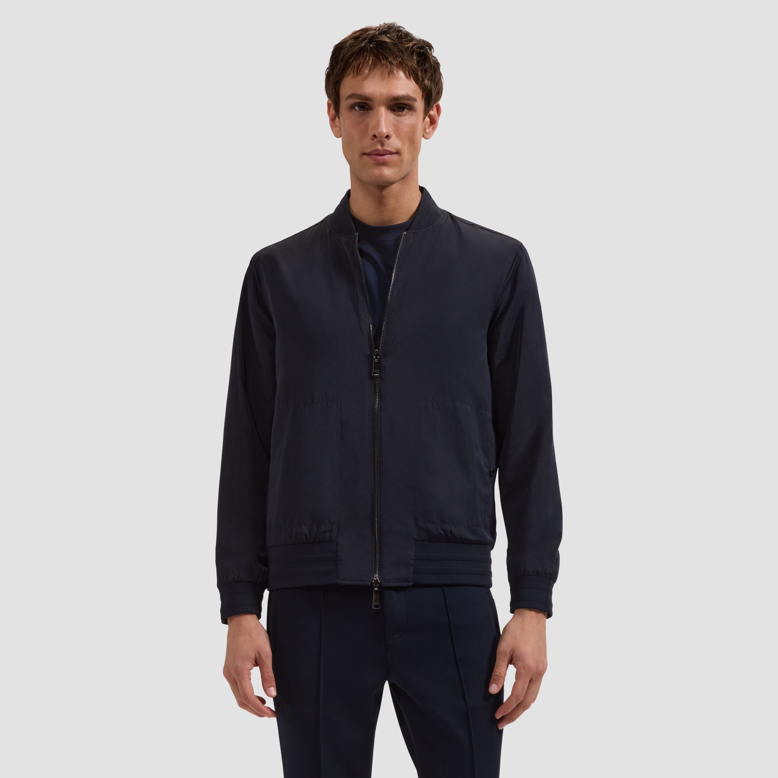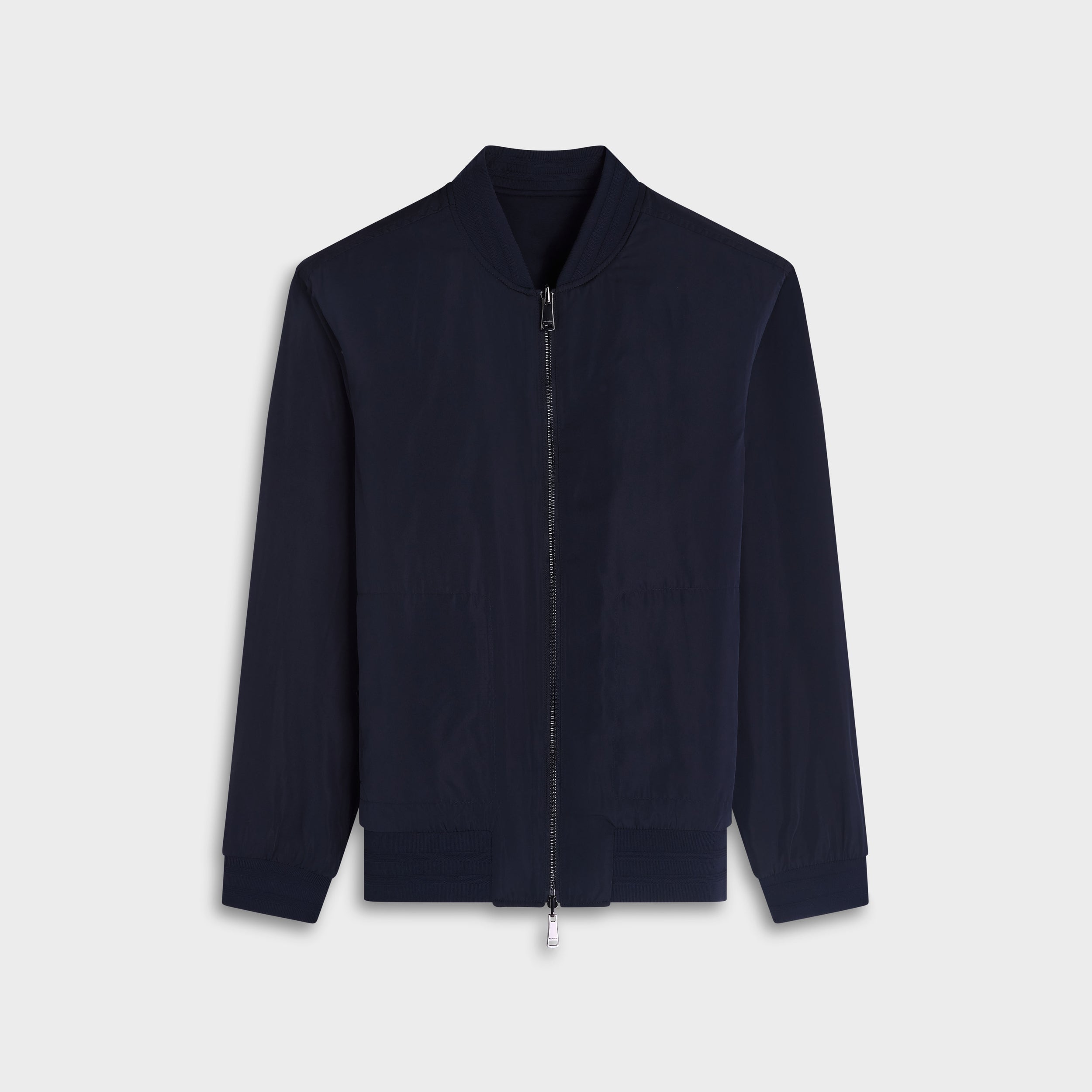 The perfect layering piece for in-between seasons, this reversible jacket is crafted in Soft Touch performance fabric on one side and sleek nylon on the other for refined versatility. It features a classic baseball collar, elasticized cuffs, and a smooth waist, all finished with raised ottoman stripe detail. A double-slider front zipper enhances functionality, while zippered and snap pockets offer practical storage on both sides.
