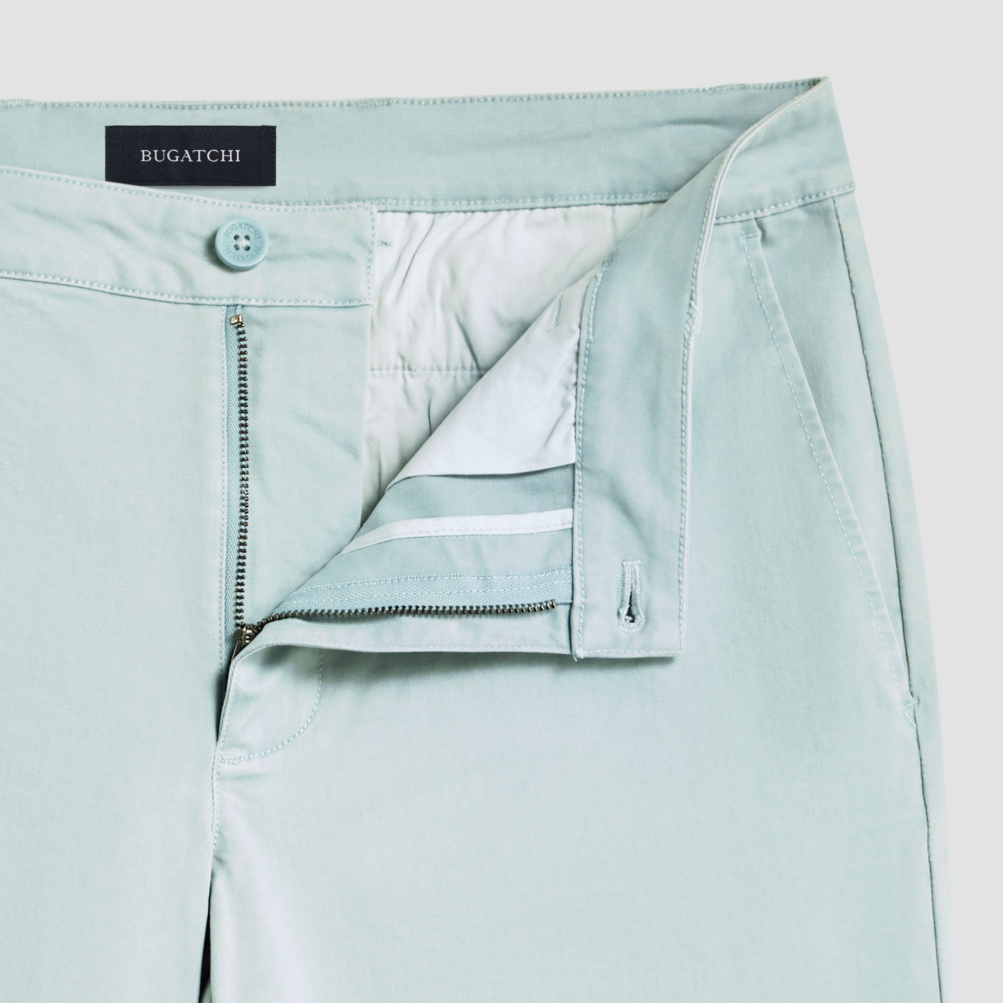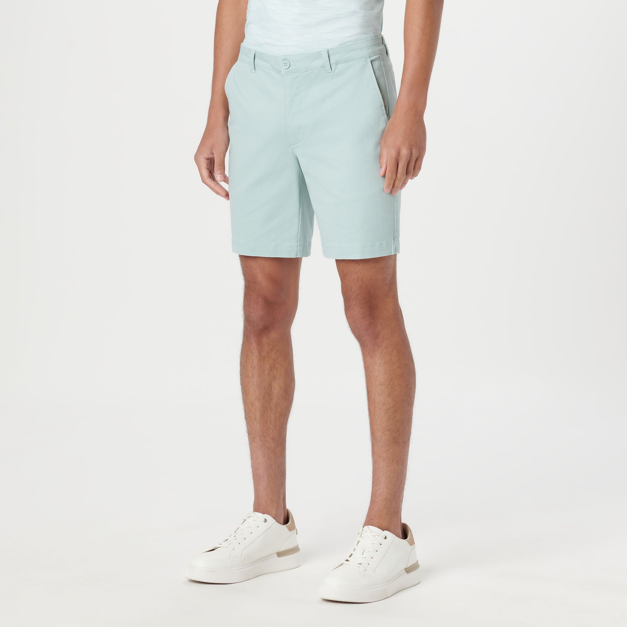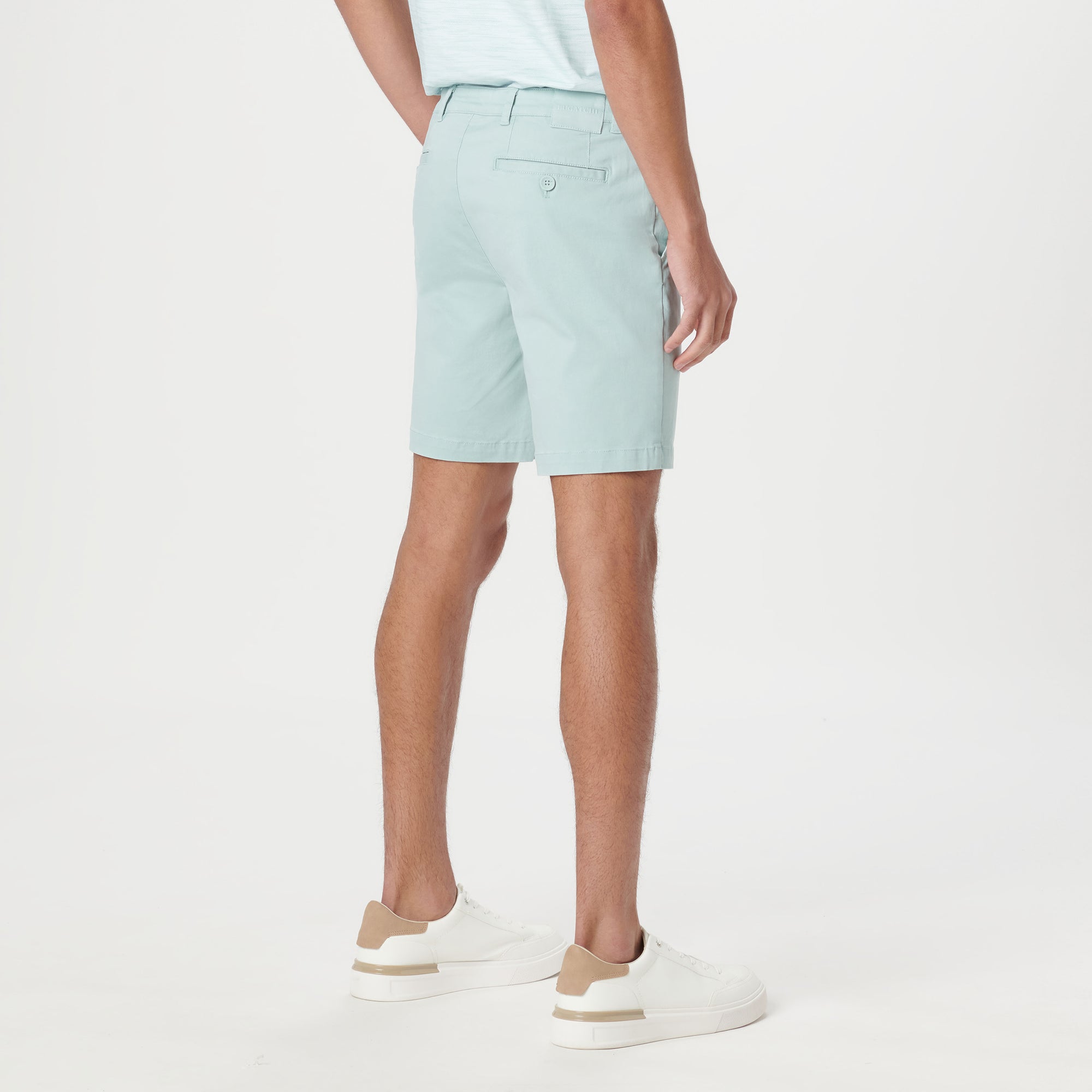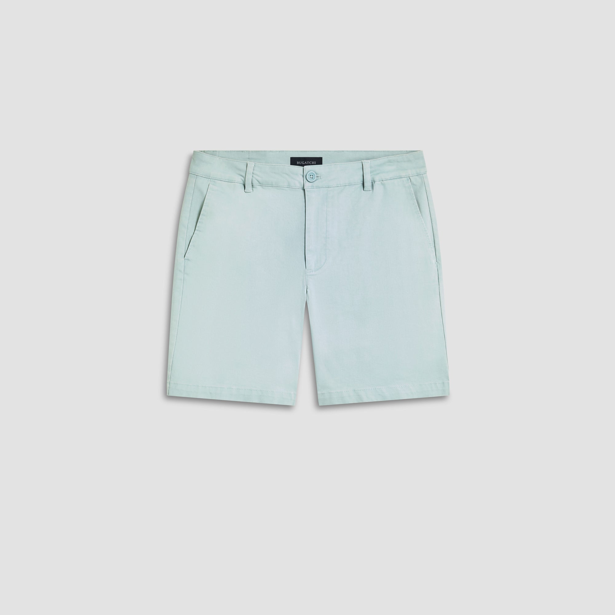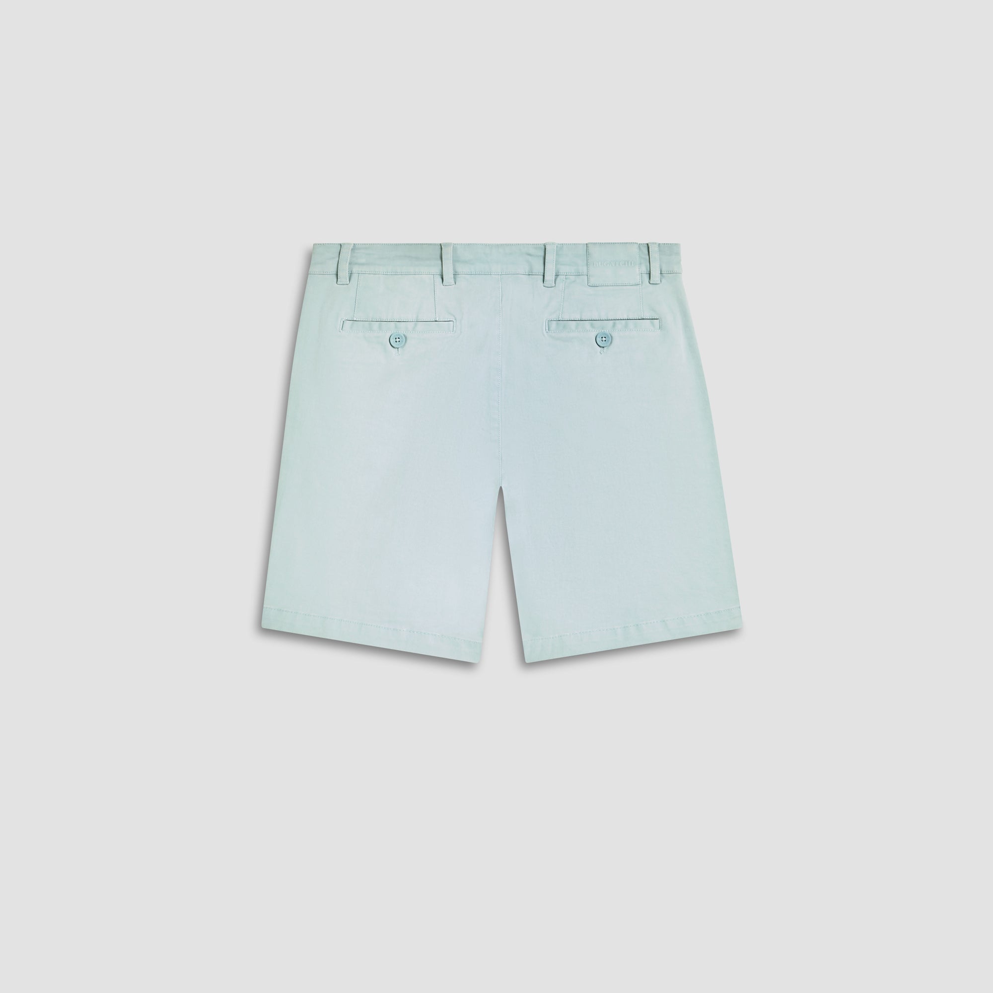 Solid Bermuda shorts, crafted from soft cotton blend with added stretch feature a looped waistband, a zipper fly and button closure, side pockets and two rear pockets with buttons.