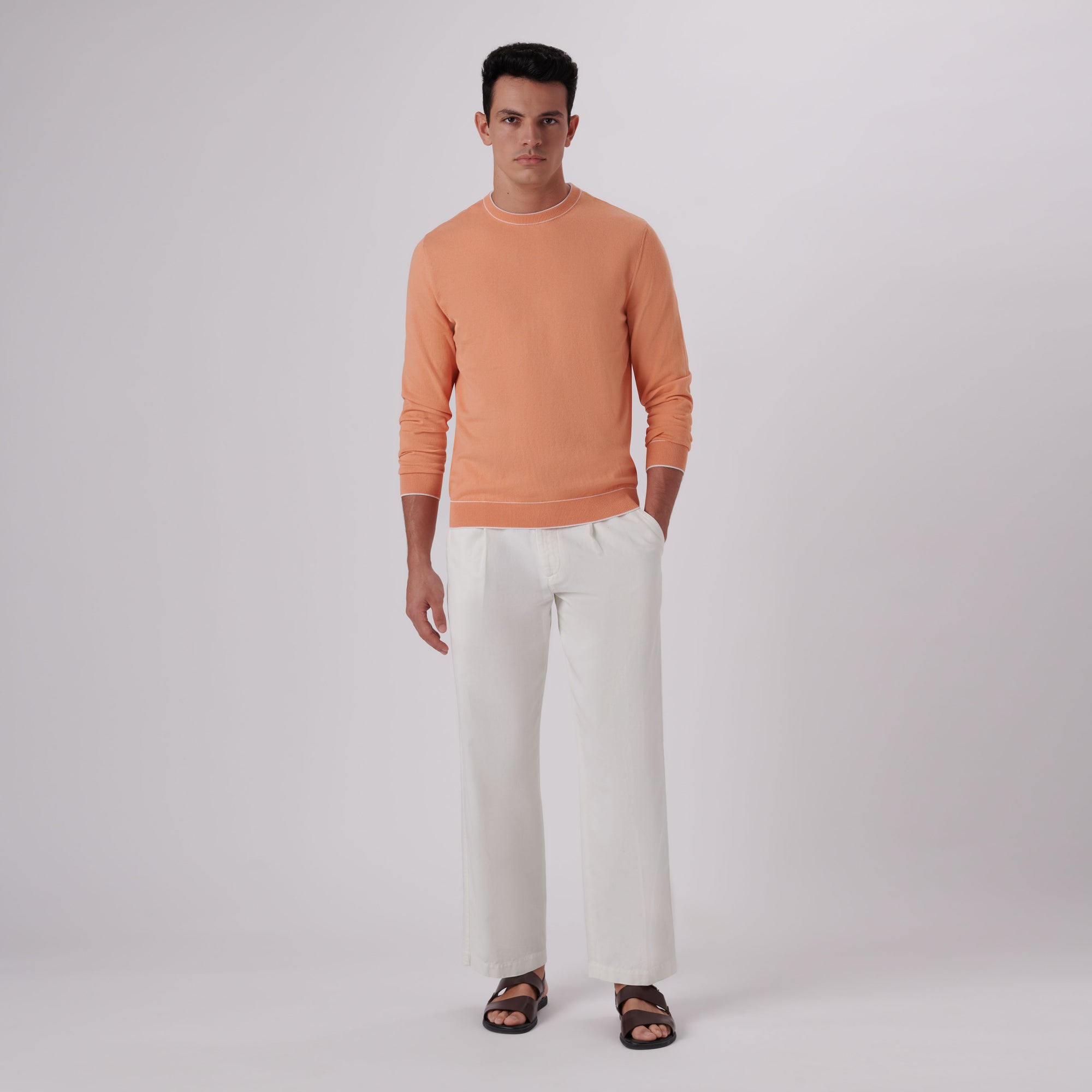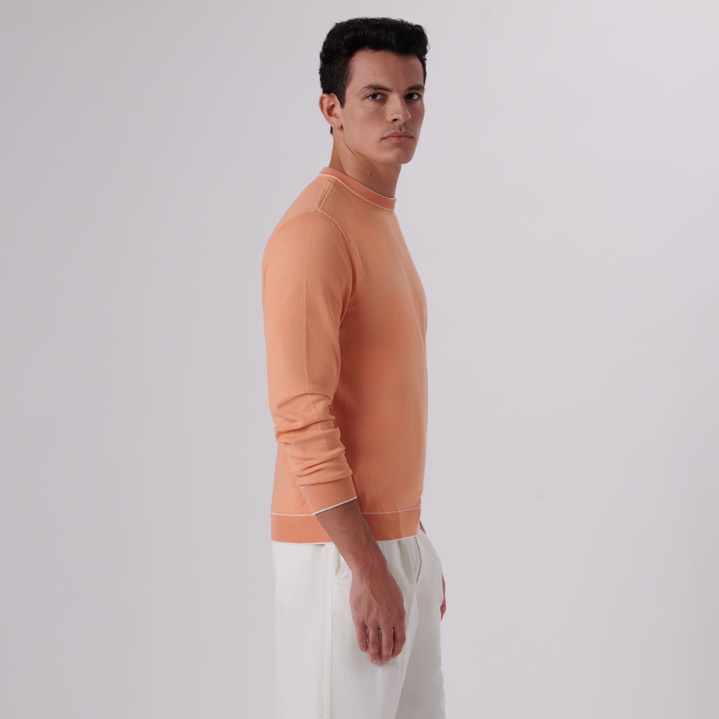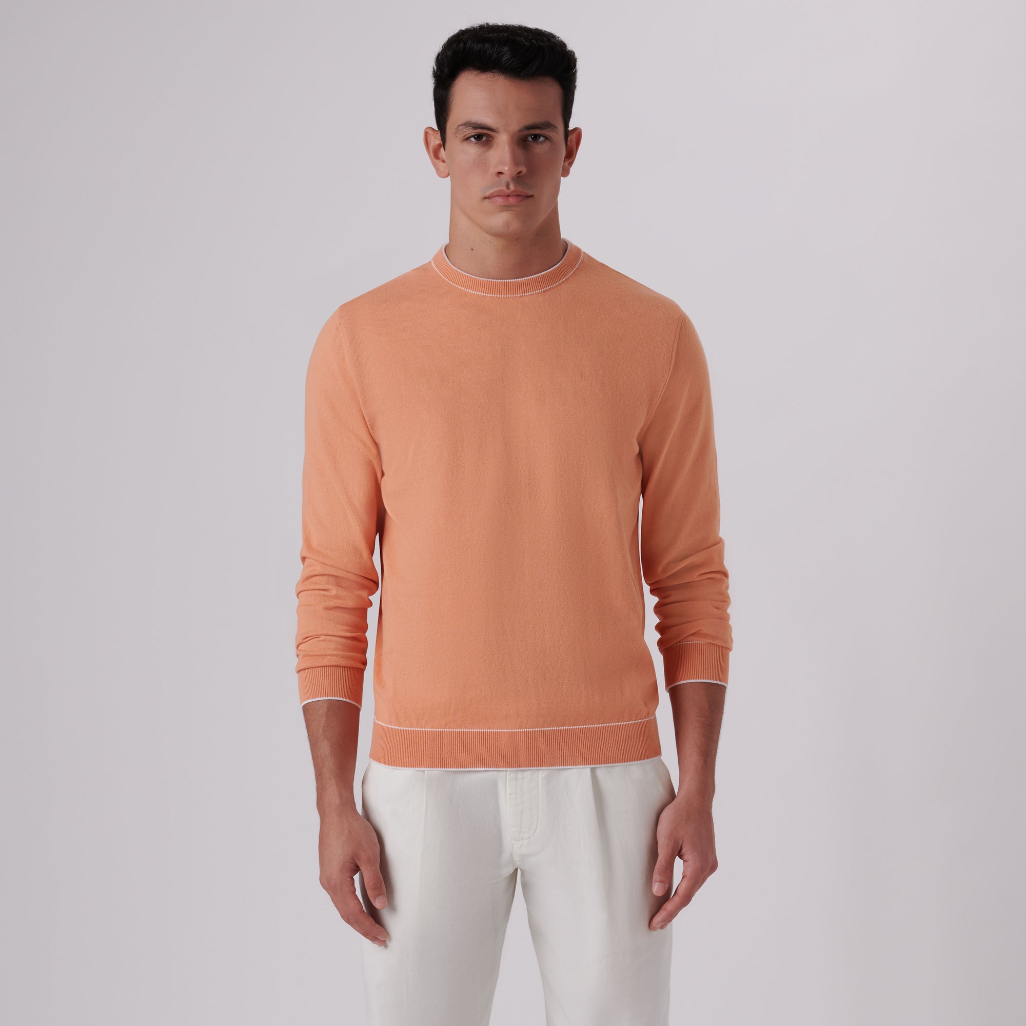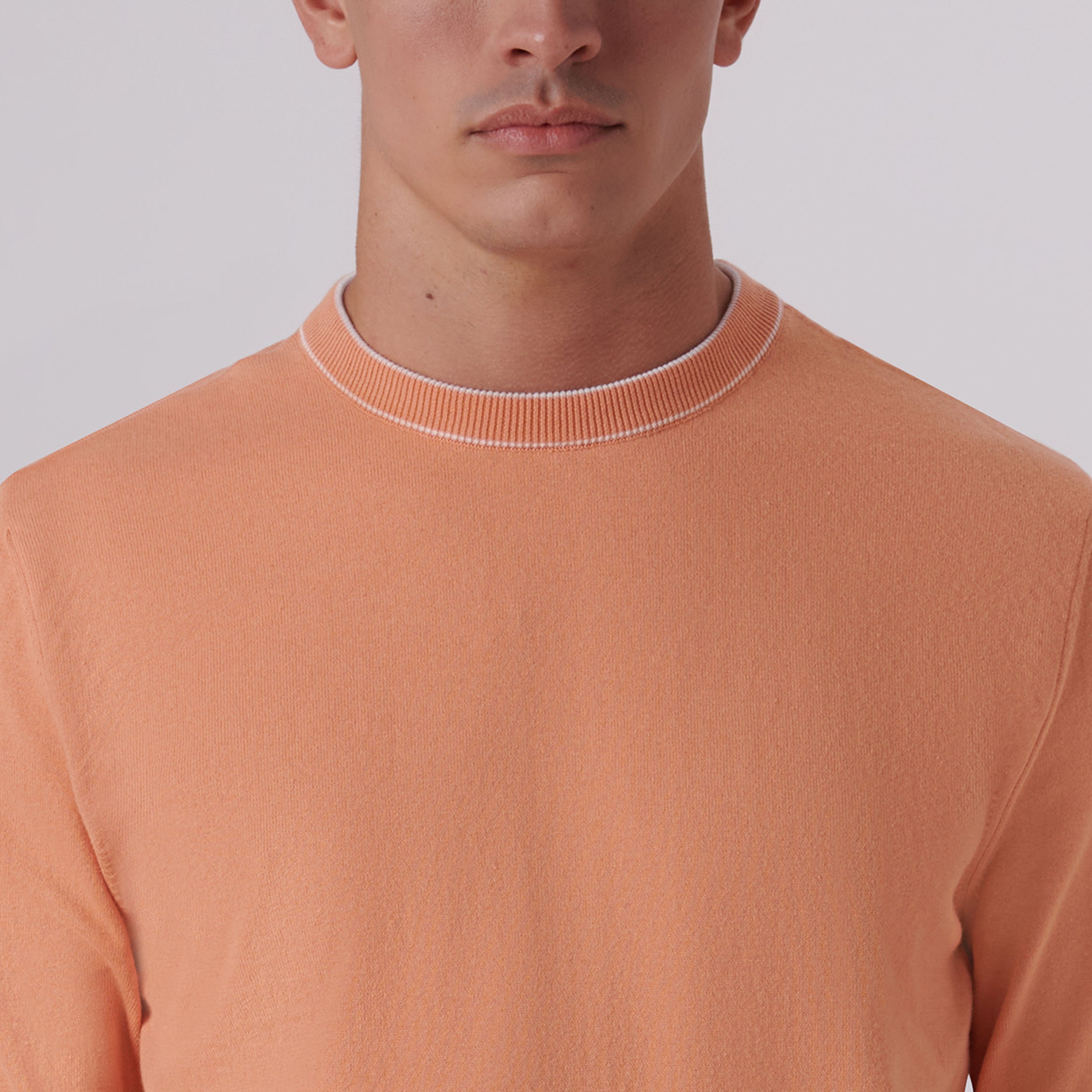 Solid long-sleeved crew neck sweater in cotton blend with contrast tipping detail and rib knit collar, cuffs and waistband.