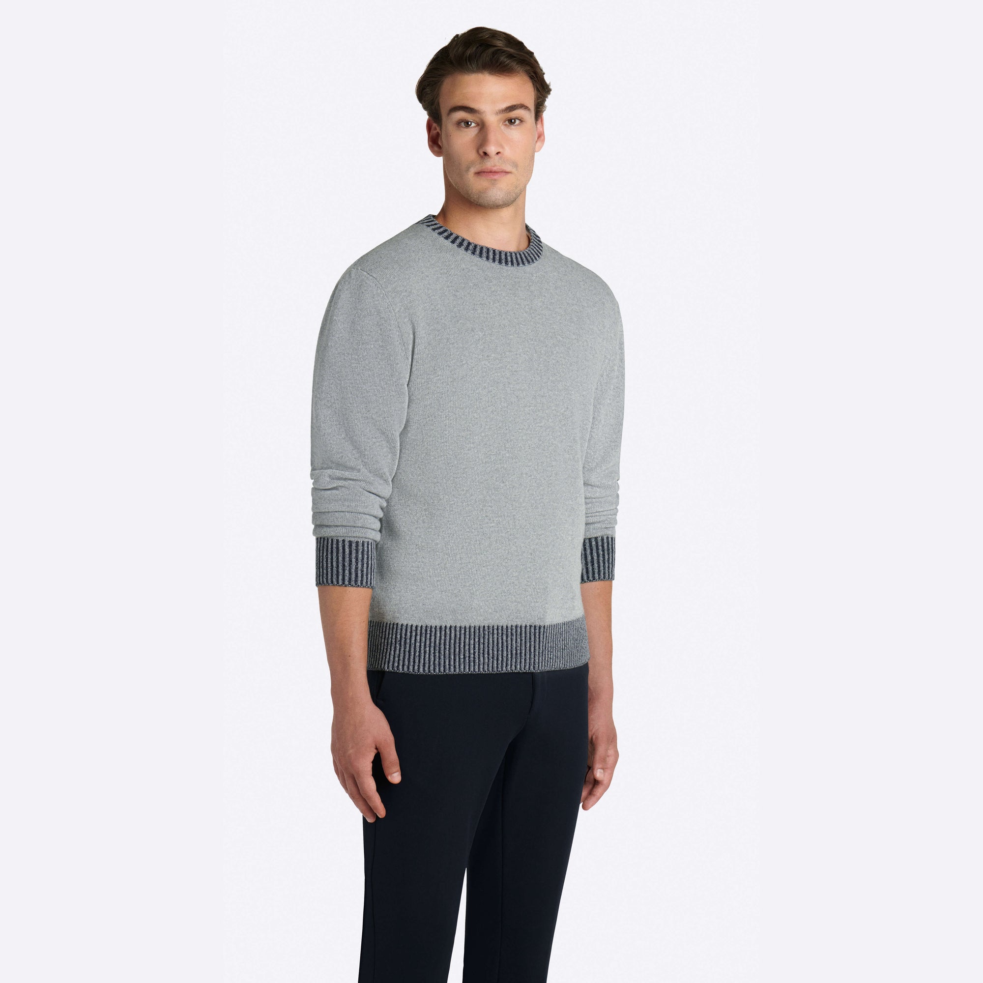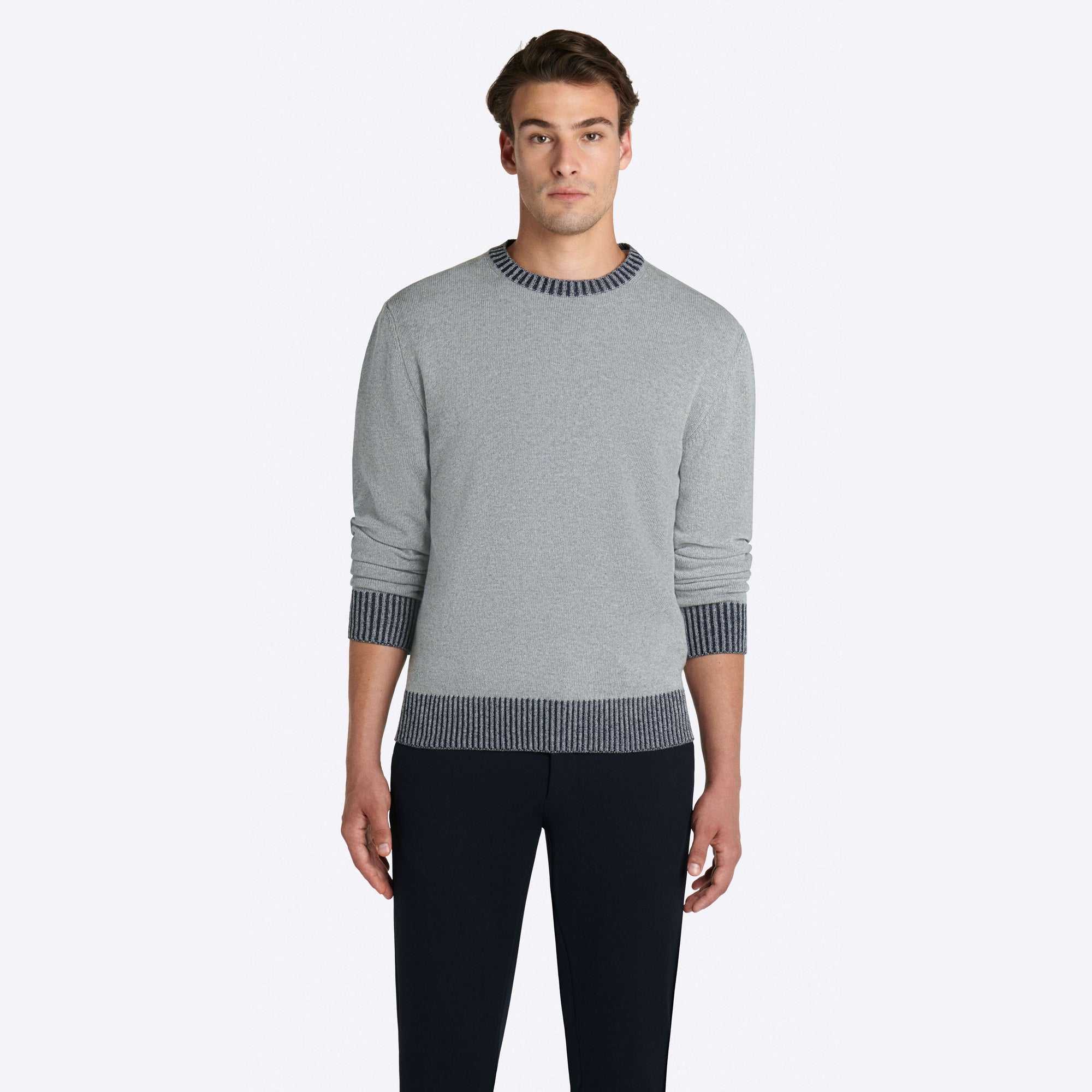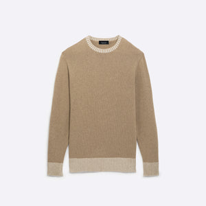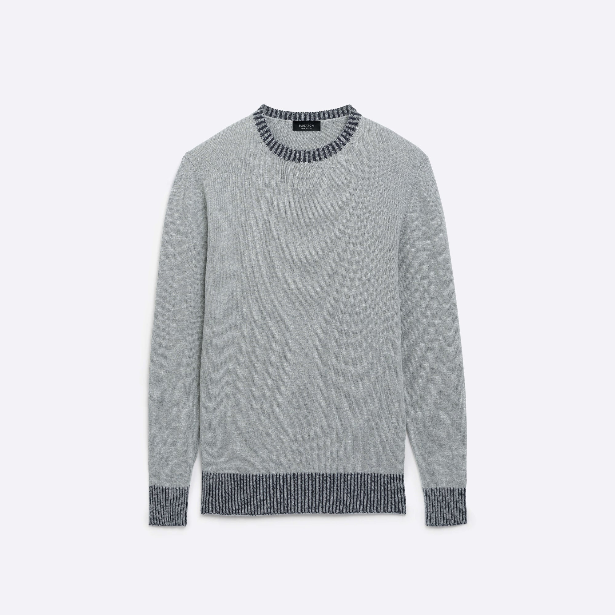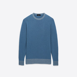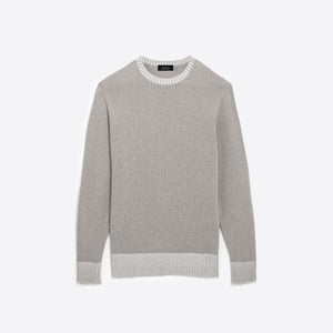 Solid long sleeve crew neck sweater in virgin wool blend with contrast rib knit collar, cuffs and waistband.