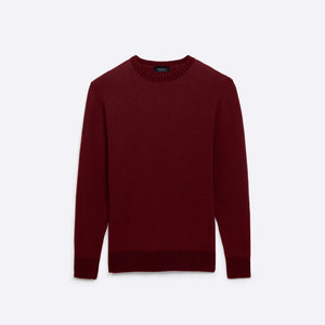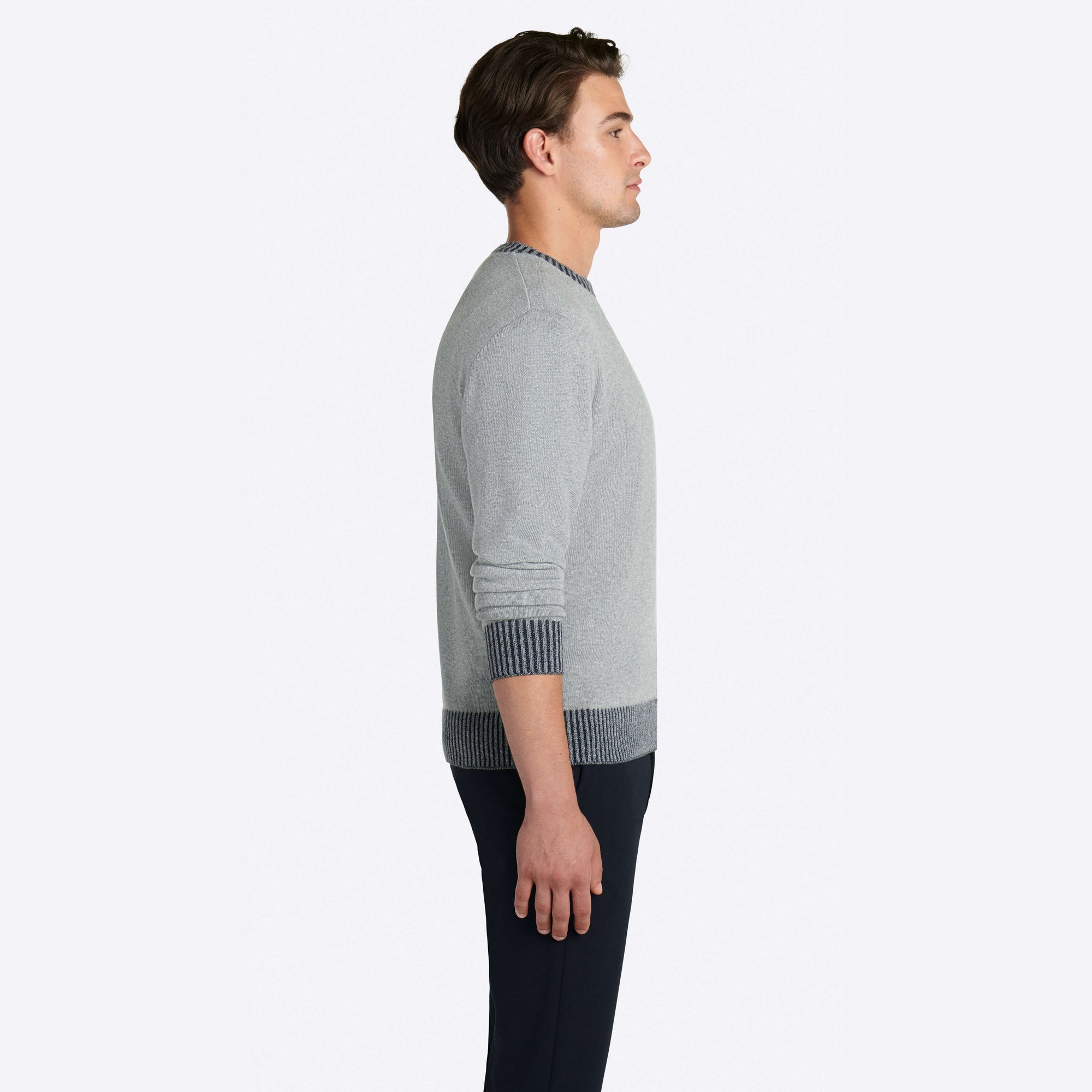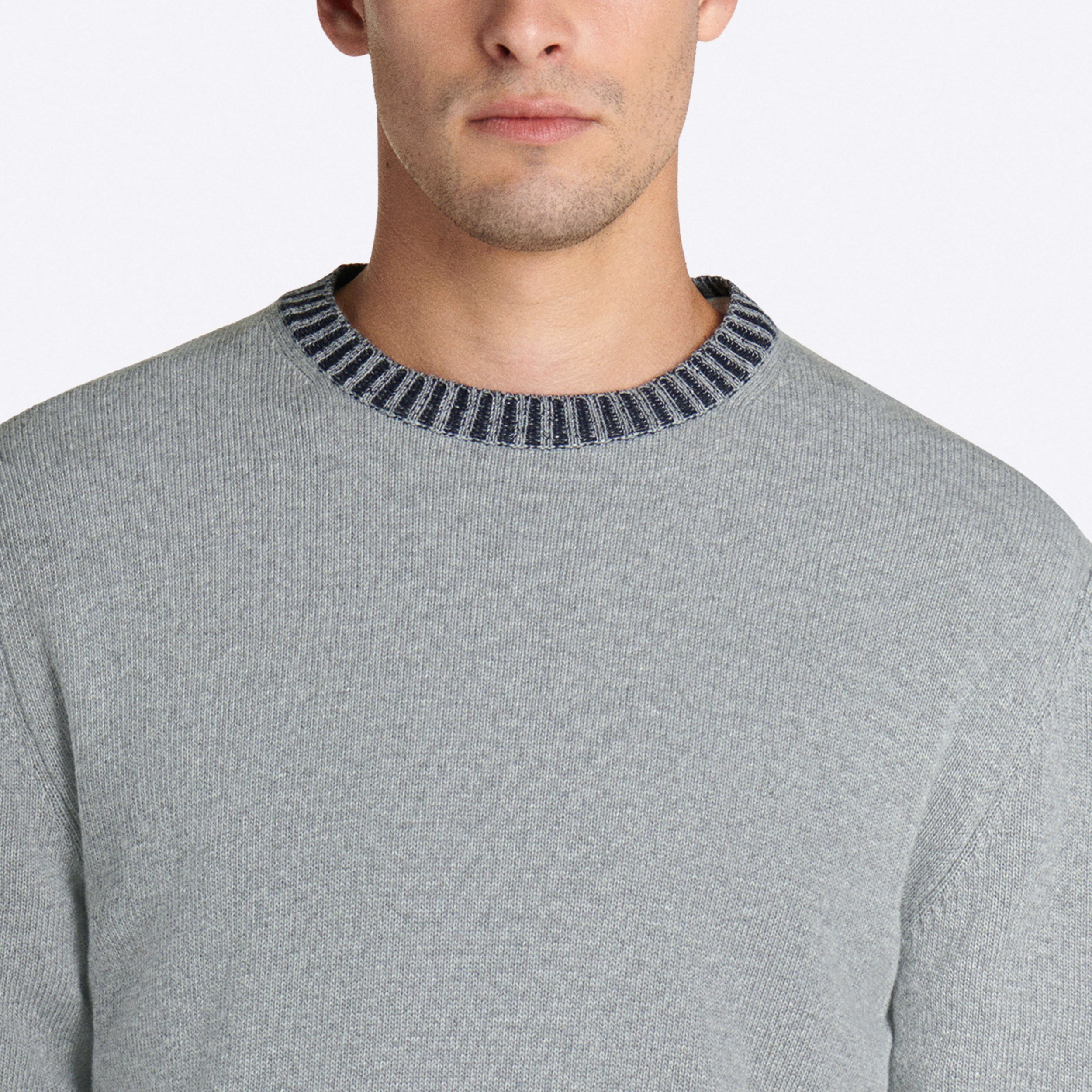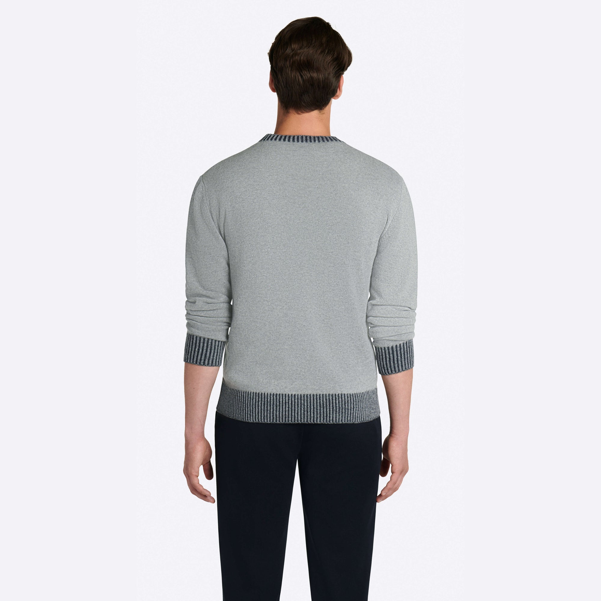 Solid long sleeve crew neck sweater in virgin wool blend with contrast rib knit collar, cuffs and waistband.