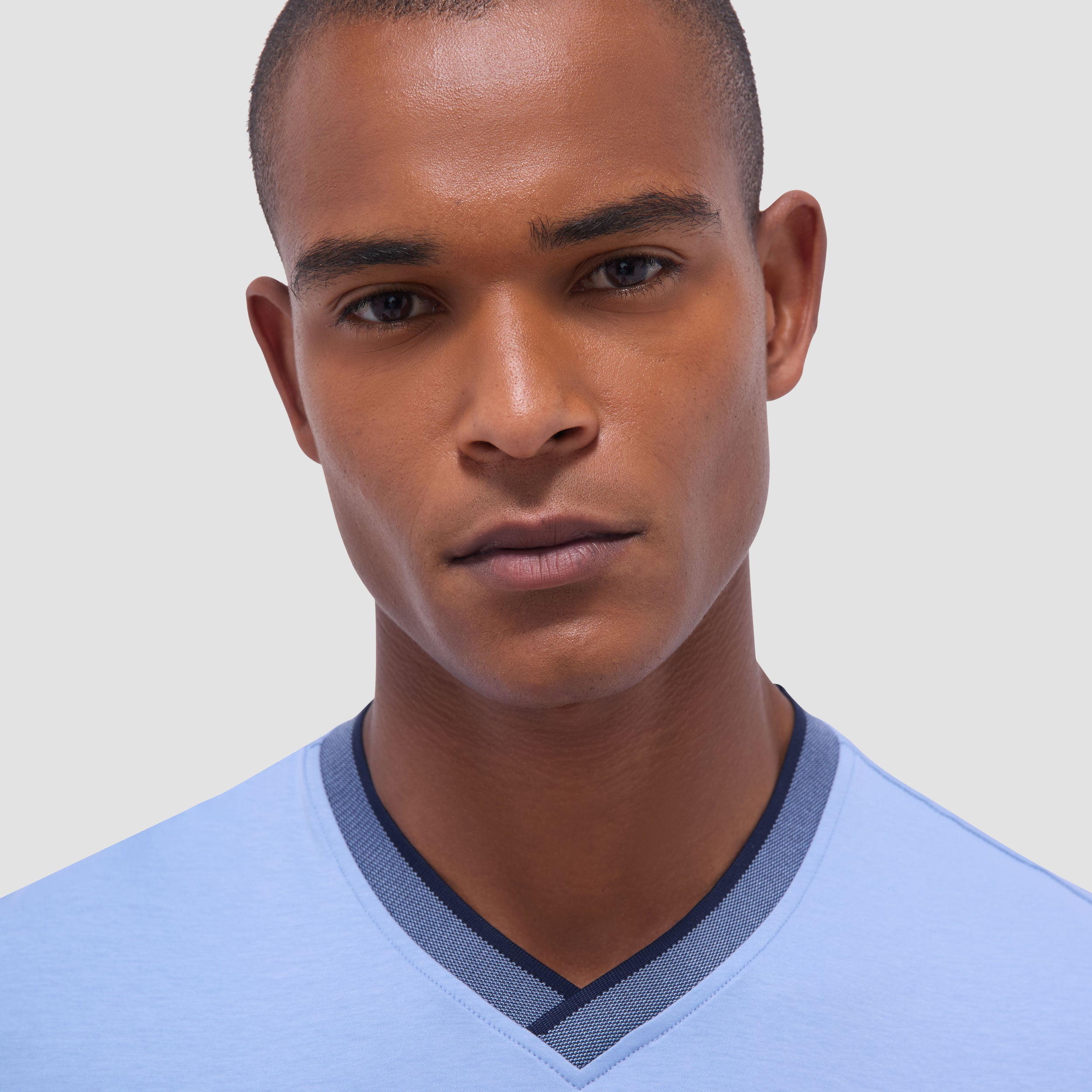 This solid short-sleeve T-shirt, made from 100% Pima cotton, offers ultimate softness and breathability. It features a contrast-tipped bird's eye rib V-neck and cuffs, adding a stylish, refined detail to the classic design. With its premium fabric and modern touches, this T-shirt is perfect for effortless everyday wear, combining comfort and sophistication in one versatile piece.