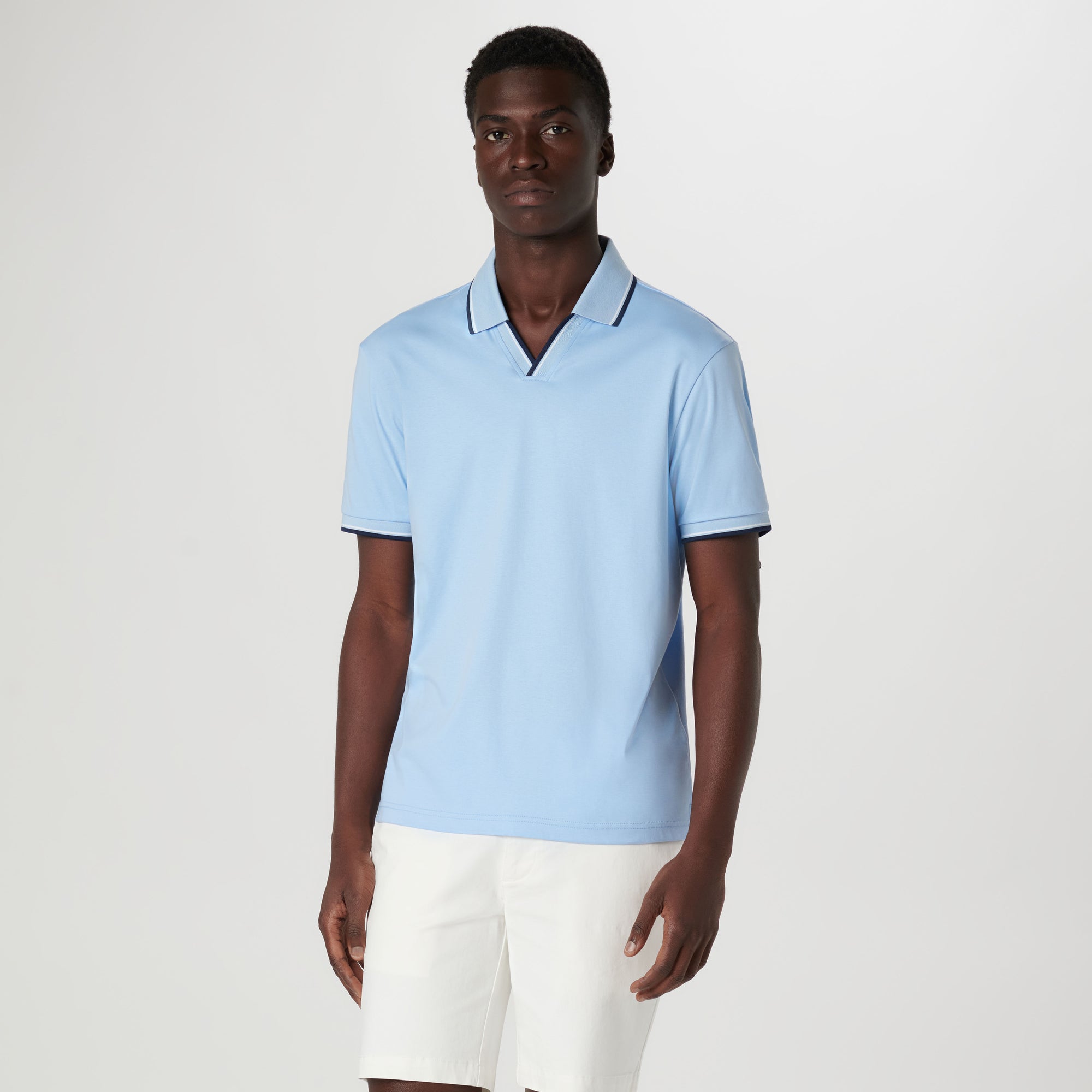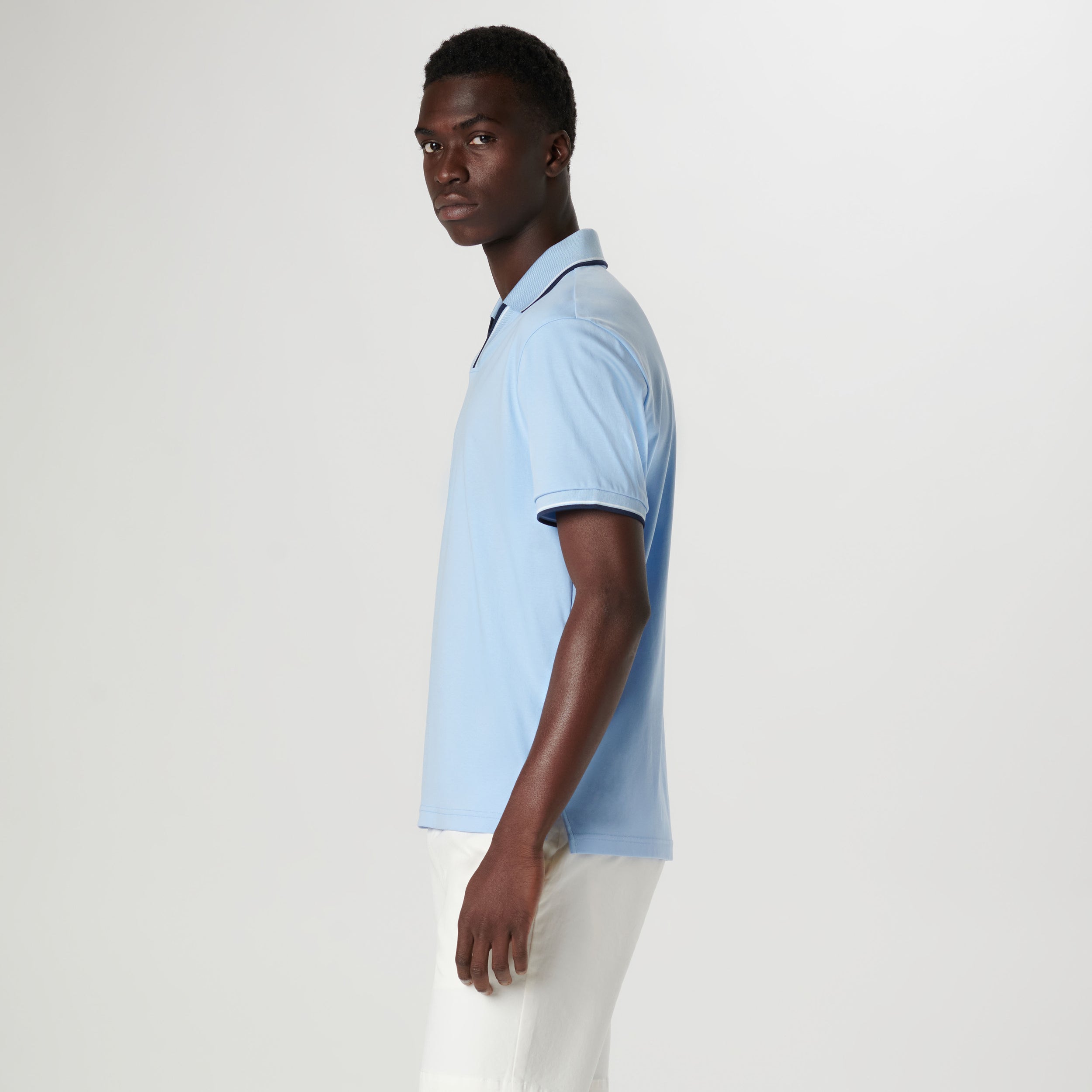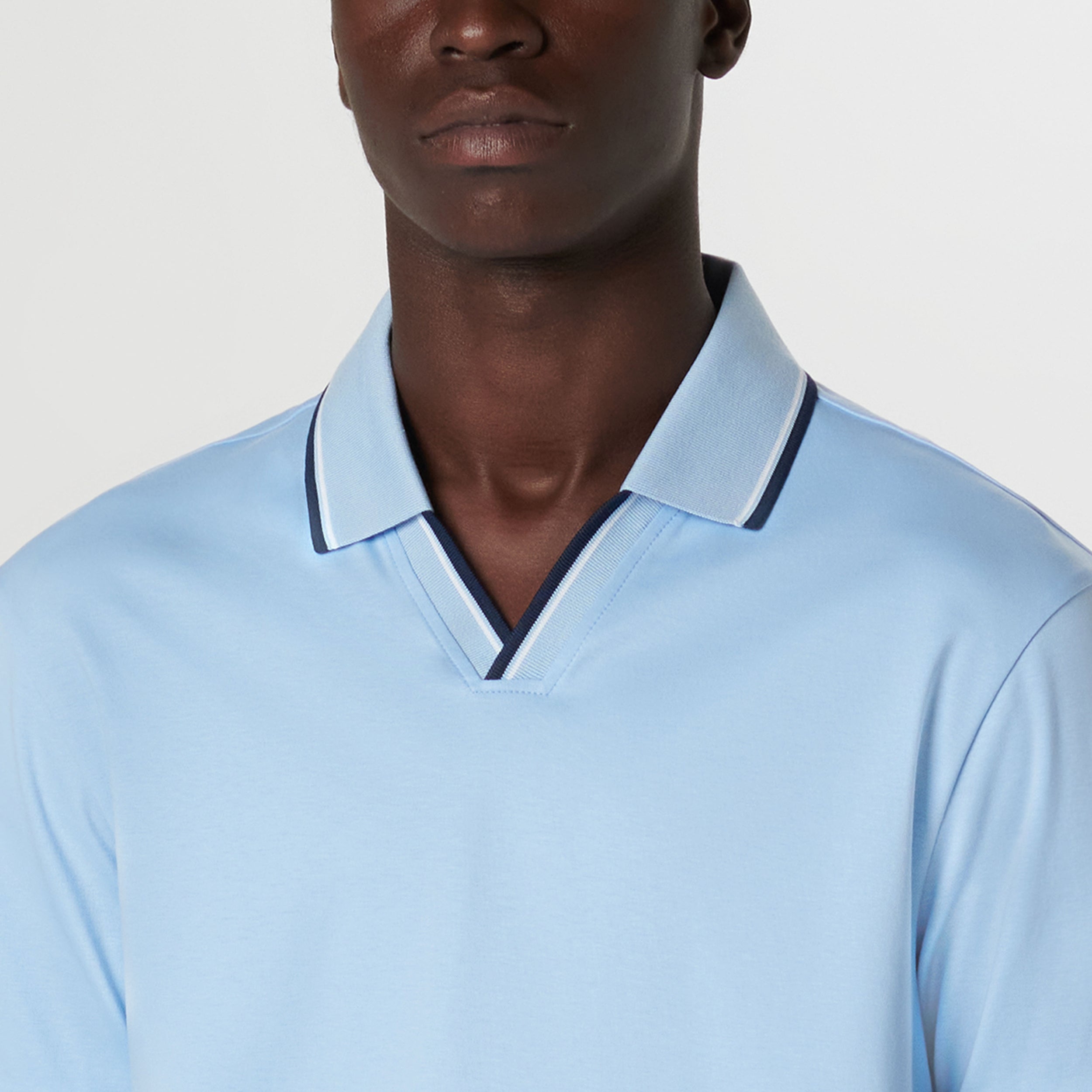 This short-sleeved polo shirt in 100% Pima cotton features rib knit Johnny collar and double contrast tipping detail. Pima cotton is known for its luxurious softness and durability and this shirt is the fusion of one the finest materials with thoughtful detailing.