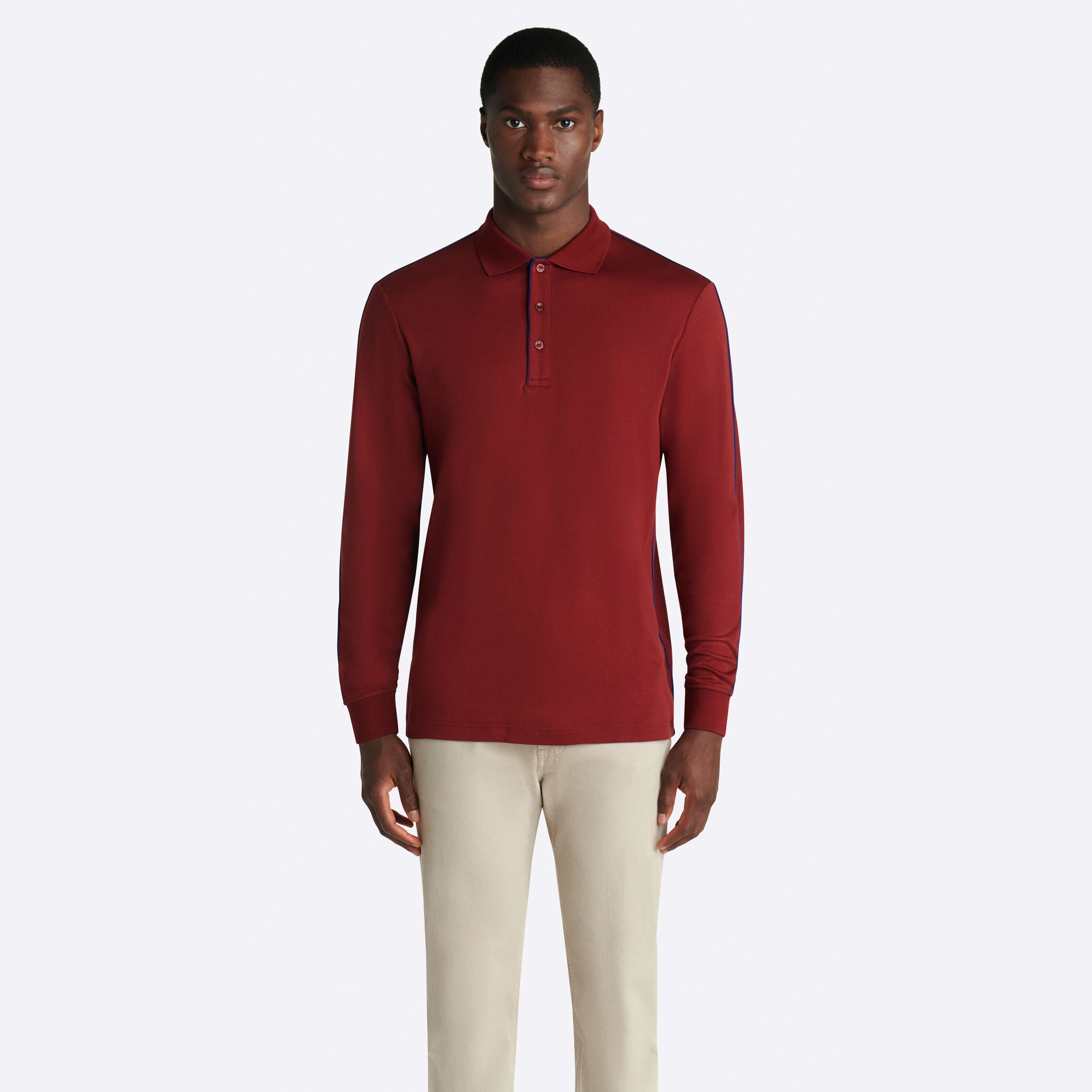 Long sleeve three button polo in 100% cotton with rib collar and cuffs, contrast inner placket and piping detail.