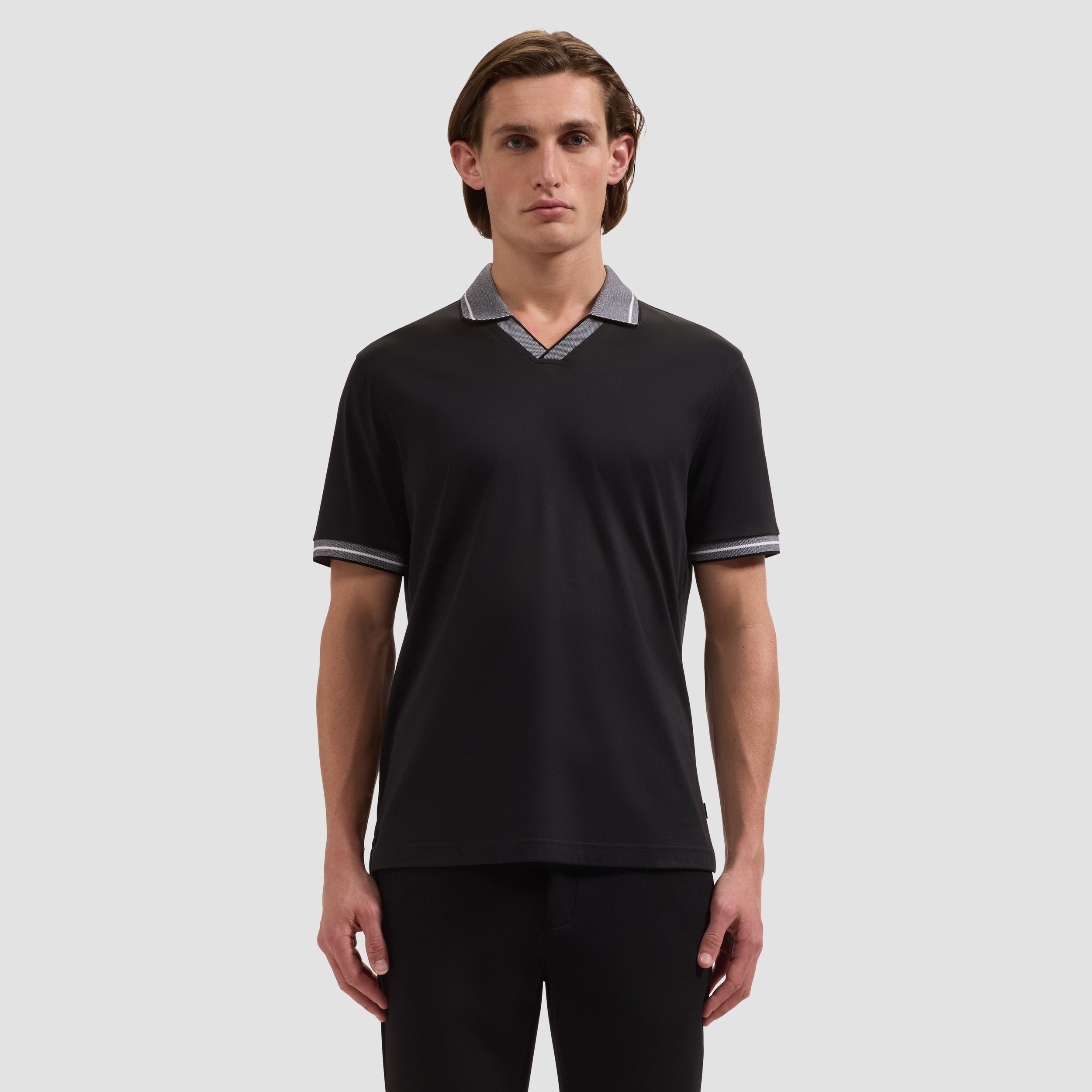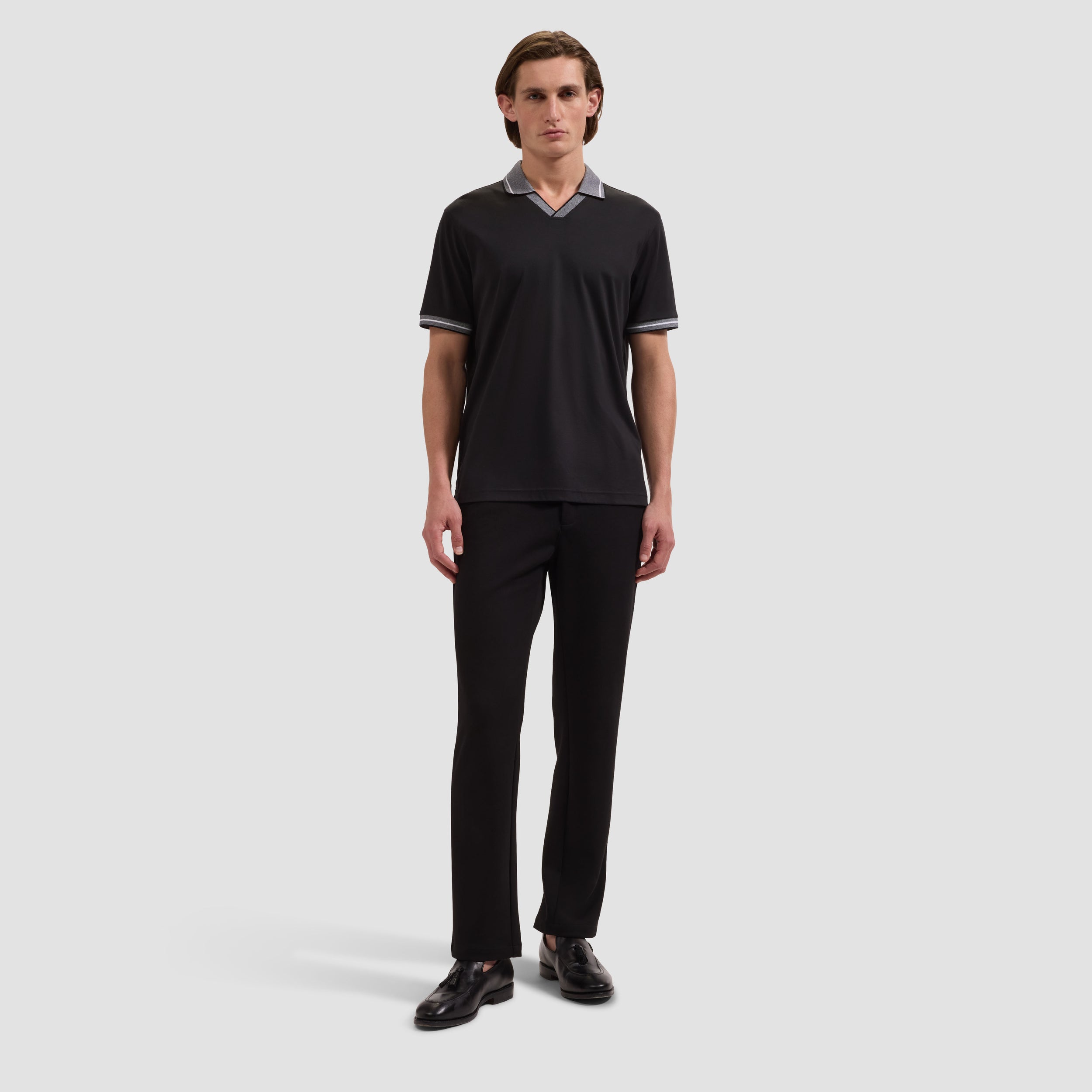 A sophisticated twist on a classic, this Johnny collar polo is crafted from 100% Pima cotton and detailed with a bird's eye rib collar, placket, and cuffs finished with double stripe tipping. Side vents ensure ease of movement, making it a versatile choice for polished casual occasions, relaxed resort wear, and both on and off the golf course.