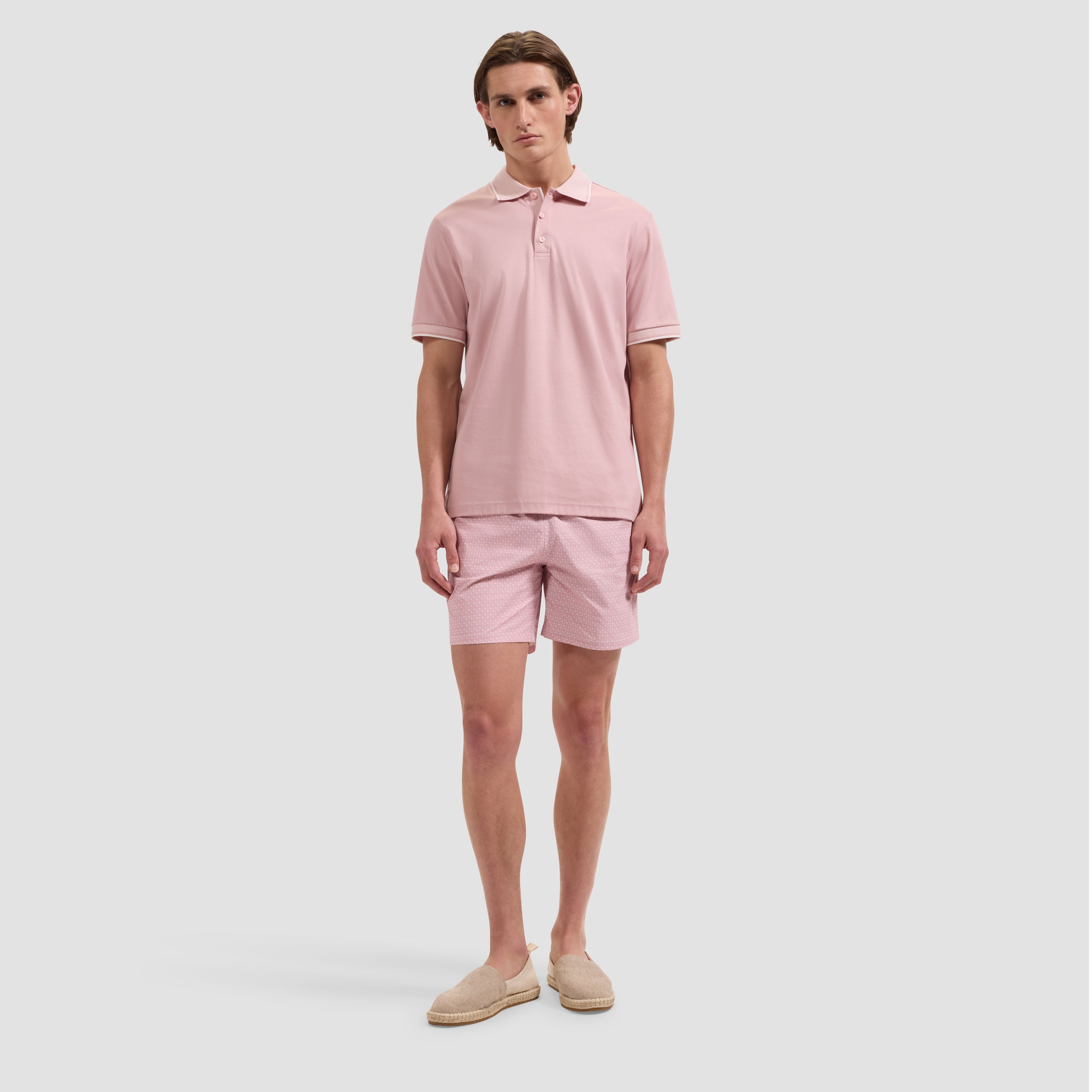 A refined essential crafted from 100% Pima cotton, this three-button polo is designed with a bird's eye rib collar, bottom placket and cuffs accented by subtle contrast tipping. Finished with genuine mother-of-pearl buttons and side vents for ease of movement, it blends timeless sophistication with everyday comfort — ideal for polished casual occasions, resort settings, and the golf course.