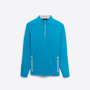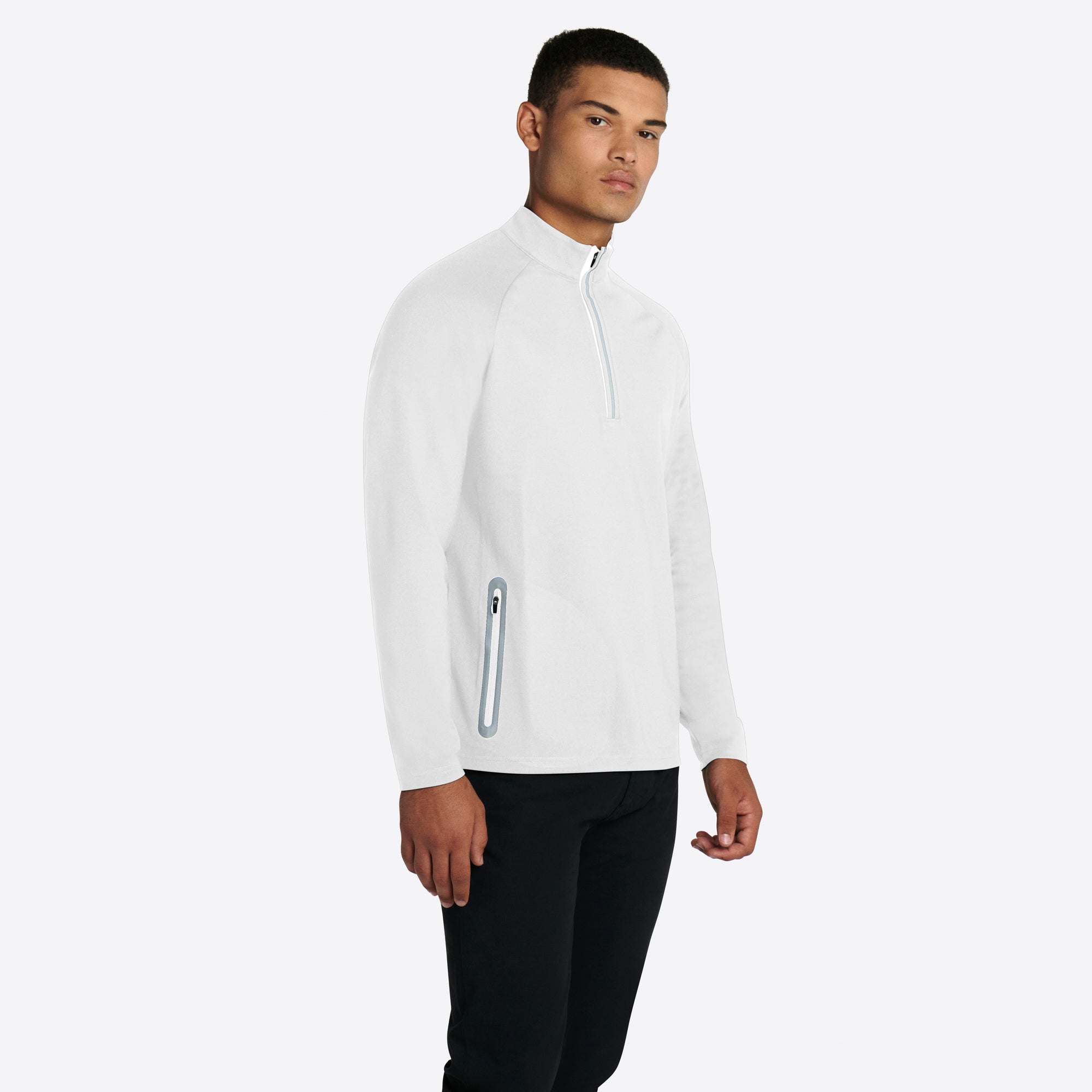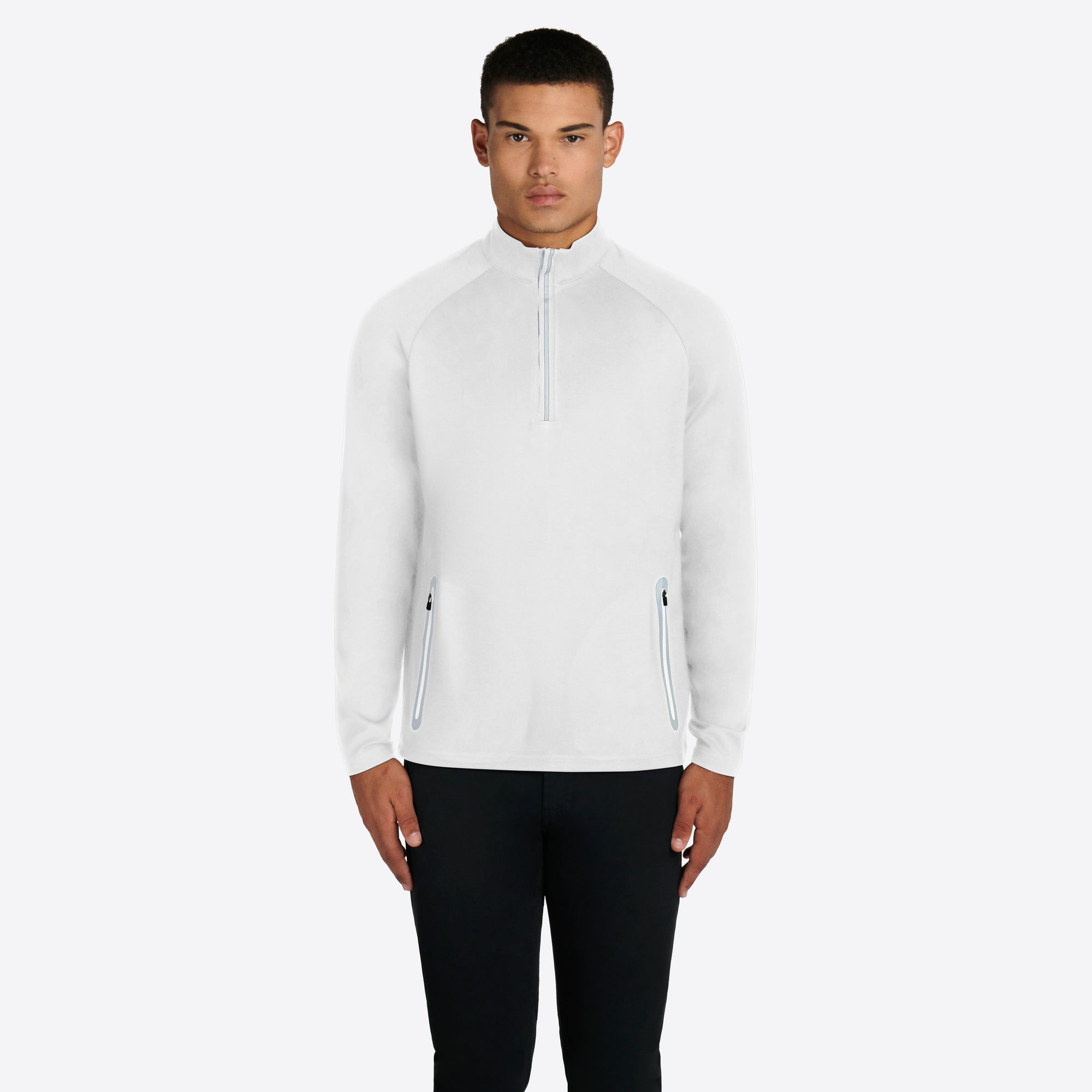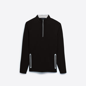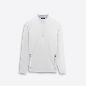 Solid performance quarter zip mock neck pullover with contrast trimmed zipper pockets.
